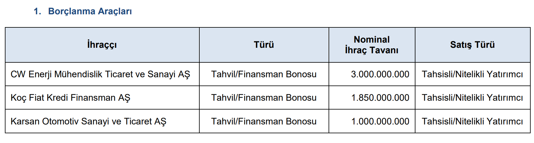 Sermaye Piyasası Kurulu (SPK), üç şirketin borçlanma aracı ihracı başvurusunu onayladığını duyurdu. SPK bültenine göre CW Enerji Mühendislik Ticaret ve Sanayi AŞ'nin 3 milyar lira, Koç Fiat Kredi Finansman AŞ'nin 1 milyar 850 milyon lira, Karsan Otomotiv Sanayi ve Ticaret AŞ'nin 1 milyar liralık tahvil ve finansman bonosu şeklindeki borçlanma aracı ihraç başvurusuna ve Emlak Varlık Kiralama AŞ'nin 100 milyon liralık eser sözleşmesine dayalı yeşil kira sertifikası ihraç başvurusuna onay verildi. Kaynak: SPK Bülteni 2025-26 Kurul, Argeus Gayrimenkul ve Girişim Sermayesi Portföy Yönetimi AŞ Gayrimenkul Şemsiye Fonunun, Han Varlık Gayrimenkul ve Girişim Sermayesi Portföy Yönetimi AŞ Girişim Sermayesi Şemsiye Fonunun ve Maxis Girişim Sermayesi Portföy Yönetimi AŞ Girişim Sermayesi Şemsiye Fonunun kuruluşuna izin verilmesi taleplerinin olumlu karşılanmasına karar verdi. SPK ayrıca, Arz Gayrimenkul ve Girişim Sermayesi Portföy Yönetimi AŞ Birinci Proje Gayrimenkul Yatırım Fonu, Hedef Portföy Yönetimi AŞ Artinvest Girişim Sermayesi Yatırım Fonu, Hedef Portföy Yönetimi AŞ Enerji Girişim Sermayesi Yatırım Fonu, Rota Portföy Yönetimi AŞ Dördüncü Gayrimenkul Yatırım Fonu ve Rota Portföy Yönetimi AŞ Beşinci Gayrimenkul Yatırım Fonunun kuruluşlarına izin verilmesi ve katılma paylarının ihracına ilişkin ihraç belgelerinin onaylanması taleplerini kabul etti. 7 kuruluşa 2,6 milyon TL idari para cezası Kurul, bilgi sistemleri bağımsız denetimi sonucunda tespit edilen mevzuata aykırılıkları tespit edilen 7 kuruluşa toplamda 2 milyon 644 bin 639 lira idari para cezası uygulanmasına karar verdi. Ayrıca SPK, Türkiye'de yerleşik kişilere yönelik olarak internet aracılığıyla yurt dışında kaldıraçlı işlem yaptırıldığı belirlenen 23 internet sitesine erişimin engellenmesi için Sermaye Piyasası Kanunu'nun 99. maddesinin dördüncü fıkrası uyarınca hukuki işlemlerin yapılması kararını aldı.