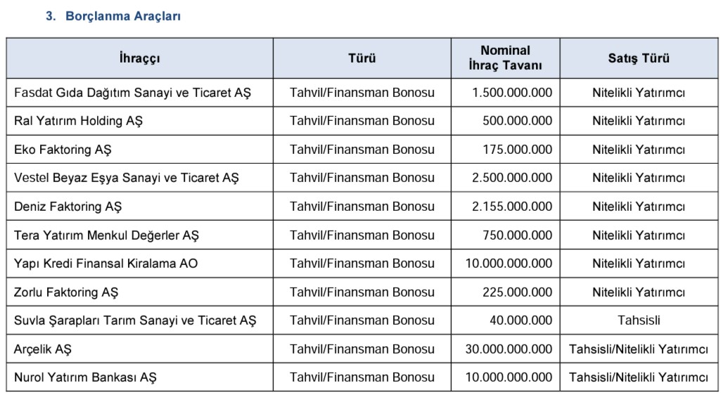Sermaye Piyasası Kurulu (SPK), üç şirketin daha ilk halka arz başvurusuna onay verdi. Sermaye Piyasası Kurulu, 2023 yılının 70. bültenini yayımladı. Buna göre Agrotech Yüksek Teknoloji, Ekos Teknoloji ve 1000 Yatırımlar Holding'in halka arzının onaylandığı duyuruldu. SPK haftalık bültenine göre Kurul, Agrotech'in 5,21 liradan, Ekos Teknoloji'nin 12,77 liradan, 1000 Yatırımlar Holding'in 125 liradan halka arz edilmesine onay verdi. [news_id:714306] Bültendeki diğer detaylar Öte yandan bültende Mia Teknoloji AŞ'nin 456 milyon liralık bedelsiz sermaye artırımı onaylandı. SPK, Fasdat Gıda Dağıtım Sanayi ve Ticaret AŞ'nin 1,5 milyar liralık, Ral Yatırım Holding AŞ'nin 500 milyon liralık, Eko Faktoring AŞ'nin 175 milyon liralık, Vestel Beyaz Eşya Sanayi ve Ticaret AŞ'nin 2,5 milyar liralık, Deniz Faktoring AŞ'nin 2 milyar 155 milyon liralık, Tera Yatırım Menkul Değerler'in 750 milyon liralık, Yapı Kredi Finansal Kiralama'nın 10 milyar liralık, Zorlu Faktoring'in 225 milyon liralık, Suvla Şarapları Tarım Sanayi ve Ticaret AŞ'nin 40 milyon liralık, Arçelik AŞ'nin 30 milyar liralık, Nurol Yatırım Bankası AŞ'nin ise 10 milyar liralık borçlanma aracı ihraç başvurusuna da izin verdi. Kaynak: SPK Bülteni – 2023/70 Pasha Yatırım Bankası AŞ'nin ise 500 milyon liralık kira sertifikası ve VİDMK ihracı başvurusu onaylandı. Kurul, Rota Portföy Yönetimi AŞ Katılım Şemsiye Fonu ile "Arz Gayrimenkul ve Girişim Sermayesi Portföy Yönetimi AŞ Sekizinci Gayrimenkul Yatırım Fonu", "Re-Pie Portföy Yönetimi AŞ Ayaz Gayrimenkul Yatırım Fonu" ve "Re-Pie Portföy Yönetimi AŞ Seyhan Gayrimenkul Yatırım Fonu"nun kurulması talebini de olumlu karşıladı. SPK, yapılan incelemeler sonucunda Kızılbük Gayrimenkul Yatırım Ortaklığı AŞ'ye 300 bin lira, Sinpaş Gayrimenkul Yatırım Ortaklığı AŞ'ye ise 155 bin 567 lira idari para cezası uyguladı. Kurul, farklı şirketlerin paylarında yaptığı inceleme sonucunda bir isme 1 milyon 409 bin 289 liralık idari para cezası uygulanmasına karar verdi. Suç duyuruları ve erişim engeli kararları Sermaye Piyasası Kurulu, Sermaye Piyasası Kanunu ve ilgili mevzuat kapsamında yapılan incelemeler sonucunda "join fx", "compaq fx", "royex markets fx", "kinginvests", "powertradefinance" ve "leveltrade" uzantılı internet sitelerinin içerik sağlayıcıları ile 3 isim hakkında suç duyurusu yapılmasına karar verdi. Türkiye'de yerleşik kişilere yönelik olarak internet aracılığıyla yurt dışında kaldıraçlı işlem yaptırıldığı belirlenen 35 internet sitesine erişimin engellenmesi için Sermaye Piyasası Kanunu'nun 99. maddesinin dördüncü fıkrası uyarınca hukuki işlemlerin yapılması kararı alındı. [news_id:713790]