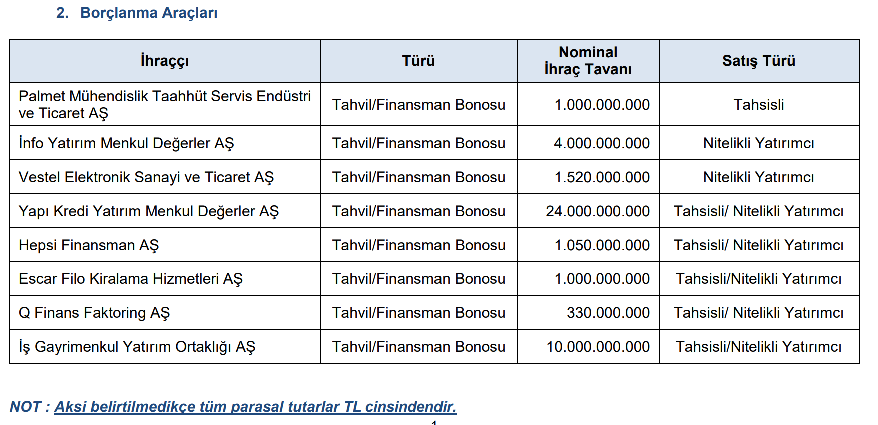Sermaye Piyasası Kurulu (SPK), 8 şirketin borçlanma aracı ihracı başvurusunu onayladı. SPK haftalık bültenine göre Kurul, Bayrak Ebt Taban Sanayi ve Ticaret AŞ'nin tahsisli sermaye artırımı başvurusunu, Sönmez Pamuklu Sanayii AŞ'nin 130 milyon bedelli ve 130 milyon bedelsiz olmak üzere 260 milyonluk sermaye artırımı başvurusunu, Çelik Halat ve Tel Sanayii AŞ'nin 198 milyon 966 bin 839 liralık bedelli sermaye artırımı başvurusunu ve Gedik Yatırım Menkul Değerler AŞ'nin 1 milyarlık bedelsiz sermaye artırımı başvurusunu onayladı. SPK ayrıca Palmet Mühendislik Taahhüt Servis Endüstri ve Ticaret AŞ'nin 1 milyar lira, İnfo Yatırım Menkul Değerler AŞ'nin 4 milyar lira, Vestel Elektronik Sanayi ve Ticaret AŞ'nin 1 milyar 520 milyon lira, Yapı Kredi Yatırım Menkul Değerler AŞ'nin 24 milyar lira, Hepsi Finansman AŞ'nin 1 milyar 50 milyon lira, Escar Filo Kiralama Hizmetleri AŞ'nin 1 milyar lira, Q Finans Faktoring AŞ'nin 330 milyon lira ve İş Gayrimenkul Yatırım Ortaklığı AŞ'nin 10 milyar lira tutarındaki borçlanma aracı ihracı başvurusuna onay verdi. Kaynak: SPK Bülteni Bir gerçek kişiye 18 milyon 505 bin 450 lira ve 2 tüzel kişiye 6 milyon 232 bin 540 lira idari para cezası verilmesine karar veren Kurul, 6 gerçek kişi ve 5 internet sitesi içerik sağlayıcısı hakkında suç duyurusunda bulunulmasını kararlaştırdı. Türkiye'de yerleşik kişilere yönelik olarak internet aracılığıyla yurt dışında kaldıraçlı işlem yaptırıldığı belirlenen 21 internet sitesine erişimin engellenmesi için Sermaye Piyasası Kanunu'nun 99. maddesinin dördüncü fıkrası uyarınca hukuki işlemlerin yapılması kararı verildi.
