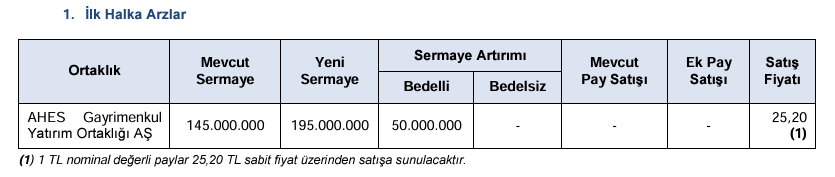 Sermaye Piyasası Kurulu (SPK), yayımladığı son bültende, AHES Gayrimenkul Yatırım Ortaklığı AŞ halka arzının onaylandığını duyurdu. SPK, 2024 yılının 39. bültenini yayımladı. Buna göre bültende Kurul, Ahes Gayrimenkul Yatırım Ortaklığı AŞ’nin halka arzının onaylandığını duyurdu. Ahes Gayrimenkul halka arzında 1 TL nominal değerli payların ise 25,20 TL sabit fiyat üzerinden satışa sunulacağı bildirildi. (Diğer halka arzlarla ilgili daha fazla bilgiye sahip olabilmek için Halka Arz sekmemizi takip edebilirsiniz.) Kaynak: SPK Bülteni 2024-39 Bültendeki diğer detaylar Sanifoam Endüstri ve Tüketim Ürünleri Sanayi Ticaret AŞ'nin 120 milyon liralık ve Sarkuysan Elektrolitik Bakır Sanayi ve Ticaret AŞ'nin 100 milyon liralık bedelsiz; Koray Gayrimenkul Yatırım Ortaklığı AŞ'nin tahsisli sermaye artırımı onaylandı. Akdeniz Faktoring AŞ'nin 300 milyon liralık, Marbaş Menkul Değerler AŞ'nin 850 milyon liralık, İnfo Yatırım Menkul Değerler AŞ'nin 2,5 milyar liralık, Timur Gayrimenkul Geliştirme Yapı ve Yatırım AŞ'nin 200 milyon liralık, ALJ Finansman AŞ'nin 620 milyon liralık, Halk Finansal Kiralama AŞ'nin 3 milyar liralık borçlanma aracı ihraç başvurusuna izin verildi. Kurul, Katılım Varlık Kiralama AŞ ile Türkiye Menkul Kıymetleştirme Şirketi Tera Bank Birinci Varlık Finansmanı Fonu'nun 5'er milyar liralık kira sertifikası ve VDMK ihracı başvurusuna onay verdi. Yeni faaliyet izinleri SPK, "Rota Portföy Yönetimi AŞ Narm Girişim Sermayesi Yatırım Fonu" ile "Tera Portföy Yönetimi AŞ BRKT Siber Güvenlik Girişim Sermayesi Yatırım Fonu"nun kuruluşuna izin verilmesi ve katılma paylarının ihracına ilişkin ihraç belgelerinin onaylanması taleplerini olumlu karşıladı. Titanyum Bağımsız Denetim Hizmetleri AŞ'nin ise "Sermaye Piyasasında Bağımsız Denetimle Yetkili Kuruluşlar Listesi"ne alınma talebinin olumlu karşılanmasına karar verildi. İdari para cezaları ve suç duyuruları SPK, Türkiye Garanti Bankası AŞ pay piyasasında gerçekleştirilen işlemlerin incelenmesi sonucunda bir isme 1,1 milyon liralık idari para cezası uyguladı. Vezin Bağımsız Denetim AŞ hakkında yapılan incelemede ise mevzuata aykırılıklar nedeniyle şirkete 155 bin 567 liralık idari para cezası uygulanması kararlaştırıldı. Kurul, 6362 sayılı kanun ve ilgili mevzuat kapsamında yapılan incelemeler sonucunda "moneytrade", "olivemarket", "gannmarkets" ve "priceboxfx" uzantılı internet sitelerinin içerik sağlayıcıları ile 10 gerçek kişi hakkında suç duyurusunda bulunulmasına hükmetti. Türkiye'de yerleşik kişilere yönelik olarak internet aracılığıyla yurt dışında kaldıraçlı işlem yaptırıldığı belirlenen 32 internet sitesine erişimin engellenmesi için Sermaye Piyasası Kanunu'nun 99. maddesinin dördüncü fıkrası uyarınca hukuki işlemlerin yapılması kararı alındı. [news_id:742550] [news_id:742819]