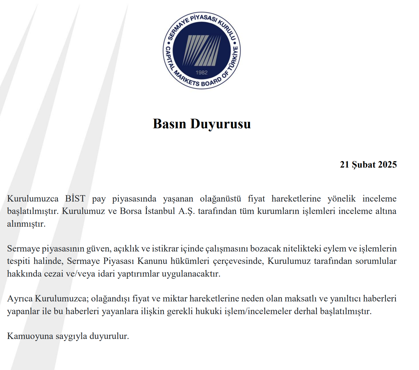 Sermaye Piyasası Kurulu (SPK), borsada yaşanan düşüşe ilişkin inceleme başlattığını duyurdu. Kuruldan yapılan açıklamada, Sermaye Piyasası Kurulu ve Borsa İstanbul A.Ş. tarafından tüm kurumların işlemlerinin inceleme altına alındığı belirtildi. SPK, sermaye piyasasının güven, açıklık ve istikrar içinde çalışmasını bozacak nitelikteki eylem ve işlemlerin tespiti halinde Sermaye Piyasası Kanunu hükümleri çerçevesinde, kurul tarafından sorumlular hakkında cezai ve/veya idari yaptırımlar uygulanacağını vurgulayarak, şunları kaydetti: "Kurulumuzca BİST pay piyasasında yaşanan olağanüstü fiyat hareketlerine yönelik inceleme başlatılmıştır. Kurulumuz ve Borsa İstanbul A.Ş. tarafından tüm kurumların işlemleri inceleme altına alınmıştır. Sermaye piyasasının güven, açıklık ve istikrar içinde çalışmasını bozacak nitelikteki eylem ve işlemlerin tespiti halinde, Sermaye Piyasası Kanunu hükümleri çerçevesinde, Kurulumuz tarafından sorumlular hakkında cezai ve/veya idari yaptırımlar uygulanacaktır. Ayrıca Kurulumuzca; olağandışı fiyat ve miktar hareketlerine neden olan maksatlı ve yanıltıcı haberleri yapanlar ile bu haberleri yayanlara ilişkin gerekli hukuki işlem/incelemeler derhal başlatılmıştır. Kamuoyuna saygıyla duyurulur." Kaynak: SPK