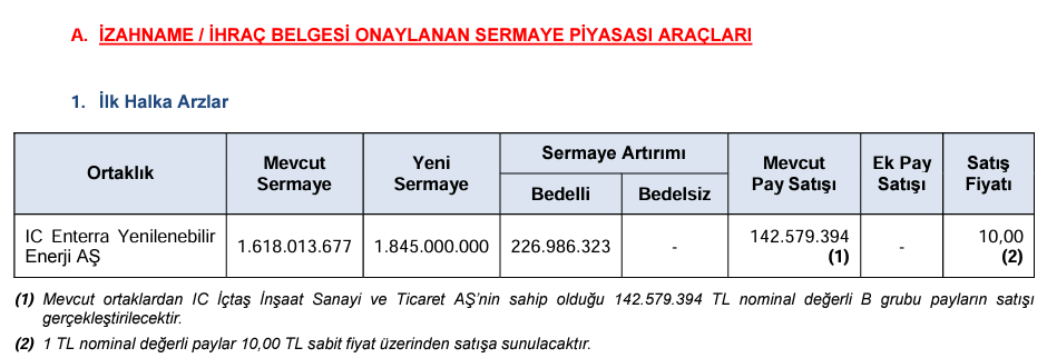 Sermaye Piyasası Kurulu (SPK), bir şirketin daha ilk halka arz başvurusuna onay verdi. Sermaye Piyasası Kurulu, 2024 yılının 16. bültenini yayımladı. Buna göre bültende Kurul, IC Enterra Yenilenebilir Enerji'nin halka arzının onaylandığını duyurdu. SPK haftalık bültenine göre, IC Enterra Yenilenebilir Enerji'nin mevcut ortaklardan IC İçtaş İnşaat Sanayi ve Ticaret AŞ’nin sahip olduğu 142.579.394 TL nominal değerli B grubu payların satışı gerçekleştirilecek. 1 TL nominal değerli paylar 10,00 TL sabit fiyat üzerinden satışa sunulacak. (Diğer halka arzlarla ilgili daha fazla bilgiye sahip olabilmek için Halka Arz sekmemizi takip edebilirsiniz.) Kaynak: SPK/Bülten No: 2024-16 Bültendeki diğer detaylar SPK bültenine göre Kurul, Vakıf Finansal Kiralama'nın 1 milyar lira tutarındaki bedelli sermaye artırımı başvurusunu, Pankent Sanayi ve Ticaret'in 27 milyon lira, Makim Makine Teknolojileri Sanayi ve Ticaret'in 56 milyon lira tutarındaki bedelsiz sermaye artırımı başvurusunu, Eko Faktoring'in 275 milyon lira, Türkiye İş Bankası'nın 5 milyar lira tutarındaki borçlanma aracı ihracı başvurusunu, Pasha Yatırım Bankası AŞ Hepsiburada Varlık Finansmanı Fonu'nun 2 milyar lira tutarındaki varlığa dayalı menkul kıymet ihracı başvurusunu onayladı. Ardventure Kitle Fonlama Platformu AŞ’nin paya dayalı kitle fonlaması faaliyetinde bulunmak üzere Kurul tarafından yetkilendirilen platformlar listesine alınma talebinin olumlu karşılanmasına karar veren SPK, Türkiye’de yerleşik kişilere yönelik olarak internet aracılığıyla yurt dışında kaldıraçlı işlem yaptırıldığı belirlenen 72 internet sitesine erişimin engellenmesi için hukuki işlemlerin uygulanmasını kararlaştırdı. Aracı kurum kurmak isteyenlere yeni şart SPK ayrıca aracı kurumların kuruluşunda uyulacak usul ve esasların belirlenmesine yönelik ilke kararı aldı. Bu kapsamda, kurulacak aracı kurumlar için gerekli asgari kuruluş öz sermayesi tutarının 300 milyon lira olarak belirlenmesine karar verildi. Ayrıca kurulacak aracı kurumların kuruluş izni verilmesine ilişkin 21 Mart 2024 olan Kurul Karar tarihini takip eden 2 yıl süreyle, mevzuattan kaynaklanan bir yükümlülük dolayısıyla oluşacak mücbir haller haricinde, belirlenen asgari kuruluş öz sermayesi tutarının altına düşülecek şekilde sermaye çıkışı sonucunu doğuracak herhangi bir işlem gerçekleştirilmemesi kararlaştırıldı. [news_id:727824]