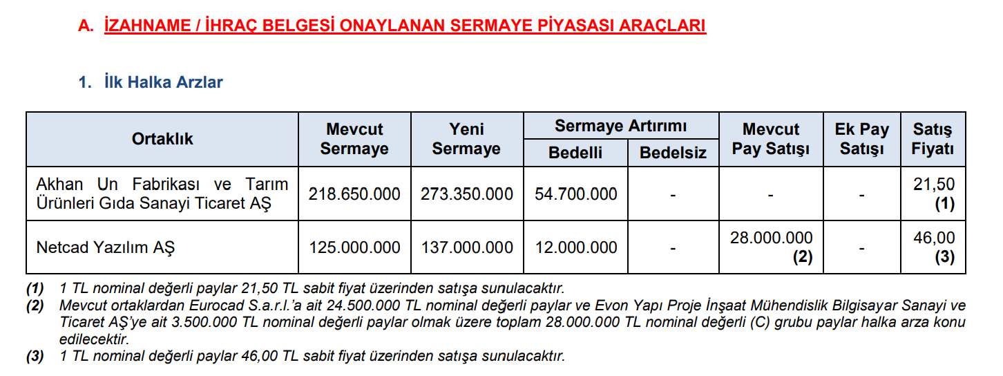 Sermaye Piyasası Kurulu, yayımladığı haftalık bültende Akhan Un Fabrikası ve Tarım Ürünleri ile Netcad Yazılım'ın halka arz taleplerinin onaylandığını duyurdu. SPK haftalık bültenine göre Kurul, Akhan Un Fabrikası ve Tarım Ürünleri Gıda Sanayi Ticaret AŞ’nin sermayesinin 218 milyon 650 bin liradan 273 milyon 350 bin liraya çıkarılması kapsamında 54 milyon 700 bin liralık bedelli sermaye artırımına izin verdi. Netcad Yazılım AŞ’nin ise sermayesinin 125 milyon liradan 137 milyon liraya yükseltilmesine karar verildi. Halka arz kapsamında, mevcut ortaklara ait toplam 28 milyon lira nominal değerli pay satışına onay verildi. Sermaye artırımları ve borçlanma aracı ihraçları Kurul aynı zamanda halka açık durumdaki ortaklıkların pay ihraçlarına yönelik çeşitli başvuruları da neticelendirdi.Bu doğrultuda Manas Enerji Yönetimi Sanayi ve Ticaret AŞ ile Frigo-Pak Gıda Maddeleri Sanayi ve Ticaret AŞ tarafından sunulan bedelli sermaye artırımı yoluyla pay ihracı talepleri onaydan geçti. Smart Güneş Enerjisi Teknolojileri Araştırma Geliştirme Üretim Sanayi ve Ticaret AŞ’nin iç kaynaklar kullanılarak gerçekleştirilmek istenen bedelsiz sermaye artırımı başvurusu da uygun görüldü. Borçlanma araçları tarafında ise Türkiye İş Bankası AŞ’nin 30 milyar lira tutarındaki yeşil ve sürdürülebilir tahvil ile finansman bonosu ihracına onay verilirken; Aygaz AŞ, Koç Finansman AŞ, PhillipCapital Menkul Değerler AŞ ve Metgün Enerji Yatırımları AŞ gibi pek çok kurumun tahvil ve bono ihraç talepleri kabul edildi. Fon kuruluşları ve yatırım düzenlemeleri Denetleyici kurum, Allianz Yaşam ve Emeklilik AŞ’nin hisse senedi emeklilik yatırım fonuna dair fon payı ihraç talebine onay sağladı. Bunun yanı sıra farklı portföy yönetim şirketlerince hayata geçirilmesi planlanan şemsiye fonlar ile girişim sermayesi yatırım fonlarının kuruluş süreçlerine yönelik talepler de kurul tarafından olumlu karşılandı. Diğer başvurular kapsamında Pasifik Gayrimenkul Yatırım Ortaklığı AŞ’nin tahsisli sermaye artırımı talebi, satış fiyatının belirlenen taban seviyenin altında kalmaması ve paylara bir sene boyunca borsa satış yasağı getirilmesi şartıyla onaylandı. BBCN Gayrimenkul Geliştirme AŞ’nin gayrimenkul yatırım ortaklığı yapısına dönüşümü kabul edilirken, çok sayıda yatırım fonunun katılma payı ihracı, dönüşümü ve tasfiyesine dair talepler de karara bağlandı. İdari yaptırımlar ve suç duyuruları Piyasa bozucu faaliyetlere karşı tedbir alan Kurul, Kuyaş Yatırım AŞ ve Beşiktaş Futbol Yatırımları Sanayi ve Ticaret AŞ hisselerinde işlem gerçekleştiren çok sayıda isme idari para cezası kesilmesine hükmetti. Bazı şirket paylarındaki işlemlerden sorumlu olan şahıslar hakkında Cumhuriyet başsavcılıklarına suç duyurusunda bulunulması kararlaştırıldı. Ceo Event Medya AŞ (CEOEM) piyasasındaki işlemler nedeniyle suç duyurusu yapılan bir kişinin, işlem yasağı boyunca tüm lisanslarının iptali yönünde karar verildi. Pera Gayrimenkul Yatırım Ortaklığı AŞ (PEGYO) paylarındaki işlemlerle bağlantılı iki kişi hakkında suç duyurusu yapıldı ve bu kişilerin de lisansları iptal edildi. Son olarak, Türkiye'de yerleşik bireylere internet üzerinden yurt dışı kaynaklı kaldıraçlı işlem yaptırdığı saptanan 12 internet sitesine erişimin engellenmesi kararı alındı.