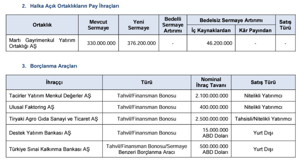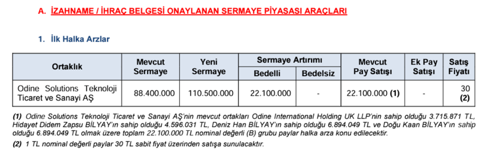 Sermaye Piyasası Kurulu (SPK), bir şirketin daha ilk halka arz başvurusuna onay verdi. Sermaye Piyasası Kurulu, 2024 yılının 14. bültenini yayımladı. Buna göre bültende Kurul, Odine Solutions Teknoloji Ticaret ve Sanayi AŞ halka arzının onaylandığını duyurdu. SPK haftalık bültenine göre Odine Solutions Teknoloji Ticaret ve Sanayi AŞ'nin mevcut ortakları Odine International Holding UK LLP’nin sahip olduğu 3.715.871 TL, Hidayet Didem Zapsu BİLYAY’ın sahip olduğu 4.596.031 TL, Deniz Han BİLYAY’ın sahip olduğu 6.894.049 TL ve Doğu Kaan BİLYAY’ın sahip olduğu 6.894.049 TL olmak üzere toplam 22.100.000 TL nominal değerli (B) grubu paylar 30 TL sabit fiyat üzerinden satışa sunulacak. (Diğer halka arzlarla ilgili daha fazla bilgiye sahip olabilmek için Halka Arz sekmemizi takip edebilirsiniz.) Kaynak: SPK/Bülten No: 2024-14 Bültendeki diğer detaylar Kurul, Martı Gayrimenkul Yatırım Ortaklığı AŞ'nin 46 milyon 200 bin liralık bedelsiz sermaye artırımını onayladı. Ayrıca, Tacirler Yatırım Menkul Değerler AŞ'nin 2 milyar 100 milyon lira, Ulusal Faktoring AŞ'nin 400 milyon lira, Tiryaki Agro Gıda Sanayi ve Ticaret AŞ'nin 2 milyar 500 milyon lira, Destek Yatırım Bankası AŞ'nin 15 milyon dolar ve Türkiye Sınai Kalkınma Bankası AŞ'nin 500 milyon dolarlık borçlanma aracı ihraç başvurusuna izin verildi. Kaynak: SPK/Bülten No: 2024-14 Borçlanma aracı ihraç başvurusuna izin verilen şirketler arasında 700 milyon lirayla Değer Varlık Kiralama AŞ'de yer aldı. 24 Gayrimenkul ve Girişim Sermayesi Portföy Yönetimi AŞ Orkide Gayrimenkul Yatırım Fonu, 24 Gayrimenkul ve Girişim Sermayesi Portföy Yönetimi AŞ Zambak Gayrimenkul Yatırım Fonu, Atlas Portföy Yönetimi AŞ Birinci Gayrimenkul Yatırım Fonu, Azimut Portföy Yönetimi AŞ Tatil Sepeti 2 Girişim Sermayesi Yatırım Fonu, Inveo Portföy Yönetimi AŞ Birinci Gayrimenkul Yatırım Fonu ve İstanbul Portföy Yönetimi AŞ XCapital Girişim Sermayesi Yatırım Fonu'na faaliyet izni verildi. Kaynak: SPK/Bülten No: 2024-14 İdari para cezaları ve erişim engeli kararları Kurul, Martı Gayrimenkul Yatırım Ortaklığı AŞ pay piyasasında yapılan inceleme sonucunda, Rasim Şahinkaya ve Oğuzhan Şahinkaya'ya 69 bin 783 lira idari para cezası verdi. Mega Polietilen Köpük Sanayi ve Ticaret AŞ payında gerçekleştirilen işlemler ile ilgili olarak yapılan inceleme sonucunda, Tera Yatırım Menkul Değerler AŞ'ye 155 bin 567 lira, İnfo Yatırım Menkul Değerler AŞ'ye 466 bin 701 lira, Eyüp Serdar Erçelik'e 155 bin 567 lira, Ertuğrul Erdoğan ve Tolun Kudaloğlu'na 311 bin 134 lira idari para cezası uygulanması kararı alındı. Midas Menkul Değerler AŞ nezdinde yapılan incelemeler sonucunda, şirkete 27 milyon 778 bin 312 lira idari para cezası uygulanması kararlaştırıldı. Türkiye'de yerleşik kişilere yönelik olarak internet aracılığıyla yurt dışında kaldıraçlı işlem yaptırıldığı belirlenen 37 internet sitesine erişimin engellenmesi için Sermaye Piyasası Kanunu'nun 99. maddesinin dördüncü fıkrası uyarınca hukuki işlemlerin yapılması kararı alındı. [news_id:726745]
