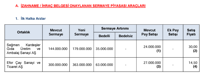 Sermaye Piyasası Kurulu (SPK), Seğmen Kardeşler Gıda Üretim ve Ambalaj Sanayi AŞ ile Efor Çay Sanayi ve Ticaret AŞ’nin ilk halka arzını onayladı. Sermaye Piyasası Kurulu, 2024 yılının 29. bültenini yayımladı. Buna göre bültende Kurul, Seğmen Kardeşler Gıda Üretim ve Ambalaj Sanayi AŞ ile Efor Çay Sanayi ve Ticaret AŞ’nin ilk halka arzına onay verdi. Seğmen Kardeşler halka arzında, mevcut ortaklardan Reyhan MOLLAOĞLU'na ait 2.000.000 TL nominal değerli, Yusuf SEĞMEN'e ait 2.000.000 TL nominal değerli, Emine SEĞMEN'e ait 2.000.000 TL nominal değerli, Oya YENER'e ait 2.000.000 TL nominal değerli, Meral YILDIRIM'a ait 2.000.000 TL nominal değerli, Neval ELALDIRSIN'a ait 2.000.000 TL nominal değerli, Nihal ÖZCANLI’ya ait 2.000.000 TL nominal değerli, Ömer SEĞMEN'e ait 2.000.000 TL nominal değerli, Gülsen SEĞMEN'e ait 2.000.000 TL nominal değerli, Birsen YAKA'ya ait 2.000.000 TL nominal değerli, Beyhan DEĞERLİ'ye ait 2.000.000 TL nominal değerli ve Ayhan SEĞMEN'e ait 2.000.000 TL nominal değerli payların satışı gerçekleştirilecek. 1 TL nominal değerli paylar 30,00 TL sabit fiyat üzerinden satışa sunulacak. Efor Çay halka arzında ise mevcut ortak İbrahim AKKUŞ’a ait 27.000.000 TL nominal değerli paylar halka arz edilecek. 1 TL nominal değerli paylar 14,50 TL sabit fiyat üzerinden satışa sunulacak. Kaynak: SPK/Bülten No: 2024-29 Bültendeki diğer detaylar Çan2 Termik AŞ'nin 7 milyon lira tutarındaki bedelsiz pay ihracına onay veren Kurul, Turkrent Operasyonel Kiralama AŞ'nin 250 milyon lira, Q Yatırım Bankası AŞ'nin 500 milyon lira, Tv8 Tv Yayıncılık AŞ'nin 600 milyon lira ve Destek Yatırım Bankası AŞ'nin 250 milyon lira tutarındaki borçlanma aracı ihracı başvurularına onay verdi. Ayrıca, Aktif Bank Sukuk Varlık Kiralama AŞ'nin 650 milyon lira ve Emlak Varlık Kiralama AŞ'nin 500 milyon liralık yönetim sözleşmesine dayalı kira sertifikası ihracı onaylandı. Kurul, RE-PIE Portföy Yönetimi AŞ Larinda Smart Energy Technology Girişim Sermayesi Yatırım Fonu, Ziraat Portföy Yönetimi AŞ Plan S Uydu ve Uzay Teknolojileri Girişim Sermayesi Yatırım Fonu, Tera Portföy Yönetimi AŞ Hisse Senedi Şemsiye Fonu, Tera Portföy Yönetimi AŞ Değişken Şemsiye Fonu ve Tera Portföy Yönetimi AŞ Borçlanma Araçları Şemsiye Fonunun kuruluşuna izin verilmesi ve katılma paylarının ihracına ilişkin ihraç belgesinin onaylanması talebini olumlu karşıladı. Sanifoam Endüstri ve Tüketim Ürünleri Sanayi Ticaret AŞ (SANFM) pay piyasasında gerçekleştirilen işlemler ile ilgili olarak yapılan inceleme sonucunda 5 kişiye, toplam 4 milyon 539 bin 920 lira idari para cezası uygulanmasına hükmeden Kurul, Türkiye'de yerleşik kişilere yönelik olarak internet aracılığıyla yurt dışında kaldıraçlı işlem yaptırıldığı belirlenen 21 internet sitesine erişimin engellenmesi için gerekli hukuki işlemlerin yapılmasını kararlaştırdı. [news_id:736840]