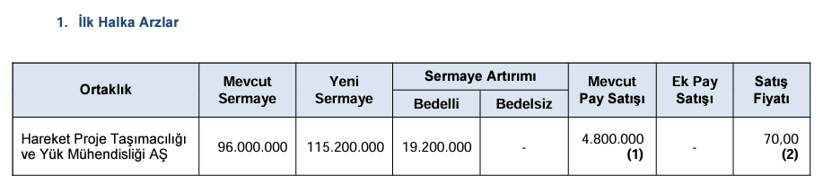 Sermaye Piyasası Kurulu (SPK), Hareket Proje Taşımacılığı ve Yük Mühendisliği AŞ’nin ilk halka arzına onay verdi. Sermaye Piyasası Kurulu, 2024 yılının 24. bültenini yayımladı. Buna göre bültende Kurul, Hareket Proje Taşımacılığı halka arzının onaylandığını duyurdu. Hareket Proje Taşımacılığı halka arzında mevcut ortaklardan Ahmet Altunkum’un sahip olduğu 3.168.000 TL nominal değerli, Abdullah Altunkum’un sahip olduğu 672.000 TL nominal değerli, Samet Gürsu’nun sahip olduğu 480.000 TL nominal değerli, Cemalettin Gürsu’nun sahip olduğu 240.000 TL nominal değerli, Seddar Sacid Gürsu’nun sahip olduğu 144.000 TL nominal değerli ve Sena Gürsu’nun sahip olduğu 96.000 TL nominal değerli olmak üzere toplam 4.800.000 TL nominal değerli (C) grubu pay halka arz edilecek. 1 TL nominal değerli paylar 70 TL sabit fiyat üzerinden satışa sunulacak. (Diğer halka arzlarla ilgili daha fazla bilgiye sahip olabilmek için Halka Arz sekmemizi takip edebilirsiniz.) Kaynak: SPK/Bülten No: 2024-24 Bültendeki diğer detaylar SPK bültenine göre, Kurul, Garanti Faktoring AŞ'nin 318 milyon liralık bedelsiz sermaye artırımı başvurusunu, Lider Faktoring AŞ'nin 135 milyon lira, Creditwest Faktoring AŞ'nin 60 milyon lira, Deniz Finansal Kiralama AŞ'nin 775 milyon lira, ING Bank AŞ'nin 250 milyon dolar ve Ülker Bisküvi Sanayi AŞ'nin 550 milyon dolar tutarındaki borçlanma aracı ihraç başvurusunu onayladı. SPK, Türkiye'de yerleşik kişilere yönelik olarak internet aracılığıyla yurt dışında kaldıraçlı işlem yaptırıldığı belirlenen 25 internet sitesine erişimin engellenmesi için gerekli hukuki işlemlerin yapılmasına karar verdi. Öte yandan Logos Portföy Yönetimi AŞ’nin 7,5 milyon lira olan çıkarılmış sermayesinin 32 milyon liraya artırılmasına izin verilmesi talebini olumlu karşılandı. [news_id:732787]