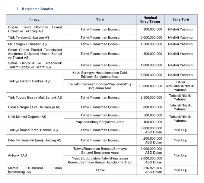 Sermaye Piyasası Kurulu (SPK), Simit Sarayı ürünlerinin üreticisi DMR Unlu Mamuller Üretim Gıda Toptan Perakende İhracatın ilk halka arzına onay verdi. SPK haftalık bültenine göre kurul, DMR Unlu Mamuller Üretim Gıda Toptan Perakende İhracatın pay başına 10,24 liradan ilk halka arzına; Sanko Pazarlama İthalat İhracatın 45 milyon lira, Halk Gayrimenkul Yatırım Ortaklığının 75 milyon lira, Vakıf Gayrimenkul Yatırım Ortaklığının 1 milyar 232 milyon 500 bin lira tutarındaki bedelsiz sermaye artırımı başvurusuna onay verdi. SPK ayrıca Doğan Trend Otomotiv Ticaret Hizmet ve Teknolojinin 900 milyon lira, Türk Telekomun 5 milyar lira, MLP Sağlık Hizmetlerinin 1,5 milyar lira, Smart Güneş Enerjisi Teknolojileri Araştırma Geliştirme Üretim Sanayi ve Ticaretin 300 milyon lira, Sefine Denizcilik ve Tersanecilik Turizm Sanayi ve Ticaretin 1 milyar lira, Garanti BBVA'nın 57 milyar lira, Türk Tuborg Bira ve Malt Sanayiinin 2,5 milyar lira, Pınar Entegre Et ve Un Sanayiinin 800 milyon lira, Ünlü Menkul Değerlerin 600 milyon lira, Türkiye İhracat Kredi Bankasının 3 milyar dolar, Fiba Yenilenebilir Enerji Holdingin 200 milyon dolar, Akbank'ın 4 milyar dolar, Mersin Uluslararası Liman İşletmeciliğinin 516 milyon 925 bin 706 dolar tutarındaki borçlanma aracı ihracı başvurusunu onayladı. Kaynak: SPK Suç duyuruları ve idari para cezaları Kurul, Garanti BBVA payına dayalı 31 Temmuz 2023 vade tarihli GABAB alım varantı piyasasında 30 Mayıs 2023-1 Haziran 2023 döneminde gerçekleştirilen işlemler ile ilgili olarak yapılan inceleme sonucunda, 1 kişiye 257 bin 656,38 lira idari para cezası uygulanmasına karar verdi. Atlantis Yatırım Holding AŞ pay piyasasında gerçekleştirilen işlemlerde ve sosyal medyada yapılan paylaşımlarda sorumluluğu bulunan 8 kişi hakkında Cumhuriyet başsavcılığına suç duyurusunda bulunulmasını kararlaştıran SPK, söz konusu kişiler hakkında Borsa ve teşkilatlanmış diğer piyasalarda 2 yıl işlem yapma yasağı getirilmesine Kurulun V-101.1 sayılı Tedbirler Tebliği'nin 6/3 maddesi uyarınca ve 26 Ağustos 2022 tarihli kararı ile 6 ay işlem yapma yasağı getirilen kişiler hakkında işlem yasaklı kaldığı sürenin 2 yıllık süreden düşülerek uygulanmasına hükmetti. SPK, izinsiz sermaye piyasası faaliyetinde bulunması nedeniyle 1 kişi hakkında suç duyurusu yapılmasına, söz konusu kişinin "Sermaye Piyasası Faaliyetleri Düzey 3 Lisansı" ve "Türev Araçlar Lisansı"nın 14 Eylül 2023 tarihinden itibaren 5 yıl süreyle iptal edilmesine karar verdi. Kurul ayrıca Türkiye'de yerleşik kişilere yönelik olarak internet aracılığıyla yurt dışında kaldıraçlı işlem yaptırıldığı belirlenen 44 internet sitesine erişimin engellenmesi için gerekli hukuki işlemlerin yapılmasını kararlaştırdı. [news_id:707413] [news_id:707399]