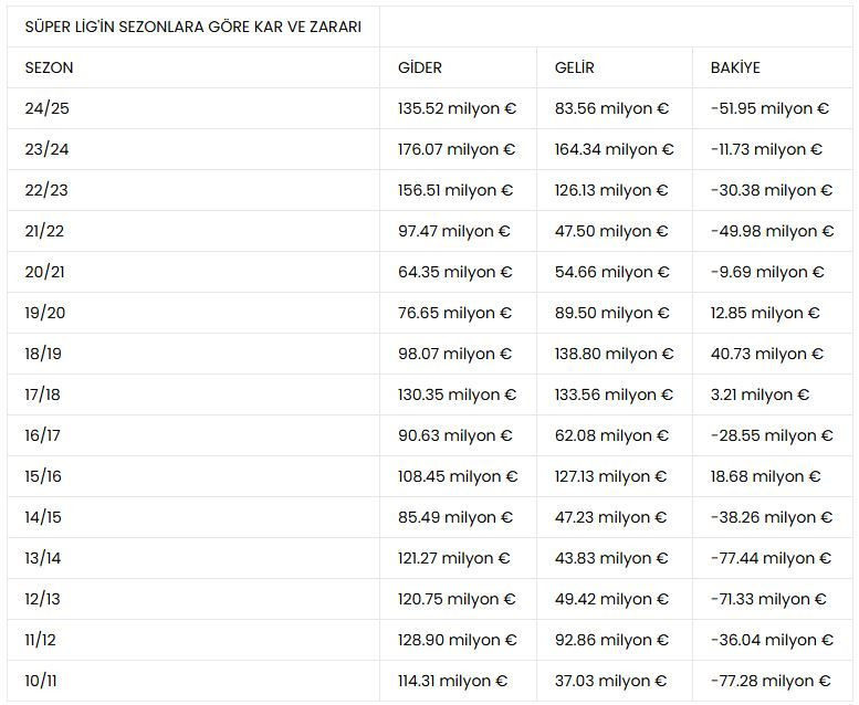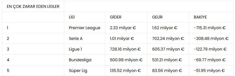 Süper Lig kulüpleri bu yıl da transfer sezonunu hareketli geçirdi ancak kulüpler bu yıl kazandıklarından çok daha fazla harcama yaptı. Trendyol Süper Lig kulüpleri bu sezon yaz transfer döneminde bonservislere ve kiralamalara yaklaşık 135,5 milyon euro harcarken, 83,5 milyon euro gelir elde etti. Böylelikle bu yıl 52 milyon euroluk açık verildi. Habertürk'ün aktardığına göre bu zarar, 2013/2014 sezonundaki 77,5 milyon euroluk rakamdan sonra en büyük kayıp oldu. 2000'li yılların büyük bölümünde transfer dönemleri zararla kapatılırken, 15/16 sezonu ile 19/20 sezonu arasındaki 5 sezonunun 4'ünde kar edilmişti. Kaynak: Habertürk Süper Lig kulüpleri arasında transferde en çok zarar eden takımlar ise sırasıyla Fenerbahçe (19,2 milyon euro), Beşiktaş (18,65 milyon euro) ve Trabzonspor (18,3 milyon euro) oldu. Galatasaray ise transfer sezonunu gelir ve giderde başa baş kapattı. Süper Lig, Avrupa ligleri arasında zarar konusundan ise ilk 5'te yer buldu. Premier Lig'in 715 milyon euro ile zirvede olduğu zarar listesinde, İtalya Serie A (308,5 milyon euro), Fransa Ligue 1 (123 milyon euro), Almanya Bundesliga'nın (70 milyon euro) ardından Süper Lig 5. sıraya yerleşti. Kaynak: Habertürk