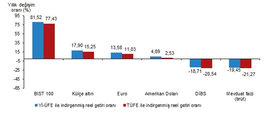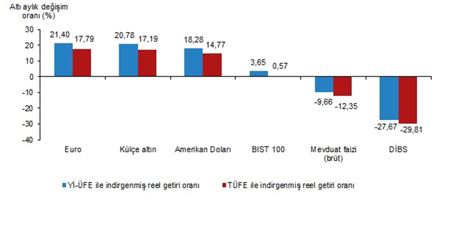 Türkiye İstatistik Kurumu (TÜİK), temmuz ayında en yüksek reel getiri sağlayan finansal yatırım aracının enflasyon ile indirgendiğinde BIST 100 endeksi olduğunu açıkladı. Türkiye İstatistik Kurumu (TÜİK) tarafından yapılan açıklamaya göre, aylık en yüksek reel getiri, yurt içi üretici fiyat endeksi (Yİ-ÜFE) ile indirgendiğinde %10,50, tüketici fiyat endeksi (TÜFE) ile indirgendiğinde ise %9,22 oranlarıyla BIST 100 endeksinde gerçekleşti. Yİ-ÜFE ile indirgendiğinde; yatırım araçlarından, Euro %7,75, Amerikan Doları %5,45 ve külçe altın %5,23 oranlarında yatırımcısına reel getiri sağlarken; mevduat faizi (brüt) %5,85 ve Devlet İç Borçlanma Senetleri (DİBS) %9,56 oranlarında yatırımcısına kaybettirdi. TÜFE ile indirgendiğinde; Euro %6,51, Amerikan Doları %4,24 ve külçe altın %4,02 oranlarında yatırımcısına reel getiri sağlarken; mevduat faizi (brüt) %6,93 ve DİBS %10,60 oranlarında yatırımcısına kaybettirdi. Finansal yatırım araçlarının aylık reel getiri oranları, Temmuz 2023 Euro, üç aylık değerlendirmede; Yİ-ÜFE ile indirgendiğinde %19,18, TÜFE ile indirgendiğinde ise %21,47 oranlarında yatırımcısına en yüksek reel getiri sağlayan yatırım aracı oldu. Aynı dönemde DİBS, Yİ-ÜFE ile indirgendiğinde %16,53, TÜFE ile indirgendiğinde ise %14,93 oranlarında yatırımcısına en çok kaybettiren yatırım aracı oldu. Finansal yatırım araçlarının üç aylık reel getiri oranları, Temmuz 2023 Altı aylık değerlendirmeye göre Euro; Yİ-ÜFE ile indirgendiğinde %21,40, TÜFE ile indirgendiğinde ise %17,79 oranlarında yatırımcısına en yüksek reel getiri sağlayan yatırım aracı olurken; aynı dönemde DİBS, Yİ-ÜFE ile indirgendiğinde %27,67, TÜFE ile indirgendiğinde ise %29,81 oranlarında yatırımcısına en çok kaybettiren yatırım aracı oldu. Finansal yatırım araçlarının altı aylık reel getiri oranları, Temmuz 2023 Yıllık değerlendirmede en yüksek reel getiri BIST 100 endeksinde gerçekleşti Finansal yatırım araçları yıllık olarak değerlendirildiğinde BIST 100 endeksi; Yİ-ÜFE ile indirgendiğinde %81,52, TÜFE ile indirgendiğinde ise %77,43 oranlarında yatırımcısına en yüksek reel getiri sağlayan yatırım aracı oldu. Yıllık değerlendirmede, Yİ-ÜFE ile indirgendiğinde; yatırım araçlarından külçe altın %17,90, Euro %13,58 ve Amerikan Doları %4,89 oranlarında yatırımcısına reel getiri sağlarken; DİBS %18,71 ve mevduat faizi (brüt) %19,45 oranlarında yatırımcısına kaybettirdi. TÜFE ile indirgendiğinde külçe altın %15,25, Euro %11,03 ve Amerikan Doları %2,53 oranlarında yatırımcısına reel getiri sağlarken; DİBS %20,54 ve mevduat faizi (brüt) %21,27 oranlarında yatırımcısına kaybettirdi. Finansal yatırım araçlarının yıllık reel getiri oranları, Temmuz 2023 Kaynak: TÜİK