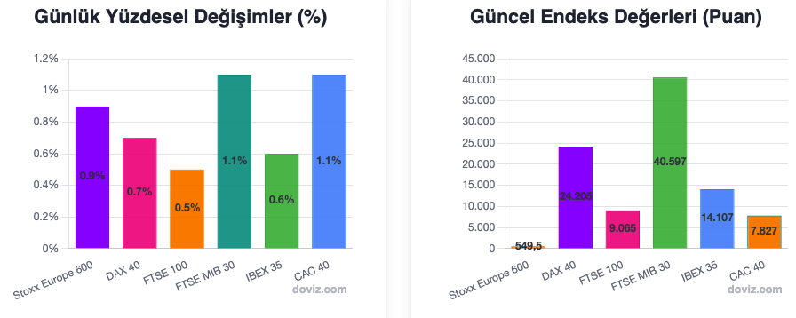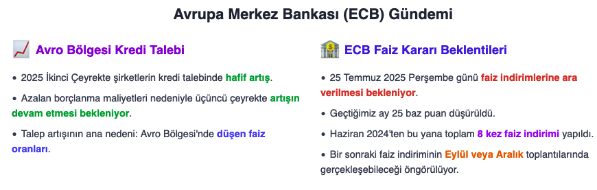 ABD ile Japonya arasında varılan ticaret anlaşması Avrupa piyasalarına olumlu yansıdı, Avrupa Merkez Bankasının 25 Temmuz 2025 Perşembe günü açıklayacağı faiz kararı yatırımcılar için belirleyici gündem maddesi oldu. Avrupa borsaları yükselişe geçerken, tahvil faizlerinin düşmesi dikkat çekti. ABD ile Japonya arasında yapılan ticaret anlaşması küresel ölçekte risk algısını azaltarak Avrupa piyasalarında pozitif bir hava oluşturdu. Bu iyimser atmosfer, Avrupa borsalarının genelinde yukarı yönlü bir seyirle kendini gösterdi. Stoxx Europe 600 gösterge endeksi yüzde 0,9 değer kazanarak 549,5 puana yükseldi. Almanya'da DAX 40 endeksi yüzde 0,7 primle 24.205 puandan işlem gördü. İngiltere'de FTSE 100 endeksi yüzde 0,5 artışla 9.065 puan seviyesine çıktı. İtalya’da FTSE MIB 30 endeksi yüzde 1,1 artarak 40.597 puana ulaştı. İspanya’da IBEX 35 endeksi yüzde 0,6 yükselişle 14.107 puan seviyesine geldi. Fransa’da CAC 40 endeksi yüzde 1,1 değer kazanarak 7.827 puanda dengelendi. İngiltere FTSE 100 endeksi ise ABD ve Japonya arasındaki ticaret anlaşması ile tahvil faizlerindeki gerilemenin etkisiyle 9.068,55 puanla rekor seviyeyi gördü. 'Avrupa Merkez Bankası karar öncesi piyasa dikkat kesildi' Avrupa Merkez Bankası (ECB), 25 Temmuz 2025 Perşembe günü açıklayacağı faiz kararına yönelik beklentilerle piyasalarda temkinli bir iyimserlik hâkim oldu. ECB’nin geçtiğimiz ay gerçekleştirdiği toplantıda üç temel politika faizini 25 baz puan düşürdüğü ve böylece Haziran 2024’ten bu yana toplamda sekiz kez faiz indirimine gittiği biliniyor. Temmuz ayı toplantısında faiz indiriminin durdurulabileceği yönündeki tahminleri güçlendirdi. Piyasa analistleri, bir sonraki faiz indiriminin eylül ya da aralık toplantılarında gerçekleşebileceği öngörüsünü dile getirirken, ECB’nin açıklamaları yatırımcı kararlarında belirleyici rol oynamaya devam etti. Avrupa’daki yatırımcılar için yalnızca faiz kararının yönü değil, karar metninde verilecek mesajlar da kritik bir mercek altına alındı. 'Avro Bölgesi kredi talebinde artış sinyali verdi' Avrupa Merkez Bankası, Avro Bölgesi'nde faaliyet gösteren 151 bankanın katılımıyla gerçekleştirilen Banka Kredi Anketi’nin (BLS) sonuçlarını yayımladı. Raporda, 2025 yılının ikinci çeyreğinde şirketlerin kredi talebinde hafif bir artış yaşandığı ifade edildi. ECB, bu artışın yılın üçüncü çeyreğinde de devam edeceğini öngördü. Raporda aynen şu ifadeye yer verildi: “Yılın ikinci çeyreğinde Avro Bölgesi'nde şirketlerin kredi talebinin hafif artış gösterdiği, azalan borçlanma maliyetleri nedeniyle söz konusu talebin yılın üçüncü çeyreğinde artmaya devam edeceği belirtildi.” Banka, talep artışının nedenleri arasında düşen faiz oranlarını işaret etti. Bu tespitler, kredi kanallarında yeniden bir hareketliliğin başladığına işaret eden veriler arasında dikkat çekti.