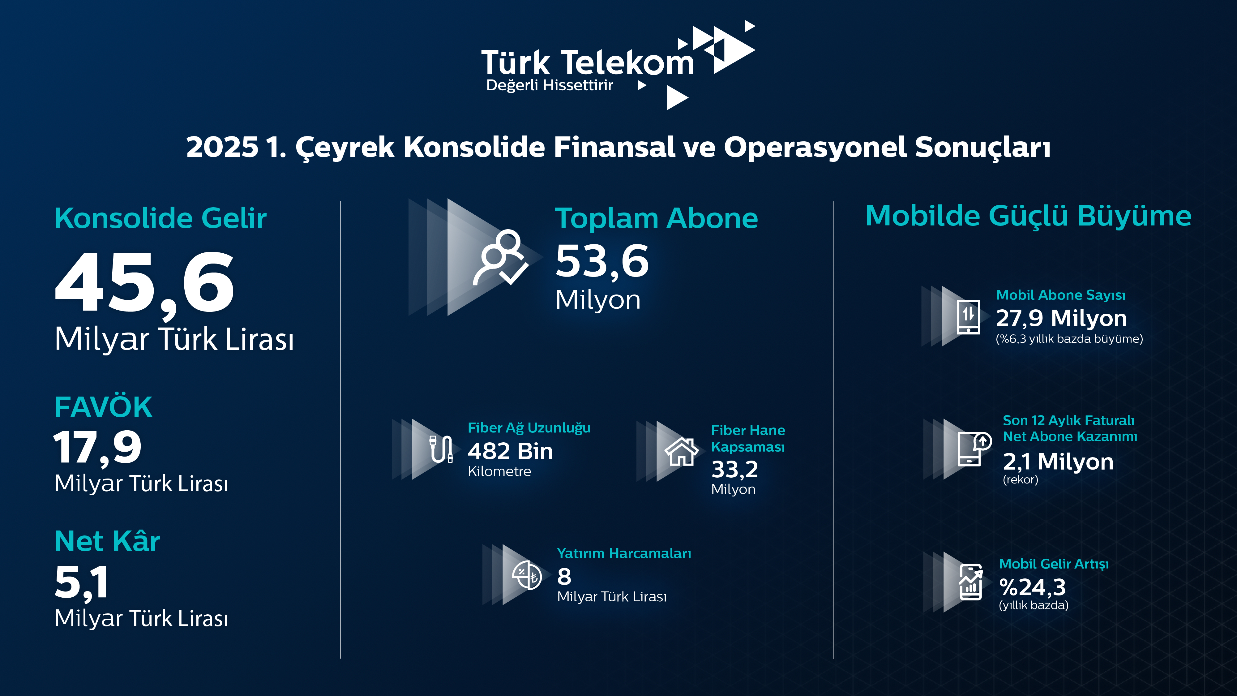 Türk Telekom'un 2025'in ilk çeyreğindeki net karı, yıllık bazda yüzde 45,2 artarak 5,1 milyar liraya ulaştı. Türk Telekom (TTKOM), yılın ilk çeyreğine ilişkin finansal ve operasyonel sonuçlarını açıkladı. Buna göre Türk Telekom’un konsolide gelirleri ilk çeyrekte yıllık bazda yüzde 18,3 artışla 45,6 milyar TL’ye ulaşırken, FAVÖK’ü yüzde 26,5 artarak 17,9 milyar TL'ye yükseldi. Türk Telekom, 2025’in ilk çeyreğinde bir önceki yıla göre yüzde 27,7’lik artışla 8 milyar TL’lik yatırım gerçekleştirirken net karını yıllık bazda yüzde 45,2 artırarak 5,1 milyar TL’ye ulaştırdı. Türkiye’yi uçtan uca ören fiber ağ çalışmaları ile 5G ve ötesi teknolojilerin altyapısını sağlayan Türk Telekom’un 2025’in ilk çeyreği itibarıyla fiber ağ uzunluğu 482 bin km’ye ulaşırken, fiber hane kapsaması 33,2 milyona yükseldi. Türk Telekom’un, bir önceki yılın aynı dönemde yüzde 85,7 olan fiber abonelerinin toplam sabit genişbant aboneleri içindeki payı yüzde 90,1’e yükseldi. Abone sayısı 53,6 milyona çıktı Türk Telekom’un yılın ilk çeyreğinde toplam abone sayısı ise 53,6 milyona ulaştı. Mobil iş kolundaki güçlü büyüme ivmesini sürdüren Türk Telekom, mobil yeni abone kazanımında 2014 yılından bu yana en güçlü birinci çeyrek performansını kaydetti. “Mobilde beklentileri aşan bir performans sergiledik” Verileri değerlendiren Türk Telekom CEO’su Ümit Önal, “Bir telekomünikasyon şirketi olmanın ötesinde, Türkiye’nin dijital dönüşümüne liderlik eden bir teknoloji şirketi olarak faaliyetlerimizi ve yatırımlarımızı hız kesmeden sürdürüyoruz. Yenilikçi vizyonumuz ve teknoloji birikimimizle, Türkiye’nin her köşesinde dijital dönüşümü hızlandıran çalışmalara imza atmayı sürdürüyoruz. Yıla sabit internet ve mobil performansımızdaki gücümüzü koruyarak oldukça başarılı bir başlangıç yaptık. Teknoloji üreten ve ihraç eden Türkiye hedefi ile var gücümüzle çalışmaya ve bölgemizde dijital dönüşümün öncülüğünü üstlenmeye devam edeceğiz” ifadelerini kullandı. Mobil iş kolundaki etkili stratejilerini sürdürdüklerini belirten Önal, “Yeni yılın ilk çeyreğini mobilde beklentileri aşan bir performansla tamamladık. Mobil segmentte çeyreklik bazda 511 bin net abone kazanımıyla toplam abone sayımızı 27,9 milyona yükselttik. Faturalı segment sergilediği güçlü ivmeyi sürdürerek 593 bin net abone kazanımıyla 2023 dördüncü çeyrekten bu yana en yüksek çeyreklik performansına ulaştı. Yeni abone kazanımı 2014 yılından bu yana en güçlü birinci çeyrek performansını kaydetti. Böylece, son on iki aylık faturalı net abone kazanımı 2,1 milyona ulaşarak tarihi bir zirveyi gördü. Mobil Numara Taşıma (MNT) pazarında bir kez daha en çok tercih edilen operatör olarak bu alanda çeyreklerdir sürdürdüğümüz liderliğimizi koruduk. Yüksek kaliteli altyapımız ve müşteri deneyimi odaklı stratejimiz ile mobildeki güçlü büyüme ivmemizi sürdürmeyi amaçlıyoruz” şeklinde konuştu. “Yaşamın tüm alanlarındaki öncü çalışmalarımızla 5G’ye hazırız” Önal, “81 ilin her köşesine ulaşan fiber ağımız 5G ve ötesi teknolojiler için olmazsa olmaz olan güçlü altyapıyı sunuyor. LTE baz istasyonlarımızın %54’ünü fiberle bağladık. Bu oran Avrupa’da 2030 için hedeflenen oranın üzerinde. Fiberin gücünü mobile aktararak 5G’ye geçişin güvencesi olan Fiber Mobilite çağını başlattık. Bununla birlikte 5G alanında uzaktan ameliyat, akıllı tarım, kültür sanat ve spor gibi geniş bir yelpazede öncü çalışmalara imza atıyoruz. 5G’yi yalnızca bir teknoloji geçişi değil, ülkemizi daha güçlü bir geleceğe taşıyan önemli bir araç olarak değerlendiriyoruz. Tüm yatırımlarımızı ve hazırlıklarımızı da bu strateji doğrultusunda şekillendiriyoruz” dedi. “GES kurulumu 2025’te tamamlanıyor” GES yatırımlarımız ülkemizin enerji bağımsızlığı ve sürdürülebilir bir gelecek adına büyük önem taşıyor diyen Önal, “Yeni nesil çevreci iletişim teknolojileri ile güneş enerjisi gibi yenilenebilir kaynaklara yönelerek yeşil dönüşüm adına öncü çalışmalar gerçekleştiriyoruz. GES yatırımlarımız ile karbon ayak izini azaltmayı amaçlıyoruz. Toplam enerji tüketimimizin %65’ine tekabül edecek 405,8 MWe GES kapasitesinin ilk fazının kurulumu için hazırlıklarımızı bitirdik. Üç aşamalı bu yatırımın ilk etabı olan Sivas GES projemizin kurulum çalışmalarına başladık. Bu yıl sonuna kadar tamamlamayı planladığımız proje, 96 MWe’lik enerji üretimiyle Türkiye’nin en yüksek kapasiteli lisanssız tesislerinden biri olacak” ifadelerini kullandı. GES yatırımlarının şirketin iklim eylem planının önemli bir parçasını oluşturduğunu belirten Önal, ayrıca “CDP (Karbon Saydamlık Projesi) skorlama metodolojisine göre son iki yıl içerisinde dört kademe yükselerek ‘A’ Liderlik seviyesine ulaşmak, iklim değişikliğiyle mücadele konusundaki kararlılığımızın başlıca göstergelerindendir” şeklinde konuştu.