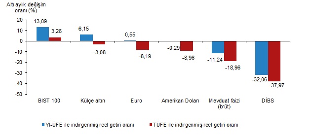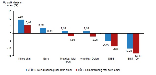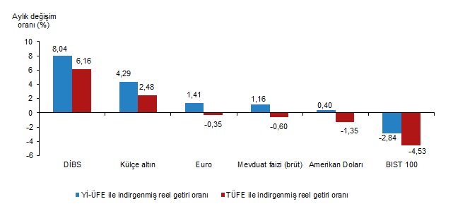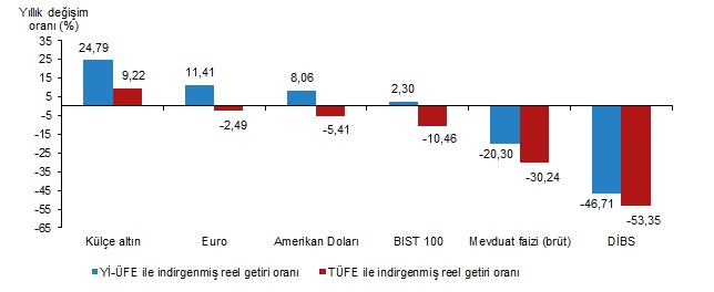 Enflasyonla indirgendiğinde Aralık 2023'te en yüksek aylık reel getiri yüzde 6,16 ile devlet iç borçlanma senetlerinde (DİBS) gerçekleşirken, geçen yıl genelinde en fazla kazanç ise külçe altından elde edildi. Türkiye İstatistik Kurumu, Aralık 2023 ve geçen yıl geneline ilişkin "finansal yatırım araçlarının reel getiri oranlarını" açıkladı. Buna göre, geçen ay en yüksek reel getiri, yurt içi üretici fiyat endeksi (Yİ-ÜFE) ile indirgendiğinde yüzde 8,04, tüketici fiyat endeksi (TÜFE) ile indirgendiğinde ise yüzde 6,16 ile DİBS'te oldu. Yİ-ÜFE ile indirgendiğinde, yatırım araçlarından külçe altın yüzde 4,29, euro yüzde 1,41, mevduat faizi (brüt) yüzde 1,16 ve dolar yüzde 0,4 yatırımcısına reel getiri sağladı. BIST 100 endeksi ise yatırımcısına yüzde 2,84 kaybettirdi. TÜFE ile indirgendiğinde, külçe altın yüzde 2,48 ile yatırımcısına reel getiri sağlarken euro yüzde 0,35, mevduat faizi (brüt) yüzde 0,6, dolar yüzde 1,35 ve BIST 100 endeksi yüzde 4,53 kayba yol açtı. Külçe altın, 3 aylık değerlendirmede, Yİ-ÜFE ile indirgendiğinde yüzde 9,39, TÜFE ile indirgendiğinde yüzde 5,46 ile yatırımcısına en yüksek reel getiri sağlayan yatırım aracı olurken BIST 100 endeksi, Yİ-ÜFE ile indirgendiğinde yüzde 10,25, TÜFE ile indirgendiğinde yüzde 13,48 ile yatırımcısına en çok zarar yazdıran yatırım aracı olarak hesaplandı. Altı aylık değerlendirmeye göre BIST 100 endeksi, Yİ-ÜFE ile indirgendiğinde yüzde 13,09, TÜFE ile indirgendiğinde yüzde 3,26 ile yatırımcısına en yüksek reel getiri sağlayan yatırım aracı olurken aynı dönemde DİBS, Yİ-ÜFE ile indirgendiğinde yüzde 32,06, TÜFE ile indirgendiğinde ise yüzde 37,97 ile yatırımcısına en çok kaybettiren yatırım aracı olarak kayıtlara geçti. Finansal yatırım araçları yıllık değerlendirildiğinde külçe altın, Yİ-ÜFE ile indirgendiğinde yüzde 24,79, TÜFE ile indirgendiğinde yüzde 9,22 ile yatırımcısına en yüksek reel getiri sağlayan yatırım aracı olarak dikkati çekti. Yıllık değerlendirmede, Yİ-ÜFE ile indirgendiğinde, yatırım araçlarından euro yüzde 11,41, dolar yüzde 8,06 ve BIST 100 endeksi yüzde 2,3 ile yatırımcısına reel getiri sağlarken mevduat faizi (brüt) yüzde 20,3 ve DİBS yüzde 46,71 yatırımcısına kaybettirdi. TÜFE ile indirgendiğinde euro yüzde 2,49, dolar yüzde 5,41, BIST 100 endeksi yüzde 10,46, mevduat faizi (brüt) yüzde 30,24 ve DİBS yüzde 53,35 ile yatırımcısında zarara yol açan yatırım araçları oldu. [news_id:720157]