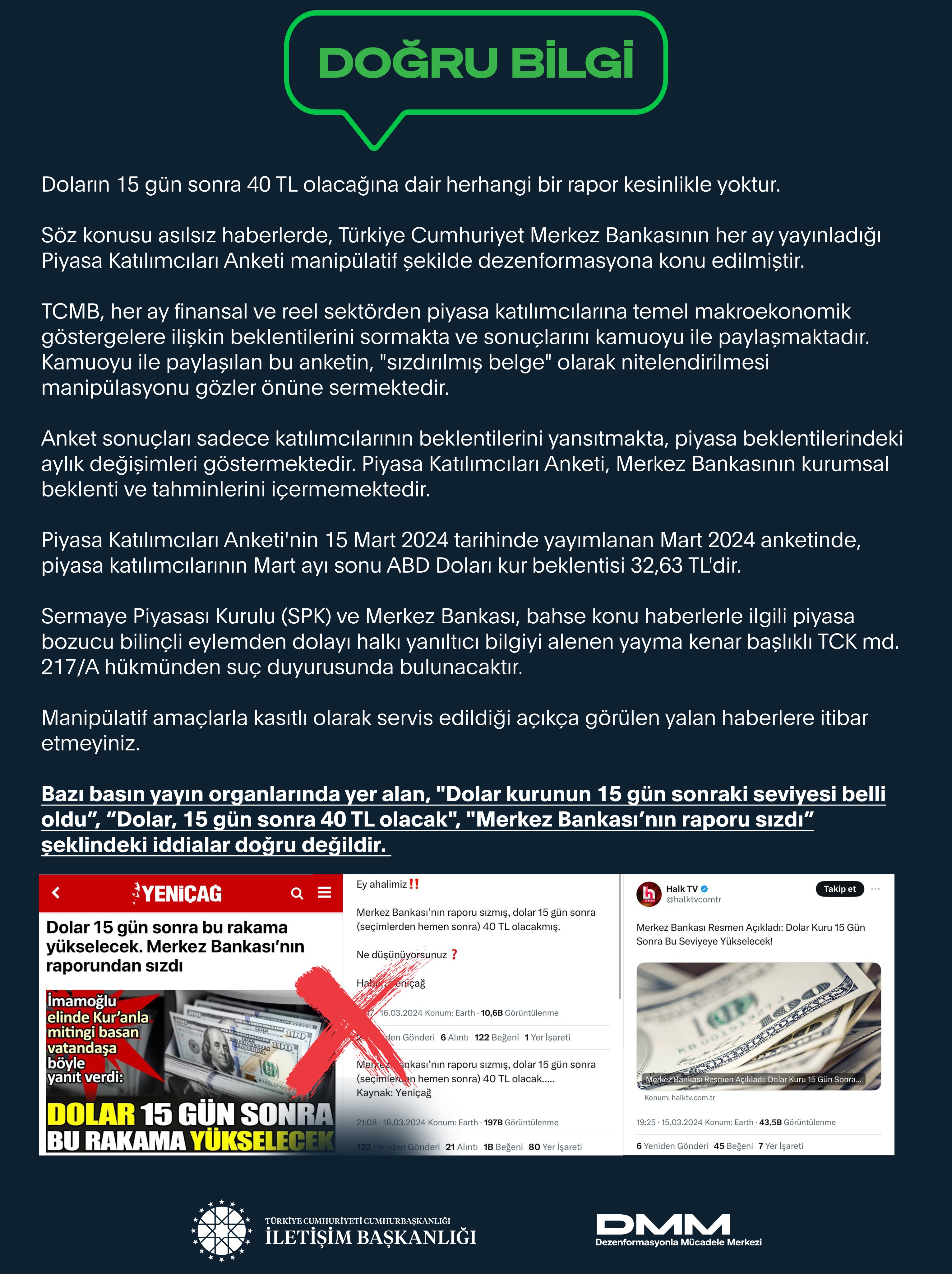İletişim Başkanlığı Dezenformasyonla Mücadele Merkezi, doların iki hafta içinde 40 TL'ye ulaşacağına yönelik kamuoyuna yansıyan iddiaları yalanladı. Dezenformasyonla Mücadele Merkezinin sosyal medya hesabından bir açıklama yayımladı. Açıklamada, bazı basın yayın organlarında yer alan "Dolar 15 gün sonra 40 lira olacak" ile "Merkez Bankası'nın raporu sızdı" iddialarına yanıt verildi. İddialara konu olan herhangi bir raporun olmadığı kaydedilen açıklamada, asılsız haberlerde Türkiye Cumhuriyet Merkez Bankası'nın her ay yayımladığı Piyasa Katılımcıları Anketi'nin manipülatif şekilde kullanıldığı belirtildi. [news_id:727527] Açıklamada ayrıca, söz konusu ankette, mart sonu dolar kur beklentisinin 32 lira 63 kuruş olduğu, piyasa bozucu bu bilinçli eylemden dolayı halkı yanıltıcı bilgiyi alenen yaymaktan suç duyurusunda bulunulacağı kaydedildi. Kaynak: DMM [news_id:727521]