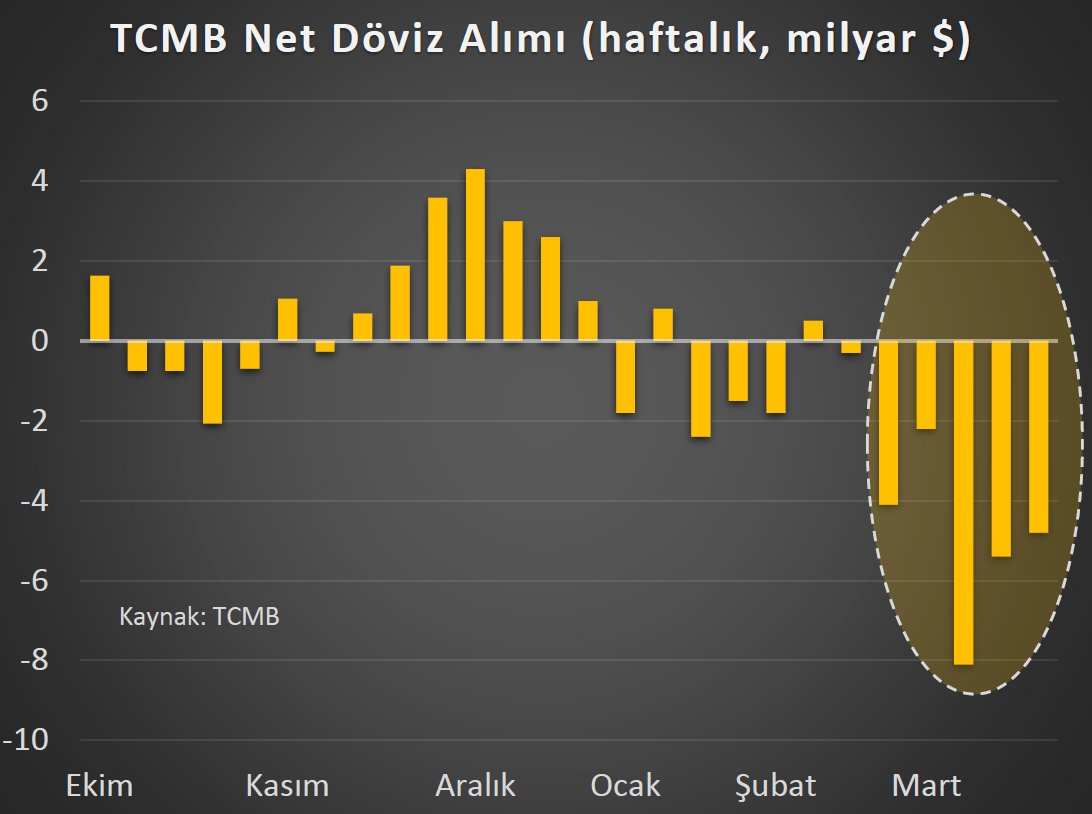 Faiz artışıyla dalgalanan dolar kuru yeniden tarihi zirvesine yaklaşırken, piyasalarda yerel seçim ve sonrasında atılacak adımlar bekleniyor. Dolar/TL'de mart ayının başında bu yana yaşanan yükseliş, artan döviz talebinin etkisiyle ivme kazanmıştı. TCMB’nin sürpriz faiz adımı sonrasında ise kur tarihi zirvesinden 32 liranın altına kadar geriledi. Kurdaki geri çekilmenin ardından pazar günü gerçekleşecek yerel seçim öncesinde dolar/TL bugüne ise 32,23 seviyesinden başladı. [news_id:727180] Bugün iç piyasada takip edilecek veri bulunmuyorken küresel piyasalarda yatırımcılar, ABD'de faiz indirimi takvimini tahmin etmek için bu hafta açıklanacak enflasyon verilerini takip edecek. Rezervlerde düşüş sürüyor Bankacıların hesaplamalarına göre TCMB net ve brüt rezervleri de geçen hafta gerilemeyi sürdürdü. Net rezerv önemli bölümü faiz artışı öncesinde olmak üzere geçen hafta yaklaşık 4,5 milyar dolar düşüş gösterdi. Hesaplamalara göre, TCMB toplam rezervleri geçen hafta yaklaşık 4,1 milyar dolar azalışla 123,8 milyar dolara geriledi. Kara: TCMB, seçimden sonra rezerv biriktirmeye başlayabilir Prof. Dr. Hakan Kara ise Merkez Bankası'nın rezervlerine ilişkin şunları söyledi: “Son faiz kararının rezerv kaybı nedeniyle değil de sadece enflasyona yönelik alındığını söyleyenlerin bu tabloyu incelemelerini öneririm. 5 haftada yaklaşık 25 milyar dolar satılmış. Kaynak: Hakan Kara - X Yukarıdaki paylaşımımı Merkez Bankası perşembe günkü faiz artırımından sonra döviz sattı şeklinde yorumlayanlar olmuş. Bu doğru değil. Cuma günü TCMB sınırlı miktarda döviz almış görünüyor. Faizlerdeki artış dövize talebi azalttı, ancak vatandaşın henüz pek döviz satmadığını görüyoruz. Geçen cuma TCMB sadece 0,2 milyar dolar alabilmiş. Seçimden sonra Merkez Bankası tekrar rezerv biriktirmeye başlayabilir." [news_id:728521]