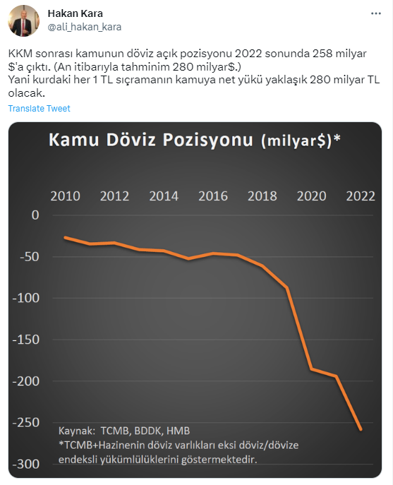 Bilkent Üniversitesi öğretim üyesi ve Merkez Bankası eski başekonomisti Hakan Kara, kur korumalı mevduat (KKM) sonrasında kurdaki her 1 TL'lik sıçramanın kamuya maliyetini 280 milyar TL olarak hesapladı. Hakan Kara, yaptığı Twitter paylaşımında, "KKM sonrası kamunun döviz açık pozisyonu 2022 sonunda 258 milyar $'a çıktı. (An itibarıyla tahminim 280 milyar$.) Yani kurdaki her 1 TL sıçramanın kamuya net yükü yaklaşık 280 milyar TL olacak" ifadelerini kullandı. Kaynak: Hakan Kara - Twitter Kara, konuyla ilgili bir başka tweet'inde ise, "Özel sektörün 124 milyar dolar döviz pozisyon fazlası var. Kur riski özel sektörden kamuya kaydı. Bu sistemde kur arttığında vergi mükellefinden döviz tutanlara bir servet transferi oluyor" değerlendirmesini yaptı. Dolar/TL'de son günlerde yaşanan artışın ardından bu sabah Resmi Gazete’de yayımlanan kararla birlikte Hazine destekli Kur Korumalı Mevduat hesaplarında faiz tavanı kaldırılmıştı. Tıklayın: Mevduat faizi 20 yılın zirvesinde: Dolar/TL’de son durum ne?
