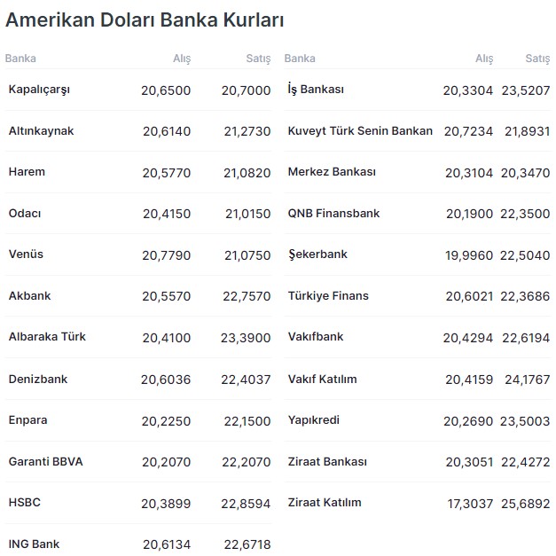Dolar kurundaki yükselişin hızlanması sonrasında yeni rekor seviyelere çıkılırken; Kapalıçarşı ve tabela kuru arasındaki makas da kapandı. Peki bankalarda son durum ne? 14 Mayıs'ta yapılan seçimlerden önce 19,58, pazar günü yapılan cumhurbaşkanlığı seçimi ikinci turundan önce ise 20 liranın hemen altında olan dolar/TL, seçimden sonra yükselişini hızlandırarak 20,60 seviyesinin üzerine kadar çıktı. Öte yandan, bankalararası piyasadaki dolar/TL kuruyla Kapalıçarşı dolar kuru arasındaki makas da neredeyse tamamen kapandı. Buna göre, Kapalıçarşı'da dünkü fiyatlamalara göre dolar/TL 20,70 seviyelerinden alıcılarıyla buluşuyor. Euro/TL’de dolar kuruna benzer şekilde seçim sonrası yükselişini sürdürerek 22,04 seviyesinden fiyatlanmaya başladı. Euro kuru Kapalıçarşı’da ise 22,10 liradan alıcılarıyla buluşuyor. Kapalıçarşı ve bankalararası piyasadaki döviz kurları arasındaki makas kapansa da, ülkenin büyük bankalarının neredeyse tamamında dolar, 22 liranın üzerinde satılmaya devam ediyor. İşte bankaların son verilere göre dolar alış-satış rakamları: Kaynak: Doviz.com ABD Doları – Banka Kurları