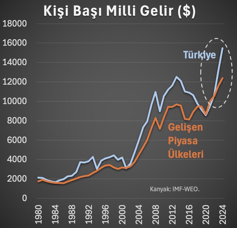 Ekonomistler, TÜİK'in 2024 yılına iişkin büyüme verilerini açıklamasının ardından kişi başı milli gelirdeki artışı değerlendirdi. Türkiye İstatistik Kurumu (TÜİK) 2024 yılı ekonomik büyüme verilerini açıkladı. Açıklanan veriler arasında dolar bazında kişi başına düşen milli gelir de yer aldı. TÜİK’in hesaplamalarına göre kişi başına düşen milli gelirin 15 bin 463 dolara yükseldiği görüldü. Merkez Bankası eski Başekonomisti Hakan Kara ise açıklanan verileri değerlendirerek, “Türkiye son yıllarda dolar bazında kişi başı milli gelirde gelişmekte olan ülkelere ciddi fark atarak yüksek gelirli ülkeler sınıfına girdi. Değerli TL sağ olsun, vatana millete hayırlı olsun.” ifadelerini kullandı. Kaynak: Hakan Kara - X Bu açıklamanın ardından bazı sosyal medya kullanıcıları ise Kara'ya “milli gelir artışını neden hissetmiyoruz?” sorusunu yöneltti. Hakan Kara da takipçilerine Big Mac endeksini paylaştığı grafikle üzerinden, “Dolar bazında gelirimiz çok arttı ama dolar bazında da epey pahalı bir ülke olduk, ondan.” yanıtını verdi. "Aslında zirveden yüzde 10 düşüş var" Deneyimli fon yöneticisi Emre Akçakmak ise X hesabından yaptığı paylaşımda konuya ilişkin şunları kaydetti: "Türkiye'nin 15 bin doları geçen kisi başı milli gelirini daha önceki zirve ile karşılaştırılabilir olarak değerlendirmek için iki düzeltme yapıyorum: 1) Dönem boyu oluşan dolar enflasyonu 2) Geçici göcmen statüsünde rapor edilen ancak kişi başı gelir hesabına dahil edilmeyen nüfus. Kurun bu şekilde devam edeceğini varsaymak kaydıyla nominal olarak USD 15 bin seviyesi olumsuz sayılmaz. Ancak daha sağlıklı bir karşılaştırma ile bakılınca milli gelirin 2013 zirvesi olan USD 12.500'den USD 11.000'e geldigini, yani zirveden 10-12% azaldığını gözlemliyorum." Kaynak: Emre Akçakmak - X