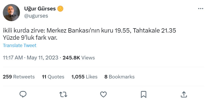 Kapalıçarşı ve bankalar arasındaki kurlarda yaşanan fiyat farkı bugün yüzde 9’a ulaşırken, ekonomistlerden de ikili kur sistemine yönelik eleştiri geldi. Yaşanan gelişmelere ilişkin Ekonomist Uğur Gürses, bugün yaptığı sosyal medya paylaşımda ikili kurda zirve yaşandığını belirterek, ”Merkez Bankası’nın kuru 19,55, Tahtakale 21,35, Yüzde 9’luk fark var.” ifadelerini kullandı. Kaynak: Uğur Gürses - Twitter Ekonomist Özgür Demirtaş ise Twitter’dan konuyla ilgili yaptığı paylaşımında şunları kaydetti: “Kapalıçarşı kuru 21,23. Bankalarda gördüklerinizi unutun. Gerçek SERBEST Piyasa kuru bu: Hükümet İKİLİ kur oluşturdu ülkede…” Tıklayın: 8 yabancı bankadan ‘seçim sonrası ekonomi ve dolar/TL’ analizi