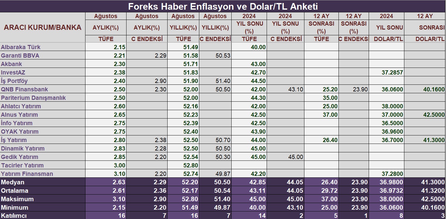 Foreks Haber, ekonomistlerin katılımıyla gerçekleştirdiği beklenti anketinde, ağustos ayı enflasyonu ve yıl sonu dolar kuruna ilişkin beklentileri belirledi. Foreks Haber, 16 ekonomistin katılımı ile gerçekleştirdiği ay sonu ve yıl sonu enflasyonuna yönelik beklenti anketinin sonuçlarını açıkladı. Ankette, ağustos ayı aylık TÜFE verisi için medyan tahmin yüzde 2,63 artışa, yıllık medyan tahmin ise yüzde 52,20 artışa işaret etti. Temmuz ayı TÜFE verisi ise aylık yüzde 3,38 artış beklenirken, yüzde 3,23 seviyesinde açıklanmış ve yıllık enflasyon yüzde 61,78 seviyesinde gerçekleşmişti. Öte yandan ankette 2024 yıl sonu enflasyonu için medyan tahmin yüzde 42,85 seviyesinde ölçülürken, yıl sonu TÜFE için en yüksek beklentinin yüzde 45, en düşük tahminin ise yüzde 40 olduğu görüldü. Bu beklentilerin ortasında ağustos ayı enflasyon rakamları Türkiye İstatistik Kurumu (TÜİK) tarafından 3 Eylül Salı günü saat 10.00'da açıklanacak. [news_id:743803] [news_id:744002] Dolar kurunda tahminler ne yönde? 8 ekonomistin katılım sağladığı 2024 sonu dolar/TL anketinde ise medyan tahmin 36,98 oldu. Kur için en yüksek ve en düşük tahminler sırasıyla 38 ve 36,06 olarak sıralandı. Önceki anket döneminde yıl sonu dolar/TL beklentisi 37,14 seviyesindeydi. Kaynak: Foreks Haber Enflasyon ve Dolar/TL Beklenti Anketi TCMB'nin son piyasa katılımcıları anketinde ise katılımcıların 2024 yıl sonu dolar/TL beklentisi 37,28 TL olurken, 12 ay sonrası döviz kuru beklentisi 42,03 TL olarak belirlenmişti. Kaynak: TCMB - Piyasa Katılımcıları Anketi [news_id:743532]