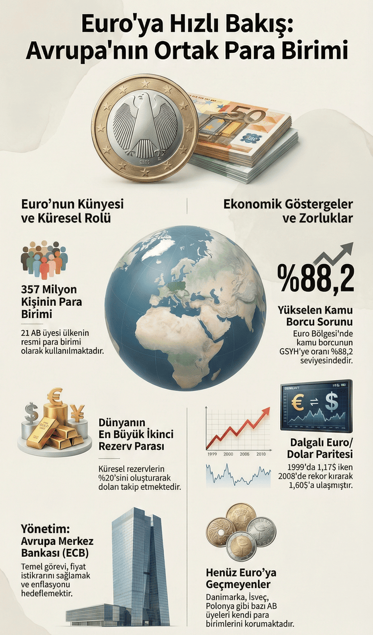 Avrupa Birliği ülkelerinde kullanılan Euro, 1 Ocak 2026 itibarıyla 27 yaşını doldurdu. Avrupa Birliği üyesi 21 ülkenin resmi para birimi olan euro, 1999 yılında kaydi olarak yürürlüğe girdi ve aynı yıl dünya finans piyasalarına tanıtıldı. Ortak para birimi, üç yıllık geçiş sürecinin ardından 1 Ocak 2002’de banknot ve madeni para olarak tedavüle girdi. Bu tarihle birlikte birçok ülkede ulusal para birimleri dolaşımdan çekildi. Euro Bölgesi genişledi, Bulgaristan katıldı AB Komisyonu ve Avrupa Merkez Bankası kararları doğrultusunda, 2007’den bu yana AB üyesi olan Bulgaristan, 1 Ocak 2026 itibarıyla Euro Bölgesi’ne dahil oldu. Böylece Bulgaristan, resmen euro kullanan ülkeler arasına katıldı. Almanya, Fransa, İtalya, İspanya ve Letonya’nın da aralarında bulunduğu 21 ülke, euroyu resmi para birimi olarak kullanıyor. Euro Bölgesi ülkelerinin para politikası, ECB ile üye ülkelerin merkez bankalarından oluşan Euro Sistemi tarafından yürütülüyor. ECB’nin temel hedefi fiyat istikrarını sağlamak ve orta vadeli enflasyon hedefini yüzde 2 seviyesinde tutmak olarak tanımlanıyor. Bankacılık sektörünün denetimi, mali sistemin gözetimi ve ödeme altyapısının güvenliği de ECB’nin görev alanları arasında yer alıyor. Euro kullanımı, banknotlar ve rezervlerdeki yeri Euro, Avrupa genelinde 357 milyonun üzerinde kişi tarafından kullanılıyor. Tedavülde 5, 10, 20, 50, 100, 200 ve 500 euro banknotları ile farklı madeni paralar bulunuyor. Kara para aklama ve terörün finansmanı riskleri nedeniyle 500 avroluk banknotların basımı 2019 yılında durduruldu. Doların ardından dünyanın en çok kullanılan ikinci rezerv para birimi olan euro, küresel rezervlerin yaklaşık yüzde 20’sini oluşturuyor. Euro/dolar paritesi, 1999’da 1 euro = 1,17 dolar seviyesindeyken zaman içinde dalgalı bir seyir izledi. Parite, 2008’de 1,60 dolarla zirve gördü. 2025 yılı sonunda ise euro/dolar 1,18 seviyesinde seyrederek yıl içinde yaklaşık yüzde 15 değer kazandı. Borç görünümü ve euroya geçmeyen ülkeler Euro Bölgesi ülkelerinde toplam kamu borcu 13,677 trilyon avroya ulaştı. Borcun GSYH’ye oranı yüzde 88,2 seviyesinde bulunuyor. Yunanistan, yüzde 151,2 ile en yüksek borç oranına sahip ülke konumunda yer alıyor. AB kuralları borcun GSYH’nin yüzde 60’ını aşmamasını öngörse de, uygulamada bu sınırın uzun süredir aşıldığı görülüyor. Danimarka ve İsveç’in yanı sıra Polonya, Macaristan, Çekya ve Romanya euroya geçmeyen AB ülkeleri arasında bulunuyor. Bu ülkeler, kendi para birimlerini kullanarak para politikaları üzerinde bağımsız kontrol sağlamayı sürdürüyor.