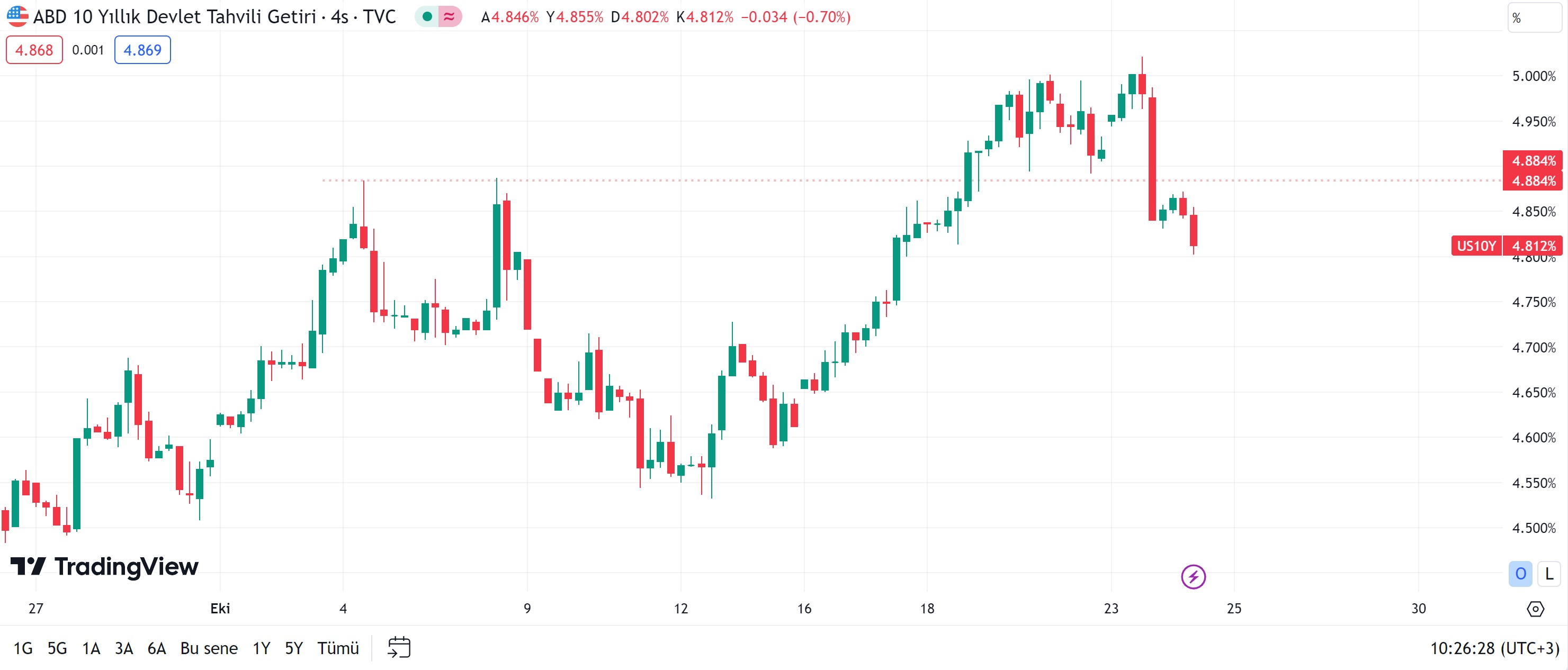 Euro/Dolar paritesi ABD 10 yıllık tahvil getirilerindeki gerilemenin desteğiyle son bir ayın zirvesini test ederken; Euro/TL ise 30 liranın üzerine çıkmaya çalışıyor. İsrail ile Hamas arasında başlayan ve Orta Doğu’daki gerilimi yükselten savaş sonrasında bir İsrail radyosu, piyasaların yakından takip ettiği kara harekatının takviye ABD kuvvetleri gelene kadar erteleneceğini duyurdu. 7 Ekim tarihinde başlayan çatışma sonrasında özellikle Amerika Birleşik Devletleri’nin (ABD) ve bazı Avrupa ülkelerinin İsrail’e tam destek vereceğini açıklaması sonrasında ise bölgede gerilim tırmanmıştı. ABD ve İngiltere, bölgeye tam donanımlı gemiler göndererek Orta Doğu’daki ülkelere gözdağı verirken; Çin Dışişleri Bakanı Vang Yi ise İsrail-Filistin çatışmasında tüm tarafların kalıcı barış için uluslararası uzlaşmayı teşvik etmesi gerektiğini vurgulayarak, Filistin sorununda Arap ve İslam ülkelerinin meşru taleplerini desteklediklerini bildirmişti. Küresel gerilimlerin tavan yaptığı bu dönemde Dolar/TL ise savaştan hemen önce 27,6 seviyelerinden işlem görürken, 28 seviyesinin üzerinde güç toplamayı başardı. Euro/TL ise bugün 30 lira sınırını test ettikten sonra saat 10.45 itibarıyla yüzde 0,07 düşüşle 29,97 seviyesinden işlem gördü. Euro/Dolar paritesi de günün ilk saatlerinde 1,0695 seviyesi ile son bir ayın zirvesine çıktıktan sonra kazançlarını geri vererek yüzde 0,09 düşüşle 1,0660 puandan fiyatlandı. Euro’nun dolar karşısındaki son yükseliş denemesinde ise yüzde 5 seviyesinin üzerine çıkan ABD 10 yıllık tahvil getirilerindeki gerileme etkili oldu. Buna göre piyasaların yakından takip ettiği ABD 10 yıllık tahvilleri bugün yüzde 4,81 seviyesine kadar geri çekildi. Dolar mı euro mu alınmalı? Altın ve para piyasaları uzmanı İslam Memiş ise TCMB’nin faiz kararı gününde dolar/TL’nin kısa vade için 27 ve 26,80 seviyelerine iğne atabileceğini belirterek, yıl sonu için dolar beklentisinin 29,7 olduğunu açıkladı. TCMB’nin politika faizinde 400 – 500 baz puanlık bir atış yapabileceğini bekleyen Memiş, dolar mı almalıyım euro mu almalıyım sorusunun cevabının ise euro olduğunu ifade etti. Euronun önemli fırsatlar sunduğunu vurgulayan Memiş, euro tarafında her düşüşün bir fırsat olduğunu öne sürdü. JPMorgan stratejistleri ise Orta Doğu'daki savaşın Avrupa'nın ithal ettiği enerji fiyatında tehdit yaratması ve yüksek borçlanma maliyetlerinin Euro Bölgesi'nin büyümesi üzerinde baskı oluşturması nedeniyle euronun bu yılın sonuna kadar ABD doları karşısında zayıflamayı sürdüreceğini öngörmüştü. [news_id:711269] Gözler TCMB’de Bu gelişmelerin ortasında yatırımcılar ise perşembe günü açıklanacak kritik faiz kararını bekliyor. Son dört toplantıda toplam 2 bin 150 baz puanlık faiz artışı gerçekleştiren TCMB’den, HSBC 250 baz puan, Morgan Stanley ve Deutsche Bank ise 500'er baz puanlık artış bekliyor. [news_id:711950]