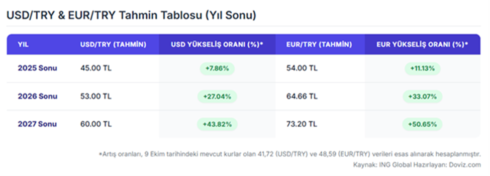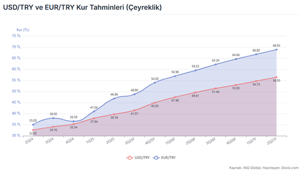Hollanda merkezli ING Global, Türkiye ekonomisine ilişkin hazırladığı raporda, döviz kurlarına yönelik 2025, 2026 ve 2027 sonu tahminlerini açıkladı. Aralarında Muhammet Mercan’ın da bulunduğu ING ekonomistleri, Türkiye ekonomisine ilişkin son görüşlerini paylaştı. Yurt içi siyasi belirsizliklerin etkisiyle mart ve nisan aylarında yatırımcıların güveninin kısa süreliğine sarsıldığının altı çizilen raporda, politika yapıcıların net sinyalleri, Merkez Bankası'nın hızlı ve kararlı adımlarıyla birlikte istikrarın yeniden sağlandığı aktarıldı. Mayıs ayından bu yana brüt rezervlerin rekor kırdığı bildirilen raporda, bu artışın yalnızca yurt dışından gelen yeni sermaye akışından değil, aynı zamanda Türk lirası cinsinden varlıklara yönelik yerel ilginin yeniden canlanmasından da kaynaklandığı kaydedildi. Merkez Bankası’nın temmuz ve eylül aylarında beklenenden daha agresif bir gevşemeyle faiz indirim döngüsüne yeniden başladığı hatırlatılan raporda, aylık veya üç aylık bazda tutarlı bir değer artışı görülmese de TCMB’nin daha uzun vadede liranın kümülatif reel değer kazanmasını beklediği söylendi. Mart ayındaki keskin düşüşün ardından rezervlerin belirgin bir toparlanma gösterdiği aktarılan raporda, altın fiyatlarındaki artışın rezervlerin ABD doları cinsinden değerinin artmasına katkı sağladığı paylaşıldı. Bu gelişmeler ışığında ING, TCMB’nin hem para birimi hem de rezerv seviyeleri üzerindeki baskıları yönetmek için yeterli politika alanı bulunduğunu söyledi. Bankanın ileriye dönük yönlendirmesinin faiz indirimlerinin devam edeceği yönünde olduğunu bildiren ING, ilave indirimlerin boyutunun, ekonomik faaliyet seviyeleri ve rezervlerin seyri dışında, yerleşiklerin portföy tercihleri ve enflasyon eğilimleri tarafından şekilleneceğini paylaştı. Enflasyon ve faiz tahmini Bu beklentiler ışığında ING, yıl sonunda politika faizinin yüzde 37,5 seviyesine, 2026 sonunda ise yüzde 27 seviyesine indirileceğini tahmin etti. Yıl sonunda enflasyonun yüzde 30,5 seviyesine ineceğini öngören ING, 2026 sonu tahminini ise yüzde 20,4 olarak açıkladı. Dolar ve euro tahminleri İlgili raporda döviz kurlarına yönelik tahminlerini de açıklayan ING Global, dolar/TL’nin 2025, 2026 ve 2027 sonunda sırasıyla 45, 53 ve 60 lira olacağını öngördü. Bankanın euro/TL’ye ilişkin yıl sonu tahminleri ise 2025, 2026 ve 2027 için 54, 64,66 ve 73,20 olarak sıralandı. Bankanın projeksiyonlarına göre 2027 sonuna kadar dolar/TL'de yüzde 43,82, euro/TL'de ise yüzde 50,65 artış gerçekleşecek. [news_id:787607]