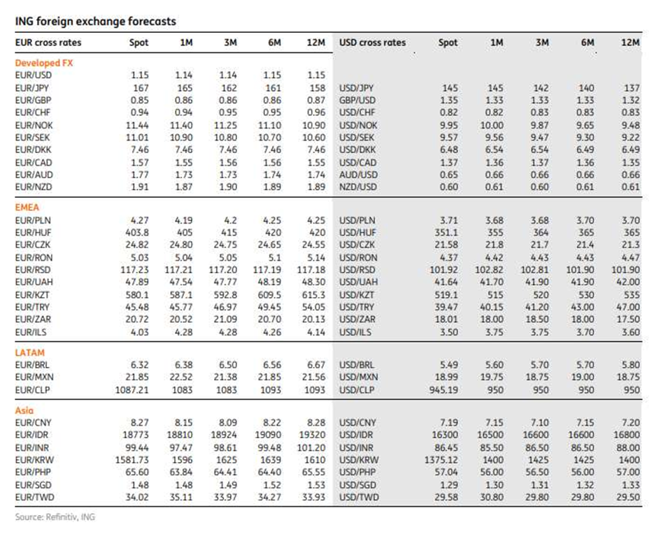 ING Global, Haziran 2025 tarihli döviz piyasaları raporunda dolar/TL ve euro/TL’ye ilişkin son tahminlerini açıkladı. ING Global, Haziran 2025 tarihli döviz piyasaları raporunda Türkiye ekonomisine ve Türk Lirası'nın seyrine dair önemli değerlendirmelerde bulundu. USD/TRY paritesinin önümüzdeki 1 ay içinde 40,15 TL seviyesinde olacağını tahmin eden ING, 3 aylık dönemde doların 41,20 TL’ye, 6 ay sonunda 43,00 TL’ye ve 12 ay sonra 47,00 TL’ye ulaşmasını beklediğini bildirdi. EUR/TRY paritesi için de benzer bir değer artışı tahmin eden ING, EUR/TRY’nin 1 ay içinde 45,77 TL seviyesine çıkacağını öngördü. Euro için tahminler 3 aylık dönemde 46,97 TL’ye, 6 aylık dönemde 49,45 TL’ye ve 12 aylık dönemde 54,05 TL’ye işaret etti. Kaynak: Forınvest Haber Petrol fiyatları risk oluşturuyor Yıllık enflasyonda düşüş eğilimine dikkat çekilen raporda, son dönemde yaşanan dalgalanmanın enflasyon üzerindeki etkisinin sınırlı kaldığı bildirildi. Buna ek olarak kurum, yıl sonunda enflasyonun %30’un altında kalmasını beklediğini ifade etti. İran-İsrail arasında tırmanan gerginliğin petrol fiyatlarını yukarı yönlü etkileyebileceğine işaret edilen raporda, böyle bir gelişmenin dezenflasyon süreci üzerinde baskı oluşturabileceği değerlendirildi. [news_id:775676]
