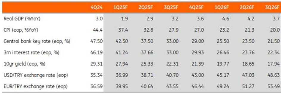 ING Global, Türkiye ekonomisine ilişkin hazırladığı son notta, dolar kuru ve faize ilişkin tahminlerini açıkladı. Aralarında Muhammet Mercan’ın da bulunduğu ING ekonomistleri, Türkiye ekonomisine ilişkin görüşlerini paylaştı. 2024'ün dördüncü çeyreğine ilişkin ekonomik verilerin sıkı para politikalarına rağmen iç talebin toparlandığını gösterdiğini bildiren ekonomistler, tüketimin 2024 ortasındaki düşüşün ardından rekor seviyeye ulaştığını, net ihracatın ise büyümeye negatif katkı sağladığını bildirdi. Göstergelerin GSYH büyümesinin 2025'in başlarında toparlanmaya devam edeceğine işaret ettiğini bildiren ekonomistler, talep koşullarının ise daha düşük enflasyonu destekleyeceğini öngördü. Talebin beklenenden daha hızlı büyümesi halinde ise TCMB’nin yeni önlemler alabileceği veya faiz indirimlerini yavaşlatabileceği aktarıldı. Şubat ayı enflasyonunun hem gıda hem de gıda dışı kalemlerin katkısıyla beklenenden daha düşük gerçekleştiğini bildiren ekonomistler, merkez bankasının sıkı para politikalarını sürdürmesi, para biriminin güçlenmesi ve hizmet enflasyonunun iyileşmesiyle enflasyonun düşmeye devam edeceğini tahmin etti. TCMB nisanda faiz indirimlerine devam edebilir Enflasyonun mart ayında daha da düşeceğini tahmin eden ekonomistler, TCMB’nin nisan ayında 250 baz puanlık bir faiz indirimine gidilebileceğini bildirdi. Bankanın yıl sonuna ilişkin politika faizi beklentisi ise yüzde 29 oldu. Merkez Bankası'nın gelecekteki kararlarının döviz mevduatları, döviz kurları ve yabancı rezerv seviyeleri gibi faktörlere bağlı olacağının altını çizen ING ekonomistleri, şubat ayında Merkez Bankası’nın artan yerel talep nedeniyle döviz alımından döviz satımına geçtiğini hatırlatarak “Para birimi üzerindeki baskının devam etmesi, daha sıkı politikalara, daha küçük faiz indirimlerine veya bir duraklamaya yol açabilir.” görüşünü paylaştı. [news_id:763870] Kurda temel risk yerel piyasadan gelecek döviz talebi Türk lirasının geçtiğimiz aralık ayından bu yana 250bps'lik üç faiz indirimine rağmen TCMB'nin indirim döngüsünün başlamasından rahatsız görünmediğini bildiren ekonomistler, baz senaryolarının liranın reel olarak değer kazanmaya devam edeceği yönünde olduğunu ancak trendde daralan carry ve zorlaşan forward ile bazı çatlaklar görüldüğünü bildirdi. Türk lirasının şimdilik gelişmekte olan piyasalar arasında en uygun carry trade olmaya devam ettiğini ve bu perspektifin değişmesi için çok erken olduğunu bildiren ING ekonomistleri, yabancı yatırımcı tarafındaki yoğun uzun pozisyona rağmen TL'ye yönelik ana riskin aslında yerel piyasa ve ondan gelecek döviz talebi olduğunu bildirdi. Bu kapsamda ekonomistler USD/TRY kurunun yıl ortasında 38,71 ve yıl sonunda 43,00 seviyesine kadar yükselmeye devam edebileceğini tahmin etti. Source: ING Global [news_id:765434]