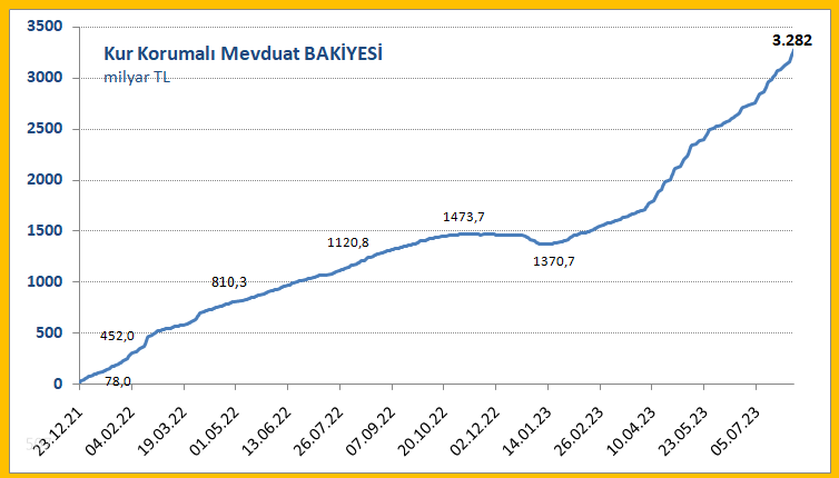 Kur korumalı TL mevduat ve katılma hesaplarındaki tutar geçtiğimiz hafta yaklaşık 150 milyar TL artarak en büyük sıçrayışını gerçekleştirdi. Peki ekonomistler bu artışa yönelik ne söyledi? Bankacılık Düzenleme ve Denetleme Kurumunun (BDDK) haftalık bülteninde yer alan bilgilere göre, Kur Korumalı TL Mevduat ve Katılma hesaplarının toplam tutarı 4 Ağustos ile sona eren haftada 3 trilyon 132 milyar TL’den 3 trilyon 282 milyar TL’ye çıktı. Aynı haftada krediler 10 trilyon 539,5 milyar TL’den 10 trilyon 331,7 milyar TL’ye gerilerken; mevduat 12 trilyon 339 milyar TL’den 12 trilyon 593,7 milyar TL’ye yükseldi. Tüketici kredileri 1 trilyon 412,5 milyar TL’den 1 trilyon 415 milyar TL’ye, bireysel kredi kartları 839,8 milyar TL’den 854 milyar TL’ye çıktı. Takipteki alacaklar ise 170,5 milyar TL’den, 170 milyar TL’ye indi. Ekonomistler ne söyledi? Sosyal medya üzerinden yaptığı ekonomi paylaşımları ile tanınan "beşyüzyedi" KKM'deki artışı değerlendirdi. Buna göre konuyla ilgili paylaşımda şunlar kaydedildi: "KKM 1 haftada 150 milyar TL artarak en büyük sıçrayışını gerçekleştirdi. Hızla yükselen kur farkı ödemelerinin devam eden hesapların üzerine eklenmesi bunun temel sebebi oldu... Günlük ortalama artışlar... KKM sahiplerinin hesap makinesinde gördükleri 3 aylık TL getirileri... Kaynak: beşyüzyedi - X [news_id:703534]