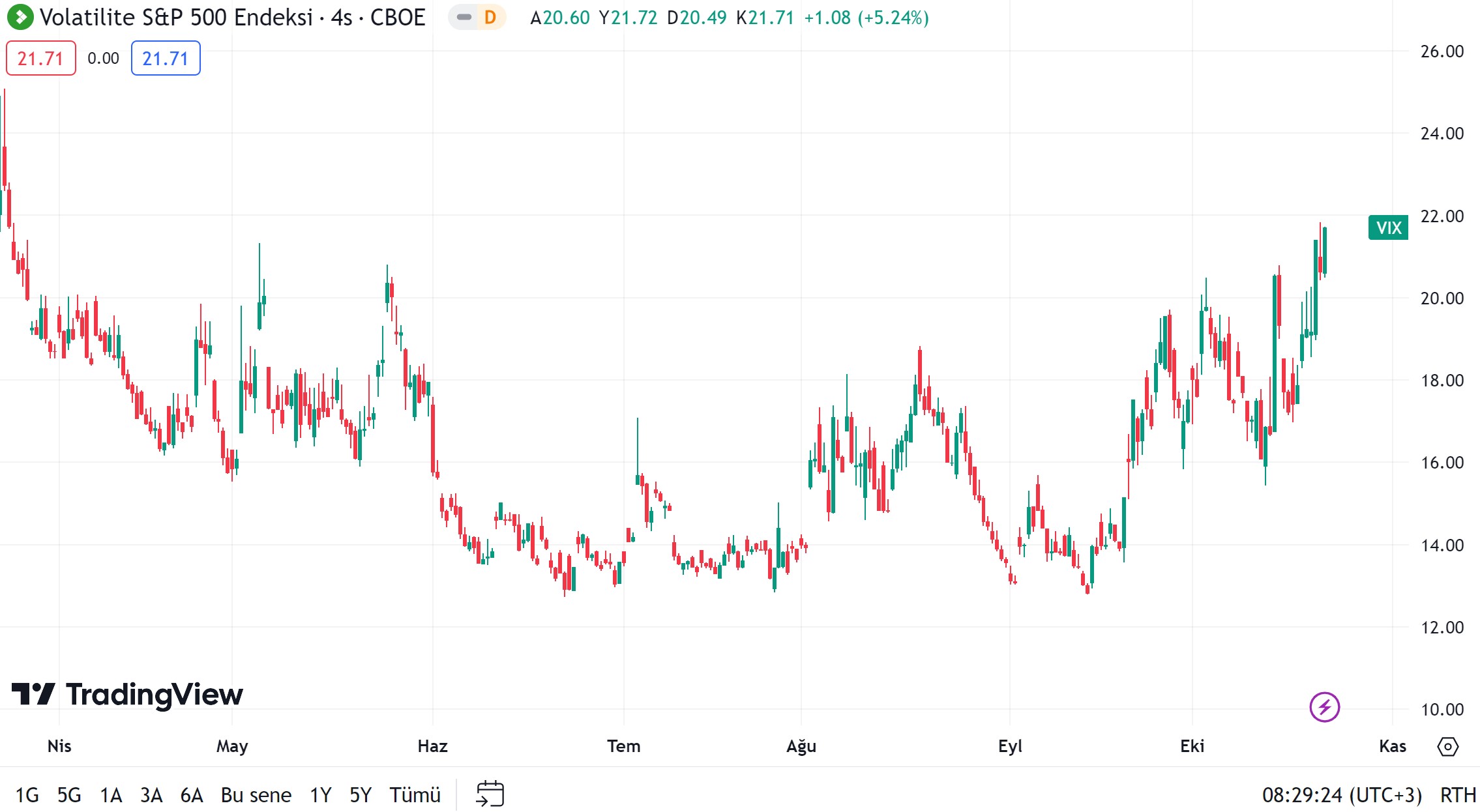 Küresel piyasalarda karamsar hava her geçen gün daha da artarken, korku endeksi ise yedi ayın zirvesine çıktı. Peki, gerilimlerin arttığı yeni haftaya yatırım araçları nasıl başladı? İşte detaylar.. Küresel piyasalarda artan oynaklık, güvenli liman arayışını tetiklerken, yatırımcıların saklanacakları güvenli liman sayısı da hızla azaldı. Yatırımcı tedirginliğinin bir göstergesi olan Volatilite Endeksi (VIX) yani korku endeksi ise ABD borsalarının göstergesi konumunda S&P 500 endeksinin yılın en yüksek seviyesine ulaştığı temmuz sonuna göre %8 düşüş göstermesinin ardından bu sabah yaklaşık 7 ayın en yüksek seviyesine ulaştı. Kaynak: Tradingview Orta Doğu’da tansiyon yükseliyor VIX endeksinin yükselişinde, Orta Doğu’daki gerilimin tırmanması etkili olurken, İsrail-Hamas çatışmasının 17. gününe girildi. Hafta sonu İsrail, olası kara harekatı öncesinde Gazze'ye hava operasyonlarını yoğunlaştırırken, bir gecede 400'den fazla Filistinlinin yaşamını yitirdiği duyuruldu. İsrail Savunma Bakanı ise Gazze'ye yönelik kara saldırısının aylar sürebileceğini söyledi. Bu gelişmeler ise savaşın bölge geneline yayılabileceği endişesini tetikleyerek, VIX endeksinin son yedi ayın zirvesine çıkmasına yol açtı. [article_id:183] Yurt için gündem Küresel tedirginliklerin arttığı bu dönemde dolar kuru ise haftaya 28 lira seviyesinin üzerinde başladı. Türkiye’nin 5 yıllık risk primi ise ekonomi yönetiminin uluslararası piyasalara güven sağlama adımları sonrasında dışarıdaki bozuk havaya rağmen geçtiğimiz haftanın son gününde diğer gelişen ülkelere nazaran daha sağlam bir görüntü çizmişti. Kaynak: Kerim Karakaya - X Bu hafta yurt içi piyasada gözler ise TCMB'nin olağan Para Politikası Kurulu (PPK) kararında olacak. AA Finans'ın 19 ekonomist ile gerçekleştirdiği beklenti anketine göre ekonomistler, Türkiye Cumhuriyet Merkez Bankası (TCMB) Para Politikası Kurulu (PPK) toplantısına ilişkin 500 baz puanlık bir artırım bekliyor. Foreks Haber’in 22 ekonomistin katılımı ile gerçekleştirdiği beklenti anketi de benzer şekilde faizlerin yüzde 35 seviyesine çıkartılabileceğini ortaya koydu. Ankette, 2023 yıl sonuna ilişkin görüş veren 16 ekonomistin medyan faiz tahmini ise yüzde 40,00 oldu. Diğer yatırım araçlarında haftanın ilk rakamları Bu beklentilerin ortasında katılımcı sayısının 70’e çıkarıldığı ve cuma günü açıklanan piyasa katılımcıları anketinin ekim ayı sonuçlarına göre ise yıl sonu dolar kuru beklentisi 30,14'ten 30,05'e gerilerken, anketin 12 ay sonrasına ilişkin kur beklentisi 37,26'dan 38,64'e yükseldi. [news_id:711651] Dolar kurunun 28,04 seviyesinden işlem görmesi ve ons altının son 5 ayın zirvesini test etmesi sonrasında güvenli liman varlıklardan biri olarak görülen gram altın ise haftaya 1,779 TL seviyesinden temkinli bir başlangıç yaptı. Brent petrolün varil fiyatı da geçtiğimiz haftayı 91,45 dolar seviyesinden tamamladıktan sonra yeni haftaya yüzde 0,32 düşüşle 91,15 dolardan başladı. İşlem hacmine göre lider kripto para birini Bitcoin ise 30 bin dolar sınırını test ettiği geçtiğimiz haftanın ardından yeni haftaya 31 bin dolara yaklaşarak başladı. [news_id:711838] [news_id:711839]