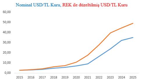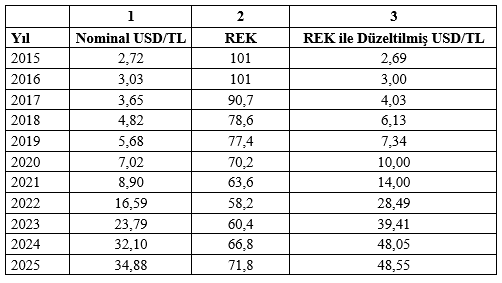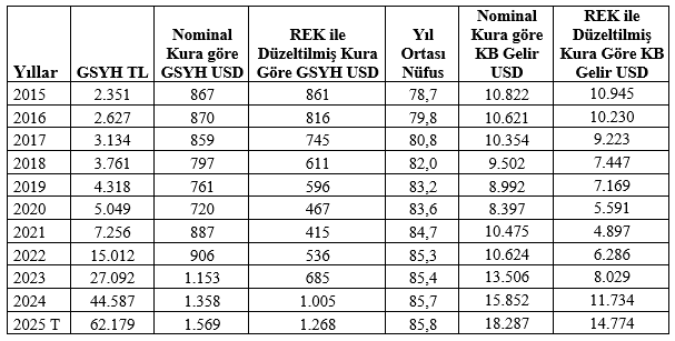 İktisat dünyasının önde gelen isimlerinden Dr. Mahfi Eğilmez, Türkiye ekonomisindeki mevcut makroekonomik verilerin yansıttığı refah düzeyinin ne kadar gerçekçi olduğunu tartışmaya açan yeni bir analiz yayımladı. Dr. Mahfi Eğilmez, kendisine ait blog sayfasında paylaştığı “Refah Artışı mı Kur İllüzyonu mu?” başlıklı makalesinde, Türkiye’de döviz kurlarının ekonomik gerçekleri hangi boyutta yansıttığına yönelik önemli tespitlerde bulundu. Eğilmez'in konuya ilişkin analizi şöyle oldu: "Bu analiz, Türkiye ekonomisinde uzun süredir tartışılan “döviz kurları gerçekliği ne ölçüde yansıtıyor” sorusuna yanıt aramayı amaçlamaktadır. Çalışmanın temel hedefi; yüksek faiz politikası ve sıcak para girişleriyle baskılanmış nominal döviz kurları yerine, TL’nin satın alma gücünü daha iyi yansıtan Reel Efektif Döviz Kuru (REK) temelli bir düzeltme yaklaşımı kullanarak, dolar cinsinden cari fiyatlarla gayrisafi yurtiçi hâsıla (GSYH) ve kişi başına gelirin alternatif görünümlerini ortaya koymaktır. Uluslararası karşılaştırmalarda yaygın biçimde kullanılan dolar cinsinden GSYH ve kişi başına gelir göstergeleri, nominal döviz kuru üzerinden hesaplanmaktadır. Ancak enflasyon oranının döviz kurundaki artışın üzerinde seyrettiği dönemlerde, nominal kurla ifade edilen dolar cinsinden GSYH olması gerekene göre yüksek görünmekte, bu durum, refah düzeyi ve ekonomik büyüklük algısında yanıltıcı izlenimler doğurabilmektedir. Nominal döviz kuru, bir ülke parasının başka bir para birimi cinsinden piyasa fiyatını ifade eder. Reel döviz kuru ise nominal kurun, ülkeler arasındaki fiyat düzeyi farkları dikkate alınarak düzeltilmiş hâlidir ve bir para biriminin satın alma gücü hakkında bilgi sunar. Türkiye Cumhuriyet Merkez Bankası (TCMB) tarafından hesaplanan Reel Efektif Döviz Kuru (REK), TL’nin dış ticarette önemli paya sahip 36 ülkenin para birimlerinden oluşan bir sepete karşı değerini, enflasyon farklarını dikkate alarak ölçmektedir. REK’in 100 olması, TL’nin baz yıl (2003) fiyat yapısına göre “normal” bir değerde olduğunu; 100’ün altındaki değerler TL’nin reel olarak düşük değerli, 100’ün üzerindeki değerler ise reel olarak yüksek değerli olduğunu ifade eder. Ancak REK bir denge kuru ya da olması gereken nominal kuru üretmez; yalnızca reel değerlenme veya değer kaybının yönü ve büyüklüğü hakkında bilgi veren analitik bir göstergedir. Aşağıdaki tabloda 1 numaralı sütunda son 11 yıla ait yıllık ortalama nominal USD/TL kurları, 2 numaralı sütunda yıllık ortalama REK endeks değerleri, 3 numaralı sütunda ise nominal kurların REK kullanılarak düzeltilmiş hâli yer almaktadır. Tablodaki nominal kur ve REK verileri TCMB’den alınmış, REK’e göre düzeltilmiş USD/TL kuru şu formül kullanılarak hesaplanmıştır: REK ile Düzeltilmiş USD/TL Kuru = (Nominal USD / TL Kuru x 100) / REK Tabloya göre 2015 yılında USD/TL REK değeri normal düzeye oldukça yakındır. Buna karşılık 2016’da nominal kur artmasına karşın REK’in 100’ün üzerinde kalması, TL’nin reel olarak hâlen görece değerli olduğunu göstermektedir. İzleyen yıllarda nominal USD/TL kuru kalıcı olarak düşük değerli görünmektedir. Bu tablonun 3 numaralı sütununda yer alan “REK ile Düzeltilmiş USD/TL” kurları tahmin değil, mevcut enflasyonun kur üzerindeki birikmiş baskının sayısal ifadesidir ve yüksek faiz politikasının nominal kur üzerinde oluşturduğu baskının, dolar cinsinden makro göstergelere nasıl yansıdığını analiz etmeyi amaçlamaktadır. Nominal USD/TL kuruyla REK ile düzeltilmiş USD/TL kurunu bir grafikte gösterelim: Nominal USD/TL kuru ile REK’e göre düzeltilmiş USD/TL kuru birlikte incelendiğinde, özellikle 2021 yılından itibaren iki seri arasındaki makasın dramatik biçimde açıldığı görülmektedir. Bu ayrışma, dolar cinsinden büyüme göstergelerinde ortaya çıkan algısal (kâğıt üzerindeki) büyümenin temel nedenini oluşturmaktadır. Bu noktada, GSYH ve kişi başına gelirin nasıl hesaplandığını hatırlatmak yararlı olacaktır: Bir yıla ait cari fiyatlarla GSYH, üretim yöntemiyle hesaplanırken nihai mal ve hizmetlerin cari yıl fiyatlarıyla toplanması suretiyle TL cinsinden bulunur. Bu hesaplama enflasyonu içerir. TL cinsinden bu şekilde hesaplanan GSYH, ilgili yılın nominal ortalama USD/TL kuru kullanılarak dolar cinsine çevrilir: GSYH (USD) = GSYH (TL) / USD/TL yıllık ortalama Enflasyon oranının, döviz kurundaki artışın üzerinde kaldığı dönemlerde TL cinsinden GSYH de dolar cinsinden GSYH de olduğundan yüksek görünür. Bu durum ekonomik gerçekliği tam olarak yansıtmasa da, kamuoyunda bir başarı algısı yaratılmasına zemin hazırlar. Dolar cinsinden GSYH’nin nüfusa bölünmesiyle de dolar cinsinden kişi başına gelir elde edilir: Kişi Başına Gelir (USD) = GSYH (USD) / Nüfus GSYH’nin yukarıda açıklandığı biçimde yüksek görünmesi, kişi başına gelirin de olduğundan yüksek hesaplanmasına yol açar. Ayrıca sığınmacı nüfus, resmi nüfus istatistiklerine dâhil edilmediği için kişi başına gelirin daha da yüksek görünmesine neden olur. Bu durumu somutlaştırmak amacıyla, hesapları büyük ölçüde kesinleşmiş olan 2024 yılı verilerini ele alalım. 2024 yılı için mevcut veriler şöyledir: GSYH 44.587 milyar TL, USD/TL yıllık ortalaması 32,10 ve nüfus 85,7 milyon kişidir. Buna göre yukarıdaki formüller kullanılarak şu sonuçlara ulaşılır: GSYH: 1.358 milyar dolar ve Kişi Başına Gelir: 15.852 dolar Şimdi bu değerleri, REK’e göre düzeltilmiş kurları kullanılarak hesaplanan alternatif sonuçlarla karşılaştıralım. Aşağıdaki tabloda, nominal kura ve REK’e dayalı alternatif kura gör