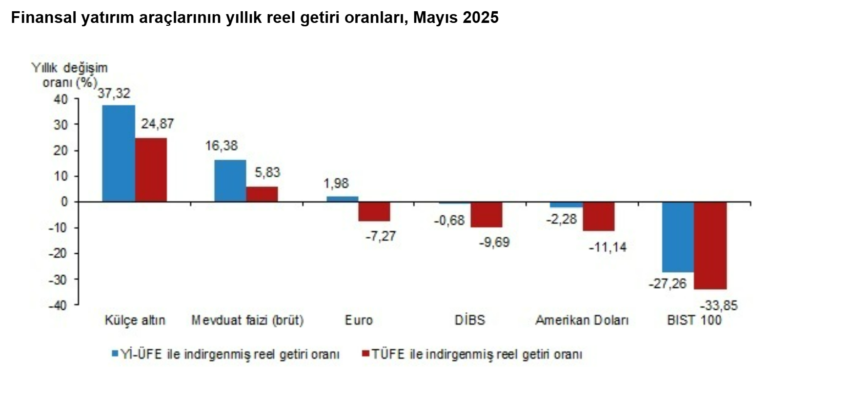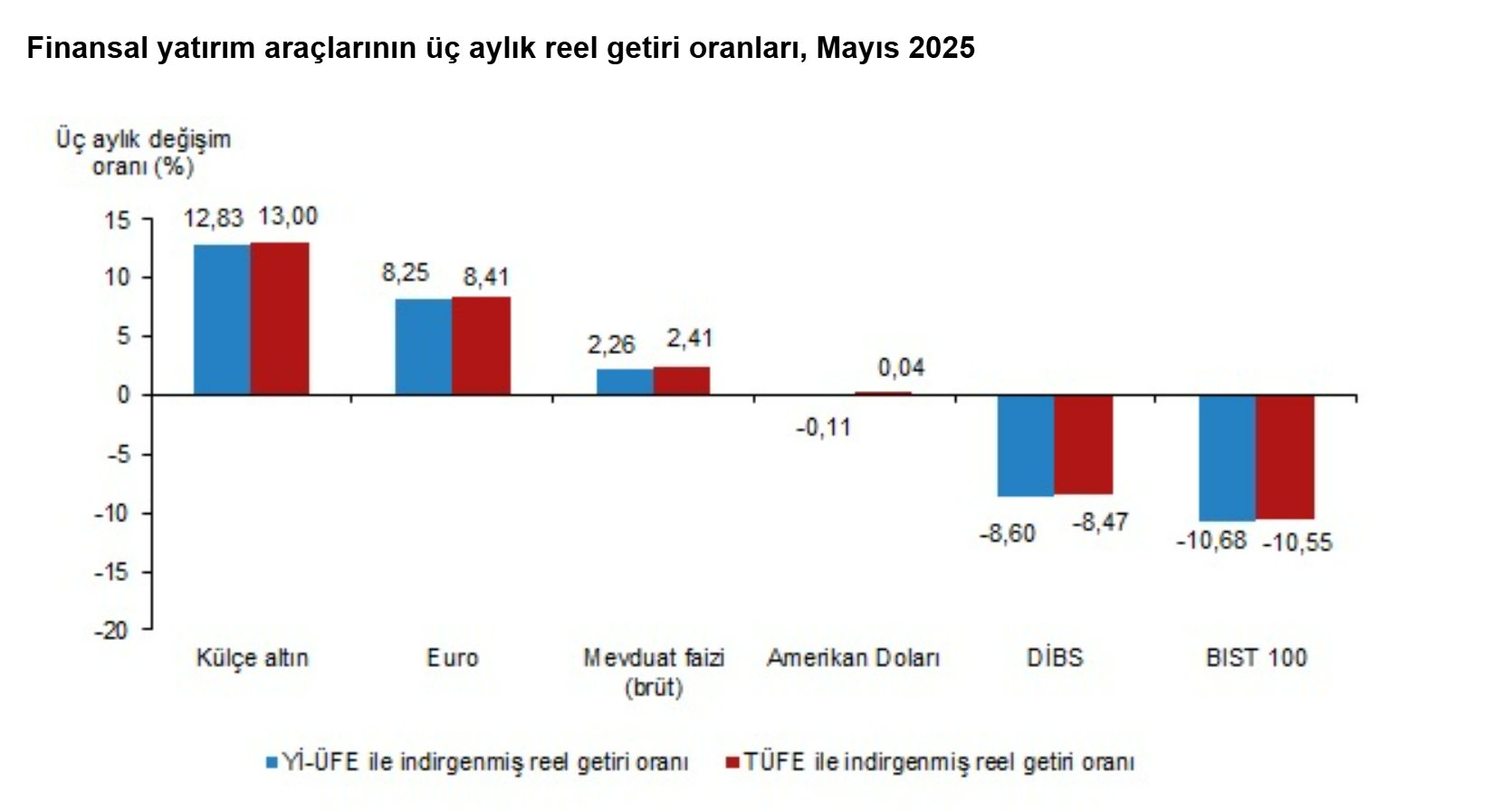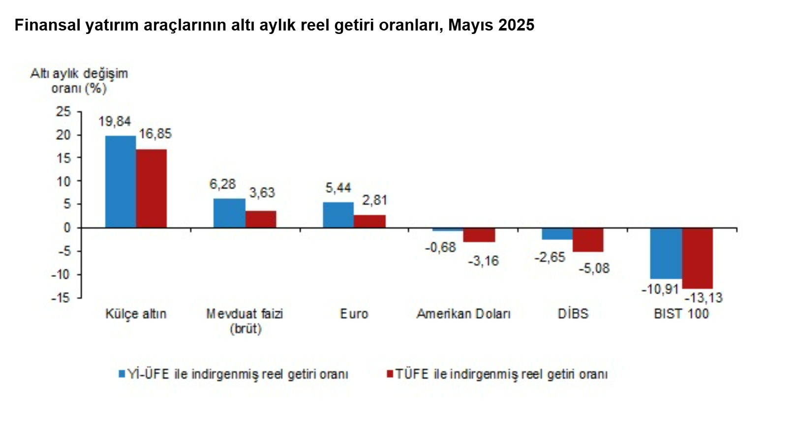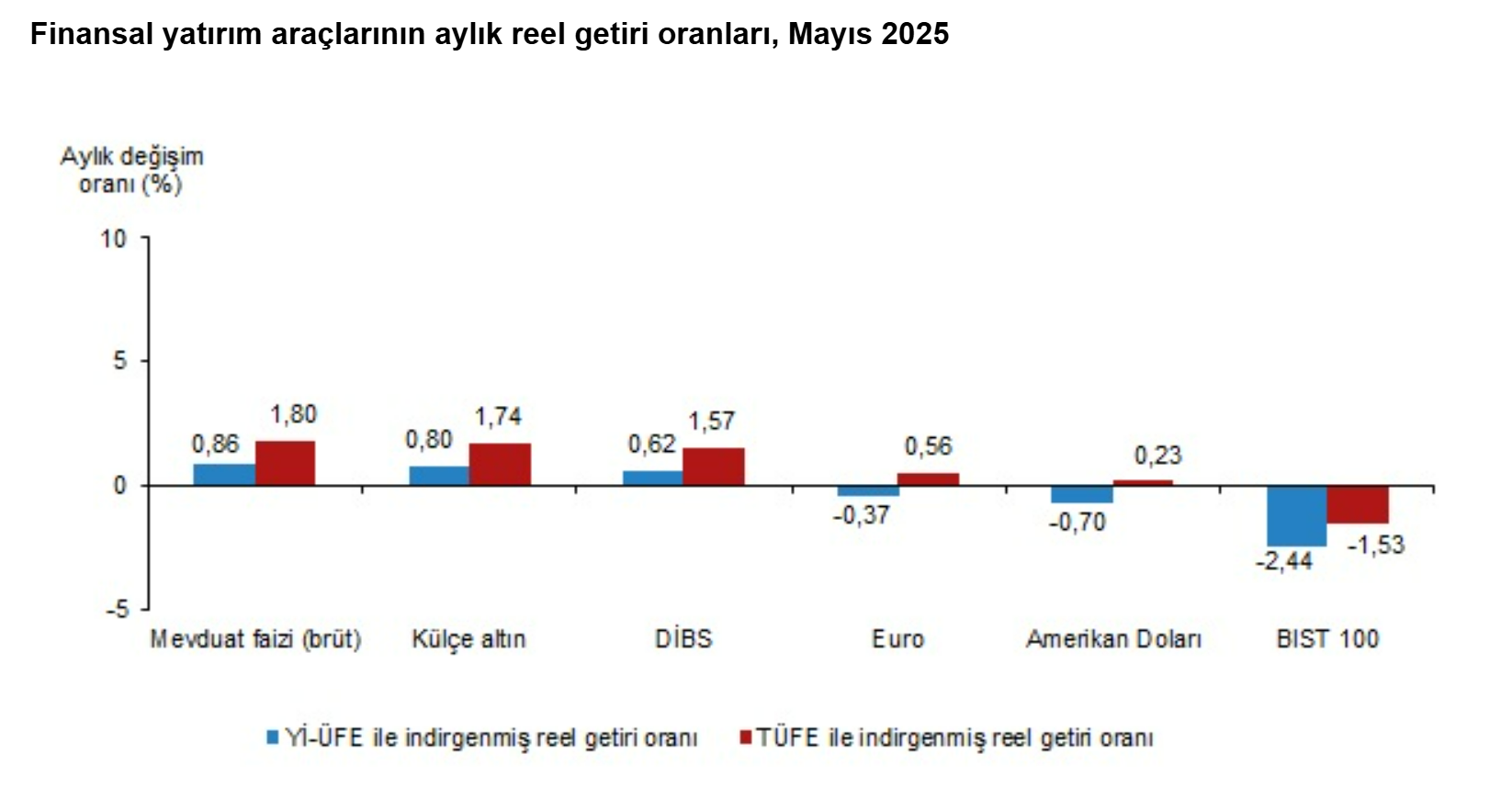 Türkiye İstatistik Kurumu (TÜİK), mayıs ayında enflasyon ile indirgendiğinde en yüksek reel getirinin mevduat faizinde gerçekleştiğini hesapladı. Türkiye İstatistik Kurumu (TÜİK), mayıs ayına ilişkin finansal yatırım araçlarının reel getiri oranlarını açıkladı. Aylık en yüksek reel getiri, yurt içi üretici fiyat endeksi (Yİ-ÜFE) ile indirgendiğinde %0,86, tüketici fiyat endeksi (TÜFE) ile indirgendiğinde ise %1,80 oranlarıyla mevduat faizinde (brüt) gerçekleşti. Yİ-ÜFE ile indirgendiğinde; yatırım araçlarından külçe altın %0,80 ve Devlet İç Borçlanma Senetleri (DİBS) %0,62 oranlarında yatırımcısına reel getiri sağlarken; Euro %0,37, Amerikan Doları %0,70 ve BIST 100 endeksi %2,44 oranlarında yatırımcısına kaybettirdi. TÜFE ile indirgendiğinde ise; külçe altın %1,74, DİBS %1,57, Euro %0,56 ve Amerikan Doları %0,23 oranlarında yatırımcısına reel getiri sağlarken; BIST 100 endeksi %1,53 oranında yatırımcısına kaybettirdi. Kaynak: TÜİK Külçe altın, üç aylık değerlendirmede; Yİ-ÜFE ile indirgendiğinde %12,83, TÜFE ile indirgendiğinde ise %13,00 oranlarında yatırımcısına en yüksek reel getiri sağlayan yatırım aracı oldu. Aynı dönemde BIST 100 endeksi, Yİ-ÜFE ile indirgendiğinde %10,68, TÜFE ile indirgendiğinde ise %10,55 oranlarında yatırımcısına en çok kaybettiren yatırım aracı oldu. Kaynak: TÜİK Altı aylık değerlendirmeye göre külçe altın; Yİ-ÜFE ile indirgendiğinde %19,84, TÜFE ile indirgendiğinde ise %16,85 oranlarında yatırımcısına en yüksek reel getiri sağlayan yatırım aracı olurken; aynı dönemde BIST 100 endeksi, Yİ-ÜFE ile indirgendiğinde %10,91, TÜFE ile indirgendiğinde ise %13,13 oranlarında yatırımcısına en çok kaybettiren yatırım aracı oldu. Kaynak: TÜİK Finansal yatırım araçları yıllık olarak değerlendirildiğinde külçe altın; Yİ-ÜFE ile indirgendiğinde %37,32, TÜFE ile indirgendiğinde ise %24,87 oranlarında yatırımcısına en yüksek reel getiri sağlayan yatırım aracı oldu. Yıllık değerlendirmede, Yİ-ÜFE ile indirgendiğinde; yatırım araçlarından mevduat faizi (brüt) %16,38 ve Euro %1,98 oranlarında yatırımcısına reel getiri sağlarken; DİBS %0,68, Amerikan Doları %2,28 ve BIST 100 endeksi %27,26 oranlarında yatırımcısına kaybettirdi. TÜFE ile indirgendiğinde ise mevduat faizi (brüt) %5,83 oranında yatırımcısına reel getiri sağlarken; Euro %7,27, DİBS %9,69, Amerikan Doları %11,14 ve BIST 100 endeksi %33,85 oranlarında yatırımcısına kaybettirdi. Kaynak: TÜİK [news_id:773516] [news_id:773307]