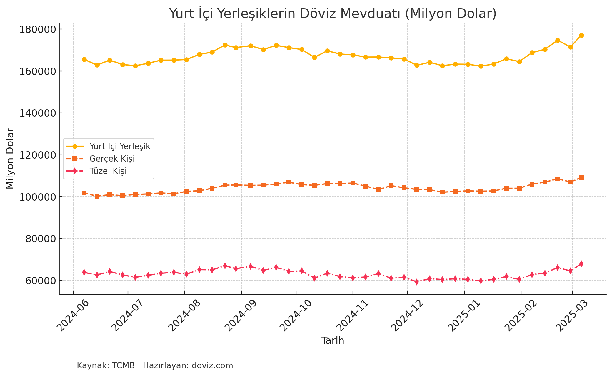 TCMB verilerine göre yurt içi yerleşiklerin döviz mevduatı son bir haftada 5,6 milyar dolar artış kaydetti. Bu dönemde gerçek ve tüzel kişilerin alımlarını hızlandırdığı görüldü. Türkiye Cumhuriyet Merkez Bankası (TCMB) tarafından açıklanan verilere göre yurt içi yerleşiklerin döviz mevduatı son bir haftada 5 milyar 637,41 milyon dolar artış kaydetti. Böylelikle gerçek ve tüzel kişilerin toplam döviz mevduatı 177 milyar 130,93 milyon dolara yükseldi. Gerçek kişilerin döviz mevduatları bir önceki haftaya kıyasla 2 milyar 177,68 milyon dolar artarak 109 milyar 153,82 milyon dolar olurken, tüzel kişilerin döviz mevduatı ise 3 milyar 459,70 milyon dolar yükselişle 67 milyar 977,11 milyon dolara ulaştı. Parite etkisi göz önüne alındığında ise yurt içi yerleşiklerin toplam yabancı para mevduatı 2 milyar 494,25 milyon dolar artış gösterdi. Bu dönemde, gerçek kişilerin parite etkisinden arındırılmış döviz mevduatları 284,90 milyon dolar artarken, tüzel kişilerin döviz mevduatları 2 milyar 209,34 milyon dolar yükseliş kaydetti. Veriler ise döviz talebindeki yükselişin hem bireysel yatırımcılar hem de şirketler nezdinde hız kazandığına işaret etti. [news_id:765447] TCMB'nin döviz rezervleri 3 milyar dolar arttı Öte yandan ilgili haftada TCMB’nin döviz rezervlerinde de 3 milyar dolarlık artış gerçekleşti. TCMB haftalık verilerine göre 7 Mart ile sona eren haftada döviz rezervleri 3 milyar 45 milyon dolar artarak 94 milyar 757 milyon dolardan 97 milyar 802 milyon dolara çıktı. [news_id:765693]