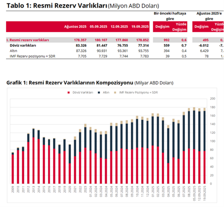 Türkiye Cumhuriyet Merkez Bankası'nın toplam rezervleri 19 Eylül haftasında yüzde 0,6 artarak 178,9 milyar dolara yükseldi. Türkiye Cumhuriyet Merkez Bankası’nın (TCMB) Uluslararası Rezervler ve Döviz Likiditesi verileri yayımlandı. TCMB haftalık verilerine göre 19 Eylül itibarıyla toplam rezervler yüzde 0,6 artarak 178,9 milyar dolara çıktı. İlgili haftada döviz varlıkları bir önceki haftaya göre %0,7 artarak 77,3 milyar dolar, altın cinsinden rezerv varlıkları %0,4 artarak 93,8 milyar dolar, IMF rezerv pozisyonu ve SDR toplamı ise %0,5 artarak 7,8 milyar dolar oldu. Merkez Bankası rezervleri son olarak 5 Eylül haftasında 180,1 milyar dolarla rekor tazelemişti. Kaynak: TCMB [news_id:786058]