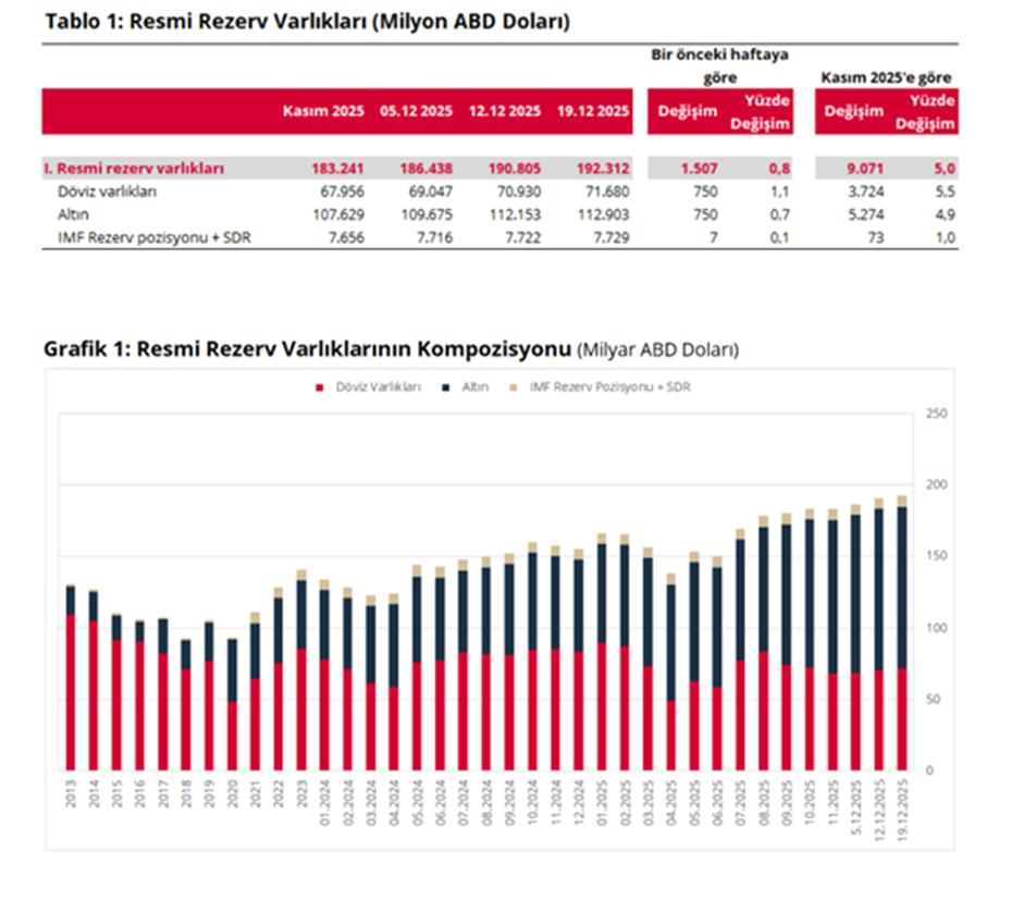 Türkiye Cumhuriyet Merkez Bankası'nın toplam rezervleri 1,5 milyar dolar artışla 192,3 milyar dolara yükseldi. Türkiye Cumhuriyet Merkez Bankası’nın (TCMB) Uluslararası Rezervler ve Döviz Likiditesi verileri yayımlandı. TCMB haftalık verilerine göre 19 Aralık itibarıyla toplam rezervler yüzde 0,8 artarak 192,3 milyar dolara çıktı. İlgili haftada döviz varlıkları bir önceki haftaya göre %1,1 artarak 71,7 milyar dolar, altın cinsinden rezerv varlıkları %0,7 artarak 112,9 milyar dolar, IMF rezerv pozisyonu ve SDR toplamı ise %0,1 artarak 7,7 milyar dolar oldu. Merkez Bankası rezervleri 17 Ekim haftasında tüm zamanların zirvesini 198,4 milyar dolara taşımıştı. Kaynak: TCMB [news_id:796204]