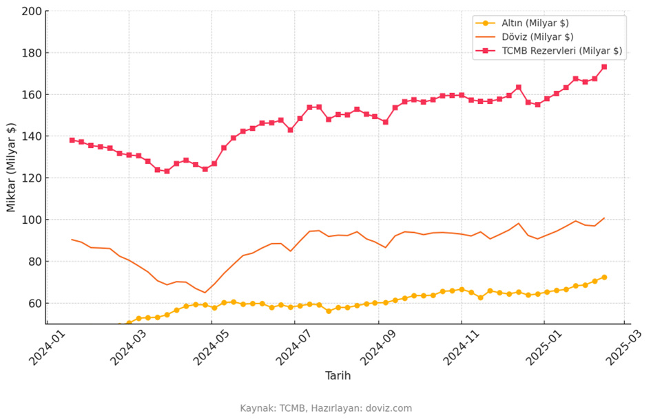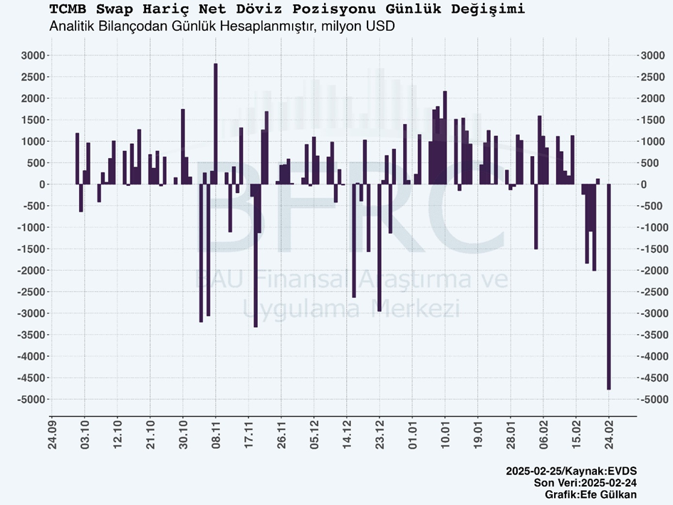 Bahçeşehir Üniversitesi Finansal Araştırma ve Uygulama Merkezi, rezervlerini tüm zamanların en yüksek seviyesine çıkaran TCMB’nin son bir ayda topladığı dövizi bir haftada sattığını bildirdi. Merkez Bankası toplam rezervleri, 14 Şubat haftasında 173,2 milyar dolara, swap hariç net rezervleri de 71,5 milyar dolara çıkarak rekor kırmıştı. İlgili dönemde bankanın brüt döviz rezervleri 3 milyar 748 milyon dolar artışla 100 milyar 677 milyon dolara çıkarken, altın rezervleri ise 1 milyar 912 milyon dolar artışla 72 milyar 475 milyon dolara yükselmişti. Merkez Bankası rezervlerindeki bu yükselişin ardından rezervlerdeki satış yönlü hareket ise dikkati çekmeye başladı. Özellikle geçen haftadan itibaren net döviz pozisyonunda yaşanan gerileme, piyasalarda yakından takip edilen gelişmeler arasında yer aldı. Bir ayda toplanan döviz bir haftada eridi Bahçeşehir Üniversitesi Finansal Araştırma ve Uygulama Merkezi (BFRC) de bugün yayımladığı notta, “TCMB’nin swap hariç net döviz pozisyonu 24 Şubat günü 4,8 milyar USD bozulmayla 51,5 milyar USD seviyesine geriledi. Bununla beraber son 1 ayda toparlanan döviz pozisyonunun bir haftada eridiğini görüyoruz. Ayrıca hesaplamalarımıza göre TCMB’nin 24 Şubat’ta günlük net döviz satım miktarı (piyasaya sattığı miktar) 5,1 milyar USD. Bu da bize geçtiğimiz cuma günü yaşanan kur atağında, valörlü işlem yapıldığı ihtimalini gösteriyor. Yani cuma günü yapılan müdahalenin pazartesi günü mahsuplaştığını görüyoruz.” ifadelerini kullandı. Kaynak: BFRC Döviz satışının olası nedenleri Prof. Dr. Hakan Kara ise Merkez Bankası’nın döviz satışının olası nedenlerini şöyle sıraladı: 1) Merkez Bankasının tahminini artırması, 2) Enflasyondaki düşüşün sınırlı olacağının anlaşılması ile sabit getirili TL varlıklarda kar satışı, 3) Risk iştahını azaltan yerel ve küresel gelişmeler, 4) KKM’den çıkışın hızlanması, 5) Mevsimsel dış açık. [news_id:762564]