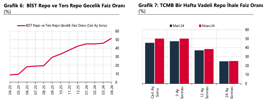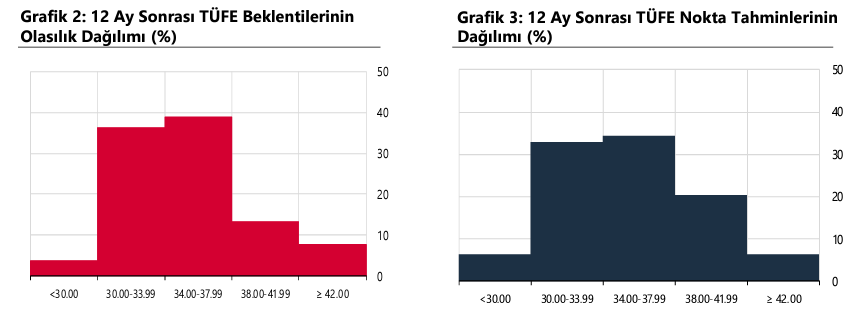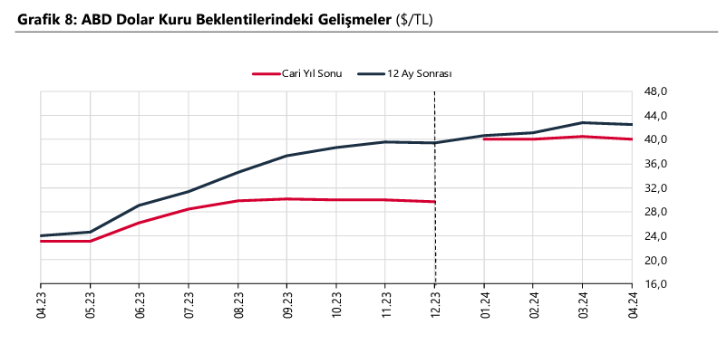 Türkiye Cumhuriyet Merkez Bankası Piyasa Katılımcıları Anketi'ne göre yıl sonu dolar kuru tahmini 40,01 lira, enflasyon beklentisi ise yüzde 44,16 oldu. Merkez Bankası (TCMB), nisan ayı Piyasa Katılımcıları Anketi'nin sonuçlarını yayımladı. Buna göre, katılımcıların 2024 yıl sonu dolar/TL beklentisi 40,01 TL olurken 12 ay sonrası döviz kuru beklentisi ise aynı anket döneminde 42,47 TL olarak belirlendi. Kaynak: TCMB Piyasa Katılımcıları Anketi Faiz beklentisi Katılımcıların BİST Repo ve Ters-Repo Pazarı’nda oluşan cari ay sonu gecelik faiz oranı beklentisi de yılın dördüncü anketinde yüzde 51,43 oldu. TCMB bir hafta vadeli repo ihale faiz oranı cari ay sonu beklentisi de aynı anket döneminde yüzde 50,00 olarak belirlendi. Kaynak: TCMB Piyasa Katılımcıları Anketi Enflasyon beklentisi Katılımcıların cari yıl sonu tüketici enflasyonu (TÜFE) beklentisi de bu anket döneminde yüzde 44,16 seviyesinde ölçüldü. Öte yandan 12 ay sonrası TÜFE beklentisi yüzde 35,17, 24 ay sonrası TÜFE beklentisi ise yüzde 22,67 ve 22,05 olarak belirlendi. Kaynak: TCMB Piyasa Katılımcıları Anketi [news_id:730487]