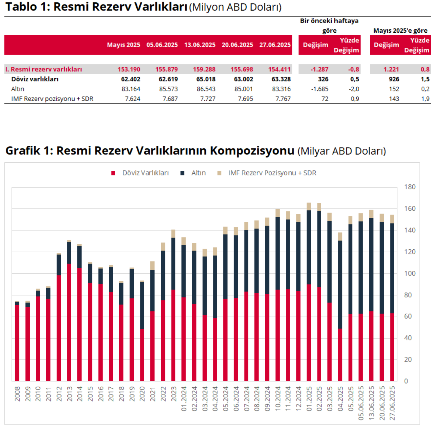 Türkiye Cumhuriyet Merkez Bankası'nın rezervleri 27 Haziran itibarıyla %0,8 azalarak 154,4 milyar dolara geriledi. Türkiye Cumhuriyet Merkez Bankası’nın (TCMB) Uluslararası Rezervler ve Döviz Likiditesi verileri yayımlandı. TCMB haftalık verilerine göre 27 Haziran itibarıyla toplam rezervler yüzde 0,8 azalışla 154,4 milyar dolara indi. İlgili haftada döviz varlıkları bir önceki haftaya göre %0,5 artarak 63,3 milyar dolar, altın cinsinden rezerv varlıkları %2,0 azalarak 83,3 milyar dolar, IMF rezerv pozisyonu ve SDR toplamı ise %0,9 artarak 7,8 milyar dolar oldu. Kaynak: TCMB [news_id:777515]