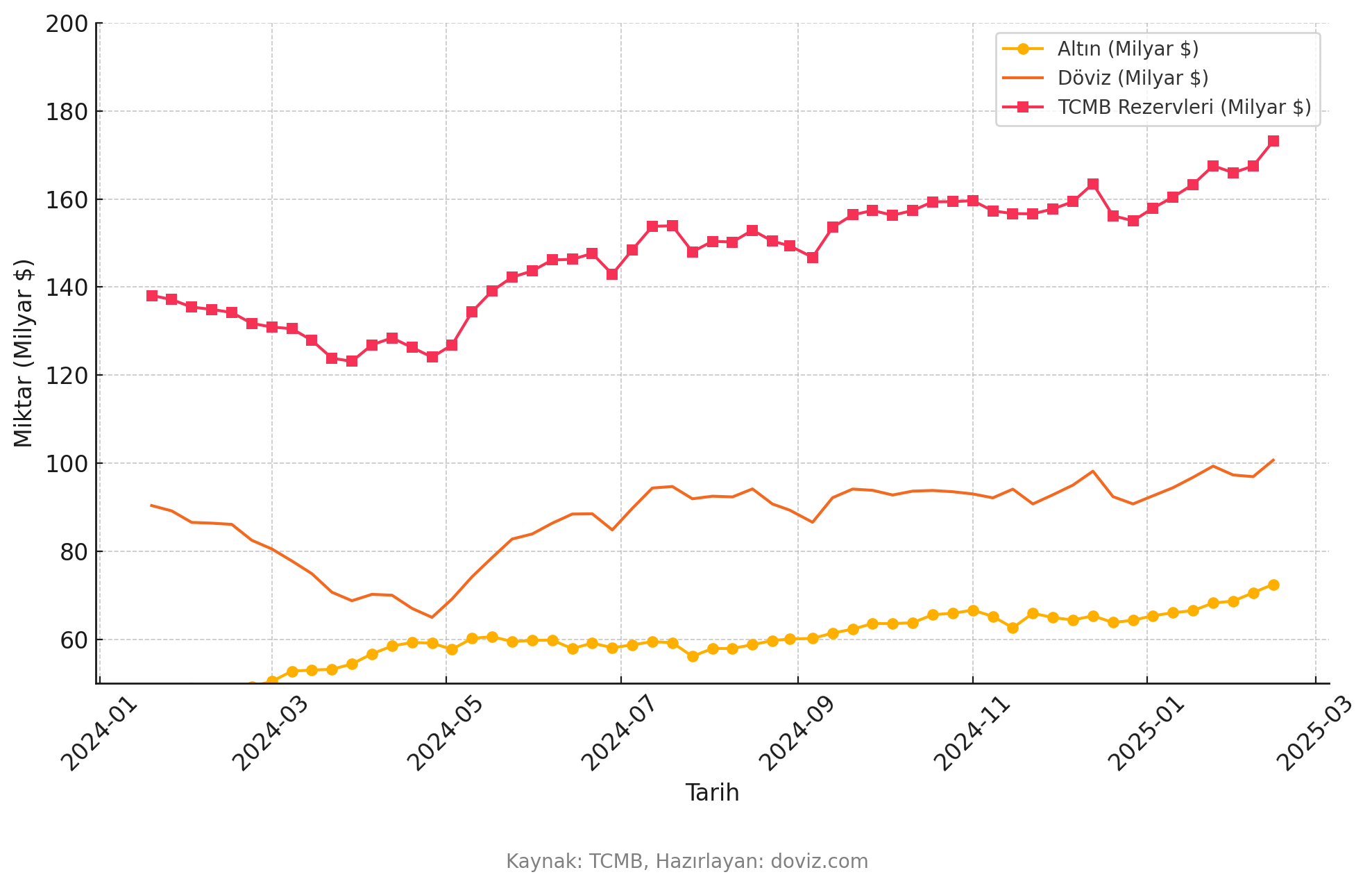 Türkiye Cumhuriyet Merkez Bankası (TCMB) rezervleri geçtiğimiz hafta 5,66 milyar dolarlık artışla tüm zamanların zirvesine çıktı. Türkiye Cumhuriyet Merkez Bankası (TCMB), haftalık para ve banka istatistiklerini açıkladı. TCMB verilerine göre 14 Şubat haftasında toplam brüt rezervi 5,66 milyar dolar artışla 173,152 milyar dolara yükseldi. Önceki hafta brüt rezerv 167,492 milyar dolar seviyesindeydi. Toplam rezervdeki yeni tutar ise tüm zamanların rekor seviyesi olarak kayıtlara geçti. Toplam rezervde son rekor 24 Ocak haftasında 167,560 milyar dolar düzeyinde gerçekleşmişti. Döviz ve altın rezervlerinde artış İlgili haftada döviz rezervi 96,929 milyar dolardan 100,677 milyar dolara, altın rezervi ise 70,563 milyar dolardan 72,475 milyar dolara çıktı. Bir önceki hafta 72 milyar 332 milyon dolar olan net uluslararası rezervler ise söz konusu haftada 78 milyar 160 milyon dolara yükseldi. [news_id:761733]