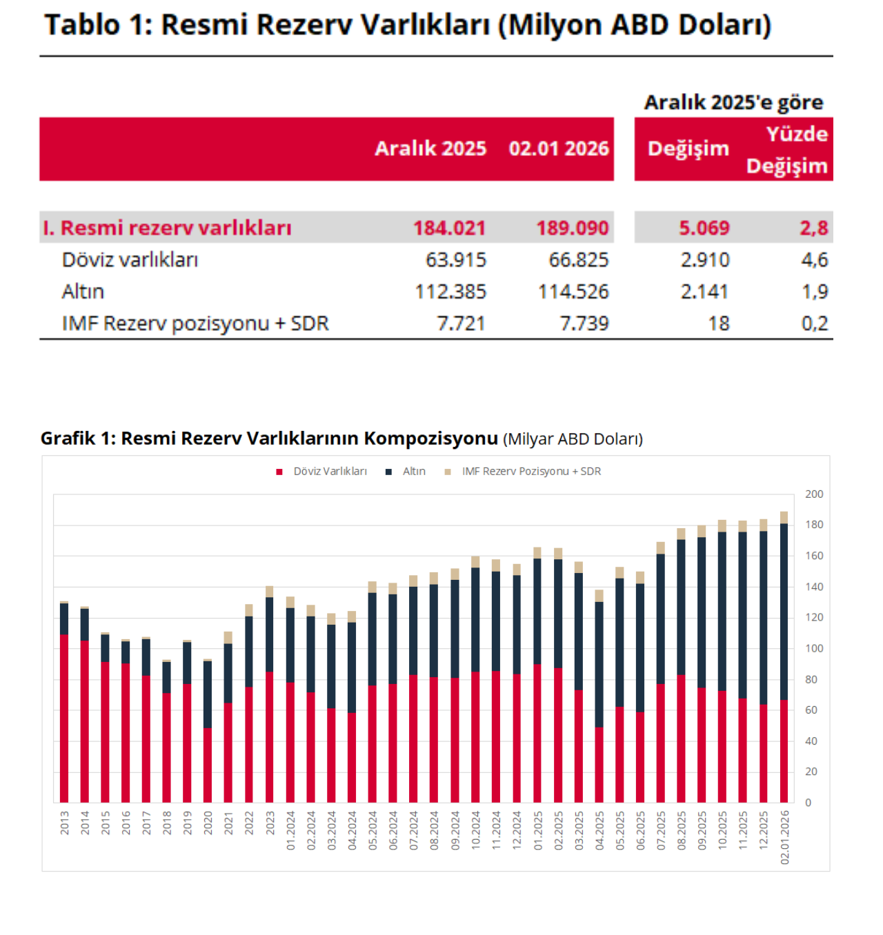 Türkiye Cumhuriyet Merkez Bankası'nın toplam rezervleri 4,8 milyar dolar azalışla 189,1 milyar dolara geriledi. Türkiye Cumhuriyet Merkez Bankası’nın (TCMB) Uluslararası Rezervler ve Döviz Likiditesi verileri yayımlandı. TCMB verilerine göre 2 Ocak itibarıyla toplam rezervler 4,8 milyar dolar azalışla 189,1 milyar dolara indi. TCMB rezervleri 26 Aralık haftasında 193,9 milyar dolar seviyesindeydi. İlgili dönemde TCMB'nin döviz varlıkları geçen 66,8 milyar dolar, altın cinsinden rezerv varlıkları 114,5 milyar dolar, IMF rezerv pozisyonu ve SDR toplamı ise 7,7 milyar oldu. Merkez Bankası rezervleri 17 Ekim 2025 haftasında 198,4 milyar dolarla rekor kırmıştı. Kaynak: TCMB