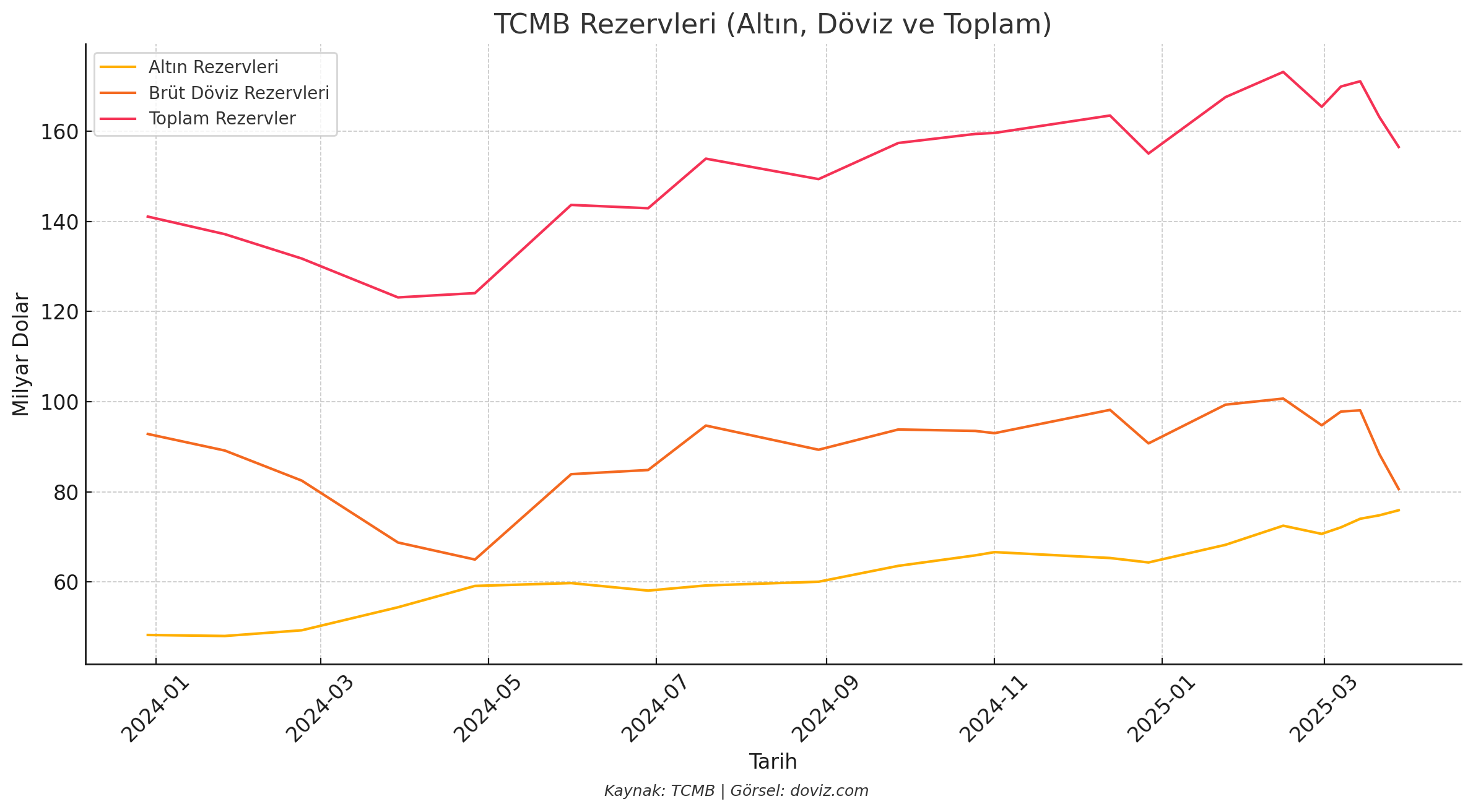 Türkiye Cumhuriyet Merkez Bankası (TCMB) toplam rezervleri 28 Mart haftasında bir önceki haftaya kıyasla 6,6 milyar dolar azalış kaydetti. TCMB, haftalık para ve banka istatistiklerini açıkladı. Buna göre, 28 Mart itibarıyla Merkez Bankası brüt döviz rezervleri 7 milyar 719 milyon dolar azalışla 80 milyar 609 milyon dolara indi. Brüt döviz rezervleri, 21 Mart'ta 88 milyar 328 milyon dolar seviyesinde bulunuyordu. Bu dönemde altın rezervleri ise 1 milyar 117 milyon dolar artışla 74 milyar 785 milyon dolardan 75 milyar 902 milyon dolara yükseldi. Böylece Merkez Bankasının toplam rezervleri, 28 Mart haftasında bir önceki haftaya göre 6 milyar 603 milyon dolar azalışla 163 milyar 114 milyon dolardan 156 milyar 511 milyon dolara geriledi. TCMB rezervleri Aralık 2023'ten bu yana şöyle (milyar dolar): Kaynak: TCMB