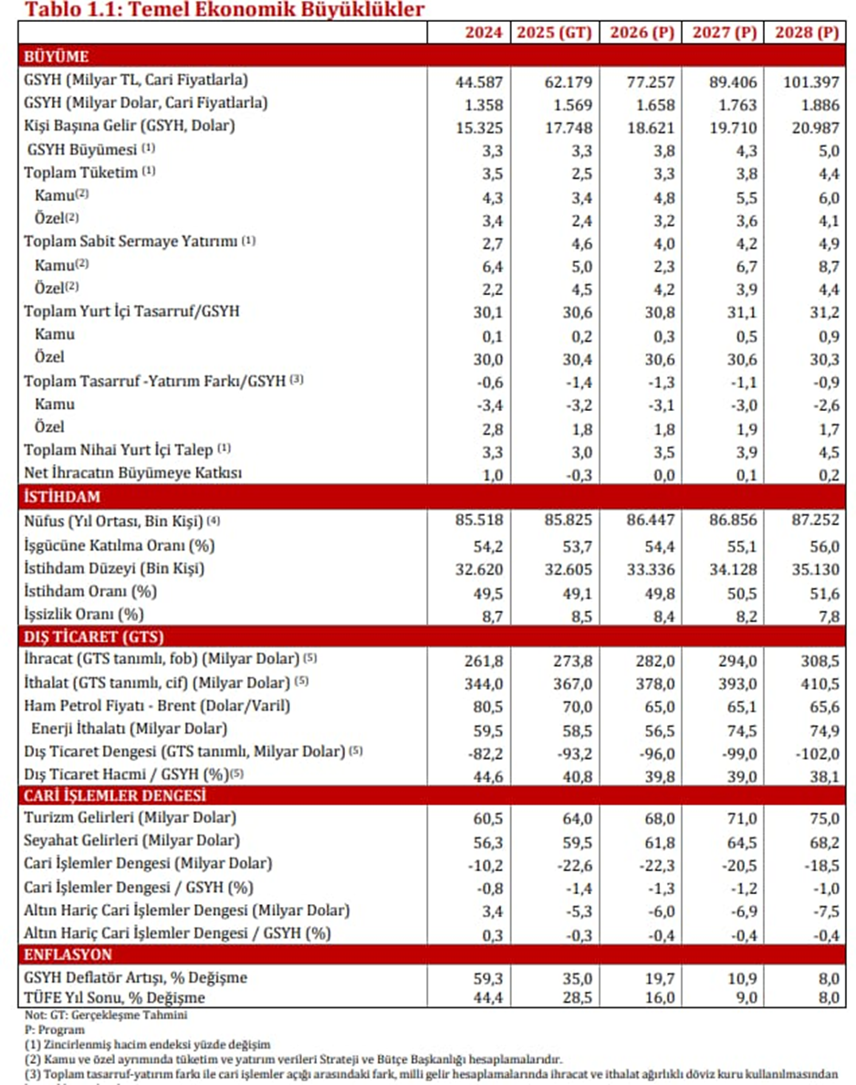2026-2028 yıllarına ilişkin enflasyon, istihdam ve büyüme gibi temel makroekonomik hedeflerin yer aldığı Orta Vadeli Program Resmi Gazete’de yayımlandı. Hazine ve Maliye Bakanlığı ile Strateji ve Bütçe Başkanlığınca hazırlanan ve 2026-2028 dönemini kapsayan OVP ile temel ekonomik büyüklükler ve hedefler belirlendi. Resmi Gazete’de yayımlanan karara göre önceki OVP’de yüzde 17,52 olarak belirlenen 2025 enflasyonu hedefi yüzde 28,5’e yükseltildi, 2026 için ise önceden yüzde 9,7 olan hedef yüzde 16’ya çıkartıldı. 2027 için belirlenen enflasyon yüzde 9, 2028 için belirlenen enflasyon hedefi de yüzde 8 olarak belirlendi. Büyüme hedefleri düştü 2025 için yüzde 4 olan büyüme öngörüsü 3,3 olarak revize edilirken 2026 büyüme hedefi yüzde 4,5 seviyesinden yüzde 3,8’e düştü. Yüzde 5 olarak belirlenen 2027 büyüme hedefi de yeni OVP’de 4,3 oldu. 2028 büyüme hedefi ise yüzde 5 olarak belirlendi. Kişi başına milli gelir hedefleri Milli gelirin 2025'te 1 trilyon 569 milyar dolar, 2026'da 1 trilyon 658 milyar dolar, 2027'de 1 trilyon 763 milyar lira, 2028'de de 1 trilyon 886 milyar dolar olması hedeflendi. Kişi başına düşen gelirin 2025 için 17 bin 748, 2026 için 18 bin 621 dolar, 2027 için 19 bin 710 dolar, 2028 için 20 bin 987 dolar olacağı öngörüldü. İşsizlik hedefleri İşsizlik oranı hedefi 2025 için 8,5, 2026 için yüzde 8,4, 2027 için yüzde 8,2, 2028 için yüzde 7,8 oldu. Programda cari denge ile ilgili 2026'da 22,3 milyar dolarlık açık tahmini yapıldı. 2027'de açığın 20,5 milyar dolara, 2028'de ise 18,5 milyar dolara gerilemesi öngörüldü. 2026'da cari açığın milli gelire oranının yüzde 1,3, 2027'de yüzde 1,2, 2028'de ise yüzde 1 olacağı tahmin edildi. İhracat ve ithalat hedefleri İhracatta 2026 hedefi 282 milyar dolar, 2027 hedefi 294 milyar dolar, 2028 hedefi 308,5 milyar dolar oldu. İthalat hedefi 2026 için 378 milyar dolar, 2027 için 393 milyar dolar, 2028 için 410 milyar dolar olarak tahmin edildi. Dolar kuru tahminleri Dolar kuru tahminlerinin yıl ortalaması ise yeni OVP'de şöyle belirlendi: • 2025: 39,63 (artış +%20,7) • 2026: 46,60 (artış +%17,6) • 2027: 50,71 (artış +%8,8) • 2028: 53,76 (artış +%6,0) Kaynak: Resmi Gazete Mesleki eğitime öncelik verilecek OVP'de "beşeri sermayenin güçlendirilmesi" başlığında ise şu maddeler yer aldı: “- Kaliteli okul öncesi eğitime erişimi kolaylaştırmak üzere ekonomik ve sosyal gelişmişlik düzeyleri dikkate alınarak hedef grupların ihtiyaçlarına göre farklı modeller geliştirilecektir - Erken yaşlarda bireylerin yetenek ve kapasitelerinin keşfedilerek bilim, teknoloji ve meslekikariyer alanlarında uygun kabiliyetleri geliştirebileceği alanlara yönlendirilmesini sağlayacak programlar geliştirilecektir. Ortaokul ve lise düzeyinde geliştirilecek mesleki ilgi, değer ve be renciler kendilerine uygun mesleklere yönlendirilecektir. - Ortaöğretim öğrencilerinin eğitim süresi içinde mesleki eğitim merkezlerine kayıt olarak mesleki beceriler edinmelerinin sağlanması amacıyla çerçeve öğretim programı hazırlanacak ve ilgili mevzuatta düzenleme yapılacaktır. Kullanılmayan tarım arazileri kiralanacak - Kullanılmayan tarım arazilerinin üretime kazandırılması amacıyla üst üste iki yıl işlenmeyen tarım arazileri coğrafi bilgi sistemleri kullanılarak belirlenecek ve şartları uygun çiftçilere kiralanması sağlanacaktır. - Tarım ve sanayi etkileşiminin güçlendirilmesi amacıyla sözleşmeli üretim desteklenerek yaygınlaştırılacak ve katma değeri yüksek tarımsal ürünlerin üretimi, işlenmesi ve pazarlanmasına yönelik entegre yatırım modelleri teşvik edilecektir. Güvenceli esnek çalışma - İşgücü piyasasının sektörel dönüşümlerle değişen ihtiyaçlarına uyum sağlamak, kadın erkek fırsat eşitliğini güçlendirmek ve iş yaşam dengesini korumak amacıyla yeni nesil çalışma biçimlerine yönelik düzenlemeler hayata geçirilerek, güvenceli esneklik geliştirilecek, işgücünün yeşil ve dijital dönüşümün gerekliliklerine uyumu artırılarak sürdürülebilir istihdam yapısı desteklenecektir. Dijital Türk lirası - Ödeme ve elektronik para kuruluşlarının verimliliklerini ve rekabet güçlerini artırmak amacı ile bulut bilişim kullanım imkânları iyileştirilecek ve yaygınlaştırılacaktır. Dijital Türk lirasının iktisadi, hukuki ve güvenlik boyutları ele alınarak kullanıma sunulması ve yaygınlaştırılmasına yönelik çalışmalar yürütülecektir. Öğrencilere bireysel emeklilik - Yükseköğretim kurumlarına kayıtlı 25 yaş altı öğrencilerin BES’e katılımlarını ve sistemde kalmalarını teşvik edici uygulamalar hayata geçirilecektir. Yatırım fonlu birikimli hayat sigortaları yaygınlaştırılacaktır. Finansal eğitim faaliyetleri yaygınlaştırılarak finansal okuryazarlık artırılacaktır.” [news_id:783670]