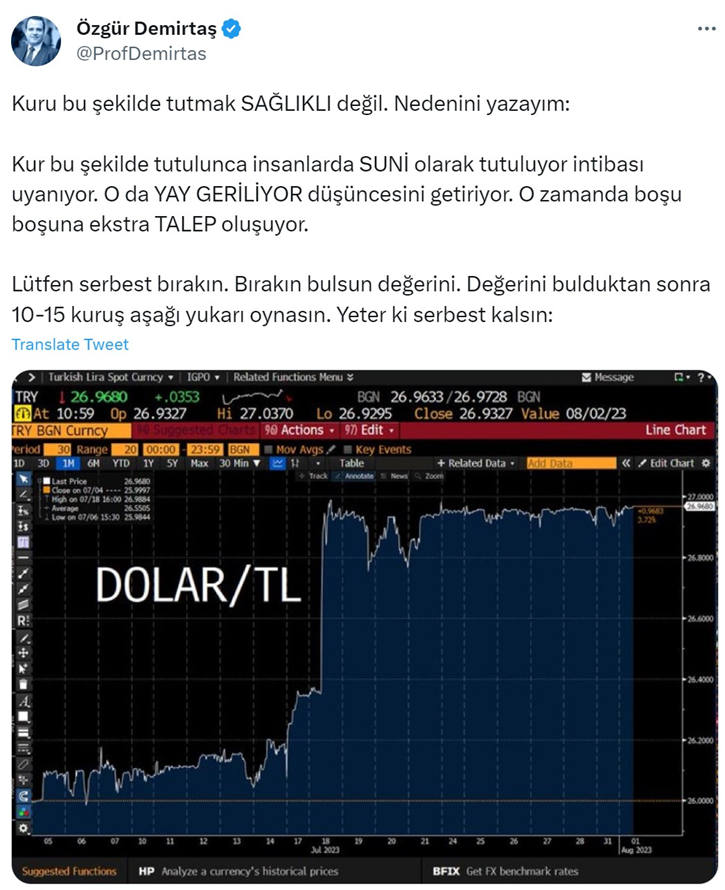Ekonomist Özgür Demirtaş, dolar kurunun 27, euro kurunun ise 30 lira seviyesinde uzun süredir yatay bir seyir izlemesi sonrasında, döviz kurlarının serbest bırakılması çağrısında bulundu. Özgür Demirtaş, sosyal medya hesabından yaptığı paylaşımda, şu ifadeleri kullandı: "Kuru bu şekilde tutmak sağlıklı değil. Nedenini yazayım: Kur bu şekilde tutulunca insanlarda suni olarak tutuluyor intibası uyanıyor. O da yay geriliyor düşüncesini getiriyor. O zamanda boşu boşuna ekstra talep oluşuyor. Lütfen serbest bırakın. Bırakın bulsun değerini. Değerini bulduktan sonra 10-15 kuruş aşağı yukarı oynasın. Yeter ki serbest kalsın." Kaynak: Özgür Demirtaş - Twitter Dolar kuru bu gelişmelerin ortasında 26,95 seviyesinden, euro kuru da 29,60 seviyesinden fiyatlanıyor. [news_id:702521]