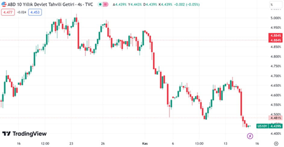 ABD'de enflasyonun ekimde beklenenden fazla yavaşlaması sonrasında Fed’in faiz artırımlarında sona gelmiş olabileceğine yönelik beklentilerin güçlenmesiyle varlık fiyatlarında oynaklık arttı. Bu kapsamda euro/TL gün içi işlemlerde tarihinde ilk kez 31,20 seviyesine ulaştı. ABD’de açıklanan enflasyon verileri, Fed'in enflasyonla mücadelesinde ilerleme kaydettiğine yönelik iyimserliğin artmasına yol açtı. Dün açıklanan verilere göre Tüketici Fiyat Endeksi (TÜFE) ekimde aylık bazda değişim göstermezken, yıllık bazda yüzde 3,2 artışla piyasa beklentilerinin altında kalmıştı. Değişken enerji ve gıda fiyatlarını içermeyen çekirdek TÜFE de ekimde aylık yüzde 0,2 ve yıllık yüzde 4 ile beklenenden az artmış, bu dönemde çekirdek enflasyon yıllık bazda 2 yılın en düşük seviyesini görmüştü. [news_id:714675] Faiz artışı ihtimali neredeyse ortadan kalktı Analistler ise yumuşama sinyali veren istihdam verilerinin ardından enflasyondaki yavaşlama işaretlerinin de Fed'in faiz artışlarında sona gelmiş olabileceği yönündeki beklentileri desteklediğini belirtti. Para piyasalarındaki fiyatlamalarda gelecek dönemde faiz artışı ihtimali neredeyse ortadan kalkarken, Fed'in aralık ayına yönelik faizleri sabit bırakması ihtimali piyasalarda %94,5 olarak fiyatlanmaya başladı. Bu oran enflasyon verileri öncesinde %85,7 seviyesindeydi. Kaynak: CME FedWatch Öte yandan analistler, gelecek yaza kadar enflasyonunun yüzde 2'ye düşme olasılığının artmasıyla ilerleyen günlerde faiz indirimlerinin fiyatlamasının da yoğunlaşabileceğini aktardı. Tahvil faizlerinde düşüş ABD'de enflasyon verileri sonrasında piyasaların tepkisi de sert oldu. Buna göre veri sonrasında ABD'nin 10 yıllık tahvil faizi yaklaşık 20 baz puan gerileyerek yüzde 4,39'a geriledi. Kaynak: Tradingview Tahvillerdeki düşüşün yanında küresel çapta doların değerini 6 büyük para birimi karşısında ölçen dolar endeksi ise 105,60 seviyelerinden sonra 104 liranın altına geriledi. Endeks bugün saat 09.15 itibarıyla 103,96 seviyesinden fiyatlanıyor. Böylelikle beklentilerden fazla gevşeyen enflasyon rakamları sonrası euro/dolar paritesi dün 1,0888 seviyesine kadar çıktı. Parite bugün ise hafif bir gevşeme ile 1,0873 seviyesinden fiyatlanıyor. Yurt içi piyasada euro/TL ise dün başlattığı yükselişin ardından 31,20 seviyesine ulaşarak, rekor tazeledi. Öte yandan, dünya genelinde kredi risk primlerinin de gerilediği görülürken, Türkiye'nin 5 yıllık kredi risk primi (CDS) yaklaşık 10 baz puan azalarak 368 baz puana indi. Kaynak: Göksel Tekiner - X [news_id:714424]