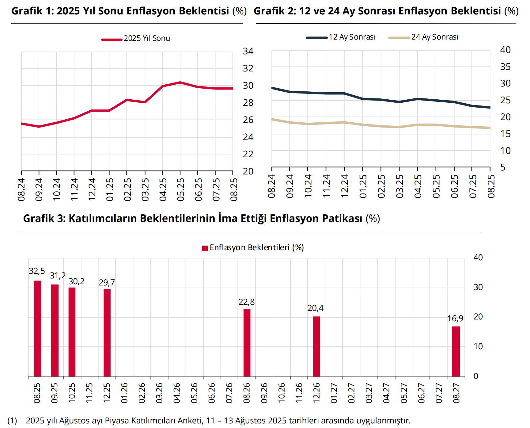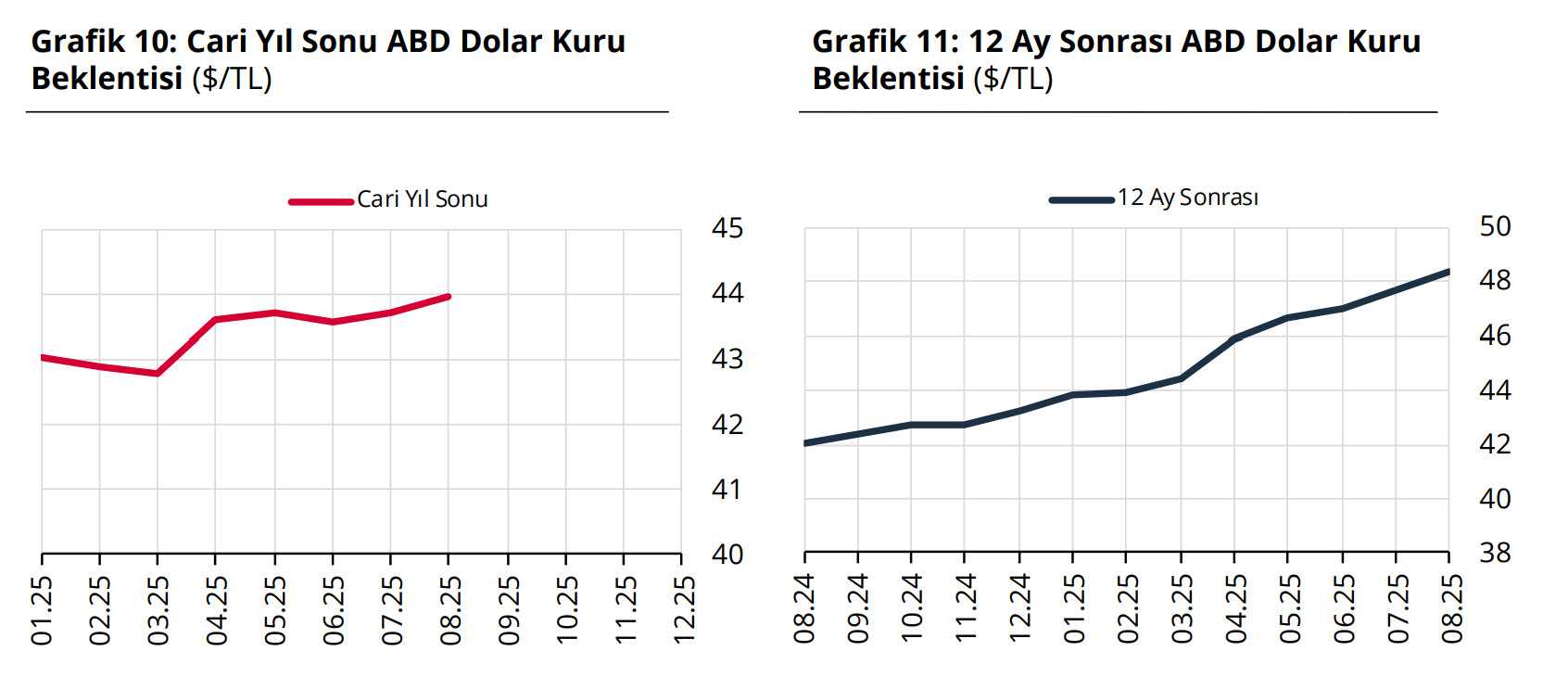 Türkiye Cumhuriyet Merkez Bankası Piyasa Katılımcıları Anketi'ne göre ekonomistlerin yıl sonu dolar kuru tahmini 43,96 liraya yükseldi. Merkez Bankası (TCMB), Piyasa Katılımcıları Anketi'nin ağustos ayı sonuçlarını yayımladı. Anket katılımcılarının 2025 sonu dolar/TL beklentisi 43,96 TL olurken, 12 ay sonrası döviz kuru beklentisi 48,36 TL olarak belirlendi. Bir önceki dönemde beklentiler sırasıyla 43,72 ve 47,70 TL olmuştu. Kaynak: TCMB - Piyasa Katılımcıları Anketi Enflasyon beklentisi Katılımcıların cari yıl sonu tüketici enflasyonu (TÜFE) beklentisi ise bu anket döneminde yüzde 29,69 seviyesinde ölçüldü. Bir önceki ankette bu beklenti yüzde 29,66 olarak belirlenmişti. İlgili ankette 12 ay sonrası TÜFE beklentisi yüzde 22,84, 24 ay sonrası TÜFE beklentisi ise yüzde 16,92 olarak belirlendi. Kaynak: TCMB - Piyasa Katılımcıları Anketi Faiz beklentisi Katılımcıların BİST Repo ve Ters-Repo Pazarı’nda oluşan cari ay sonu gecelik faiz oranı beklentisi de bir önceki anket döneminde yüzde 43,31 iken bu anket döneminde yüzde 42,85 oldu. Önümüzdeki Para Politikası Kurulu toplantısı için TCMB politika faiz oranı beklentisi ise bu anket döneminde yüzde 40 olarak belirlendi. Kaynak: TCMB - Piyasa Katılımcıları Anketi [news_id:781728] [news_id:781637] [news_id:781225]