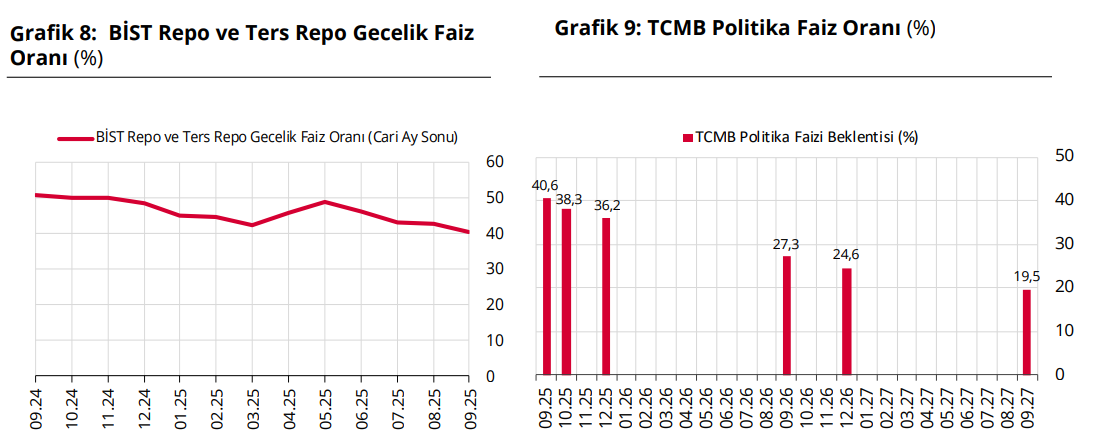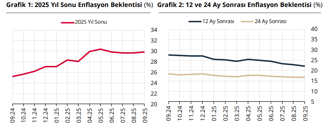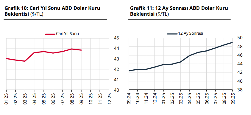 Türkiye Cumhuriyet Merkez Bankası Piyasa Katılımcıları Anketi'ne göre ekonomistlerin yıl sonu dolar kuru tahmini 43,85 liraya geriledi. Merkez Bankası (TCMB), Piyasa Katılımcıları Anketi'nin eylül ayı sonuçlarını yayımladı. Anket katılımcılarının 2025 sonu dolar/TL beklentisi 43,85 TL olurken, 12 ay sonrası döviz kuru beklentisi 48,96 TL olarak belirlendi. Bir önceki dönemde beklentiler sırasıyla 43,96 ve 48,36 TL olmuştu. Kaynak: Piyasa Katılımcıları Anketi Enflasyon beklentisi Katılımcıların cari yıl sonu tüketici enflasyonu (TÜFE) beklentisi ise bu anket döneminde yüzde 29,86 seviyesinde ölçüldü. Bir önceki ankette bu beklenti yüzde 29,69 olarak belirlenmişti. İlgili ankette 12 ay sonrası TÜFE beklentisi yüzde 22,25, 24 ay sonrası TÜFE beklentisi ise yüzde 16,78 olarak belirlendi. Kaynak: Piyasa Katılımcıları Anketi Faiz beklentisi Katılımcıların BİST Repo ve Ters-Repo Pazarı’nda oluşan cari ay sonu gecelik faiz oranı beklentisi de bir önceki anket döneminde yüzde 42,85 iken bu anket döneminde yüzde 40,48 oldu. Kaynak: Piyasa Katılımcıları Anketi [news_id:784288]