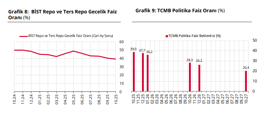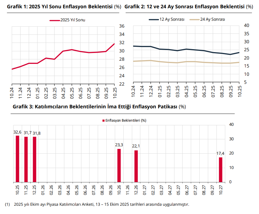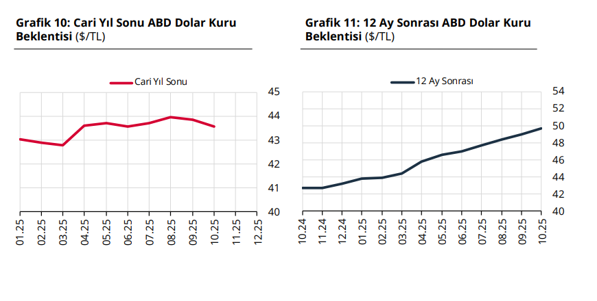 Türkiye Cumhuriyet Merkez Bankası Piyasa Katılımcıları Anketi'ne göre ekonomistlerin yıl sonu dolar kuru tahmini 43,56 liraya geriledi. Merkez Bankası (TCMB), Piyasa Katılımcıları Anketi'nin ekim ayı sonuçlarını yayımladı. Anket katılımcılarının 2025 sonu dolar/TL beklentisi 43,56 TL olurken, 12 ay sonrası döviz kuru beklentisi 49,75 TL olarak belirlendi. Bir önceki dönemde beklentiler sırasıyla 43,85 ve 48,96 TL olmuştu. Kaynak: Piyasa Katılımcıları Anketi Enflasyon beklentisi Katılımcıların cari yıl sonu tüketici enflasyonu (TÜFE) beklentisi ise bu anket döneminde yüzde 31,77 seviyesinde ölçüldü. Bir önceki ankette bu beklenti yüzde 29,86 olarak belirlenmişti. İlgili ankette 12 ay sonrası TÜFE beklentisi yüzde 23,26, 24 ay sonrası TÜFE beklentisi ise yüzde 17,36 olarak belirlendi. Kaynak: Piyasa Katılımcıları Anketi Faiz beklentisi Katılımcıların BİST Repo ve Ters-Repo Pazarı’nda oluşan cari ay sonu gecelik faiz oranı beklentisi de bir önceki anket döneminde yüzde 40,48 iken bu anket döneminde yüzde 39,15 oldu. Ekim ayı Para Politikası Kurulu toplantısı için TCMB politika faiz oranı beklentisi bu anket döneminde yüzde 39,00 olarak belirlendi. Kaynak: Piyasa Katılımcıları Anketi [news_id:787443] [news_id:788438] [news_id:787667]