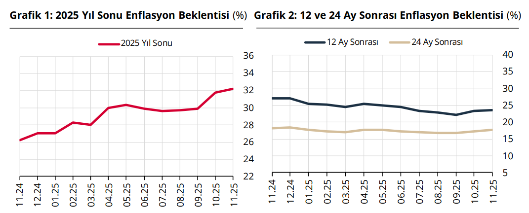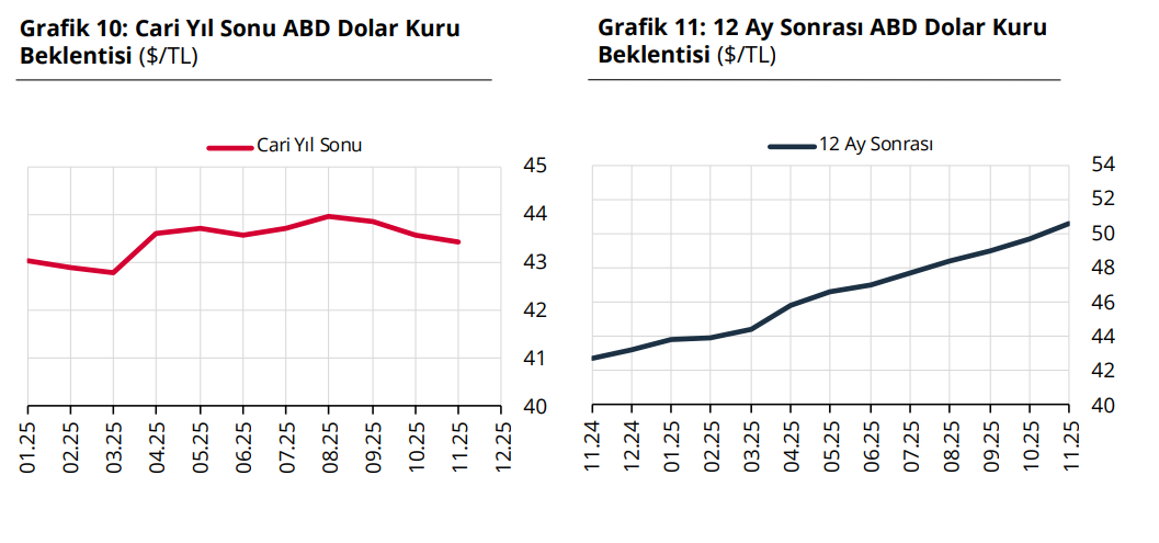 Türkiye Cumhuriyet Merkez Bankası Piyasa Katılımcıları Anketi'ne göre ekonomistlerin yıl sonu dolar kuru tahmini 43,42 liraya geriledi. Merkez Bankası (TCMB), Piyasa Katılımcıları Anketi'nin kasım ayı sonuçlarını yayımladı. Anket katılımcılarının 2025 sonu dolar/TL beklentisi 43,42 TL olurken, 12 ay sonrası döviz kuru beklentisi 50,62 TL olarak belirlendi. Bir önceki dönemde beklentiler sırasıyla 43,56 ve 49,75 TL olmuştu. [news_id:791697] Enflasyon beklentisi Katılımcıların cari yıl sonu tüketici enflasyonu (TÜFE) beklentisi ise bu anket döneminde yüzde 32,20 seviyesinde ölçüldü. Bir önceki ankette bu beklenti yüzde 31,77 olarak belirlenmişti. İlgili ankette 12 ay sonrası TÜFE beklentisi yüzde 23,49, 24 ay sonrası TÜFE beklentisi ise yüzde 17,69 olarak belirlendi. Faiz beklentisi Katılımcıların BİST Repo ve Ters-Repo Pazarı’nda oluşan cari ay sonu gecelik faiz oranı beklentisi bir önceki anket döneminde yüzde 39,15 iken bu anket döneminde yüzde 39,35 oldu. Aralık ayı Para Politikası Kurulu toplantısı için TCMB politika faiz oranı beklentisi bu anket döneminde yüzde 38,28 olarak gerçekleşti. Kaynak: TCMB Piyasa Katılımcıları Anketi