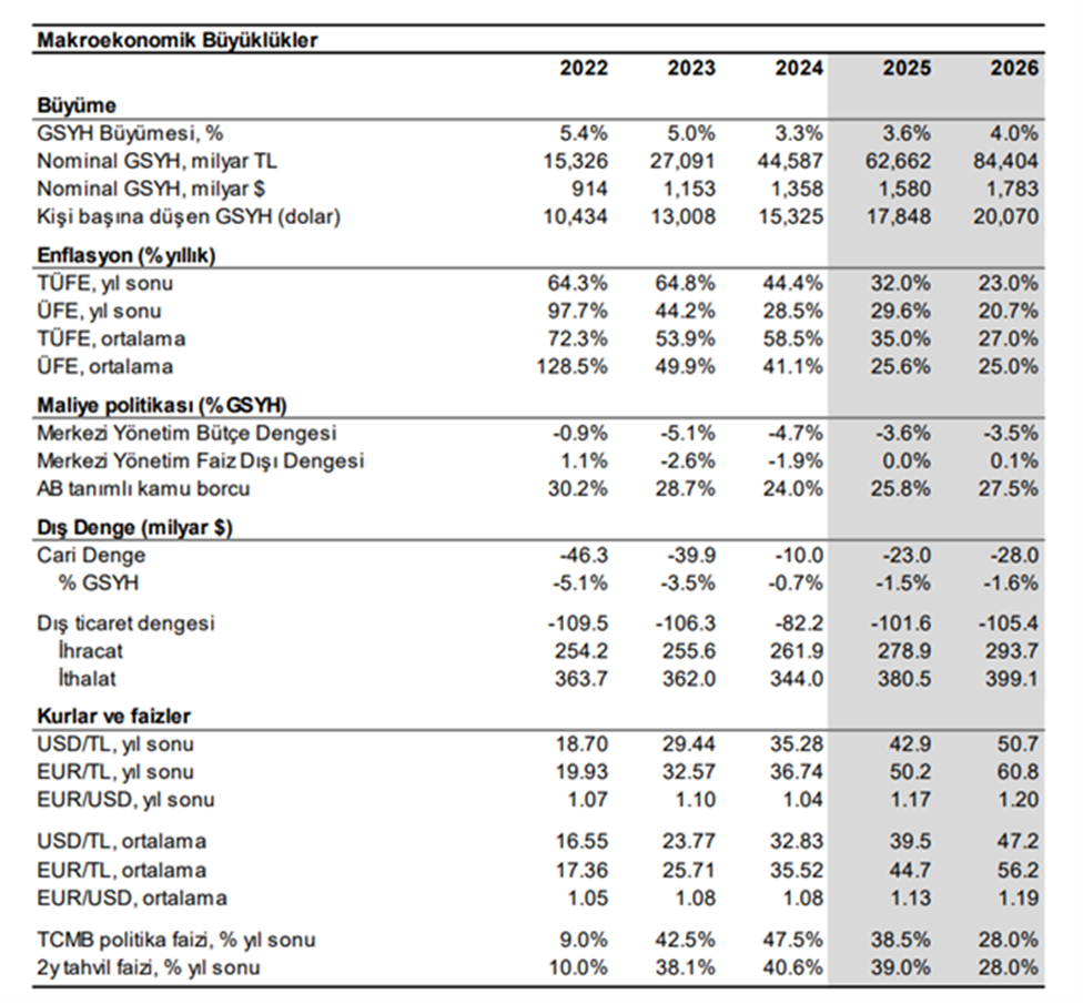QNB ekonomistleri tarafından hazırlanan raporda, Türkiye ekonomisine yönelik 2025 ve 2026 sonu beklentileri açıklandı. İşte ekonomistlerin dolar, euro, faiz ve enflasyonda son tahminleri.. QNB, 2025 yılı Kasım ayı "Türkiye'nin Makroekonomik Görünümü" raporunu yayımladı. Raporda bankanın mevcut gelişmeler ışığında 2025 ve 2026 sonuna yönelik tahminleri duyuruldu. Bankanın ekonomik araştırmalar bölümünü tarafından hazırlanan raporda, dolar tahminleri 2025 sonu için 42,9 lira, 2026 sonu için 50,7 lira oldu. Ekonomistlerin euro tahminleri ise 2025 sonu için 50,2 lira, 2026 sonu için 60,8 lira olarak belirlendi. [news_id:787667] Ekonomistlerin politika faizi tahmini de 2025 sonu için yüzde 38,5, 2026 sonu için yüzde 28 olarak açıklandı. Raporda yıllık tüketici enflasyonu tahmini 2025 sonu için yüzde 32,0, 2026 sonu için yüzde 23,0 olarak duyuruldu. Cari açık tahmininin 2025'te 23 milyar dolar, 2026'da yüzde 28 milyar dolar olarak öngörüldüğü raporda, cari açığın milli gelire oranının söz konusu yıllarda sırasıyla yüzde -1,5 ve yüzde -1,6 olacağı tahmin edildi. Bütçe açığının milli gelire oranının ise 2025'te yüzde 3,6, 2026'da yüzde 3,5 olmasının beklendiği paylaşıldı. Kaynak: QNB- Türkiye'nin Makroekonomik Görünümü Raporu [news_id:791580]