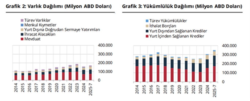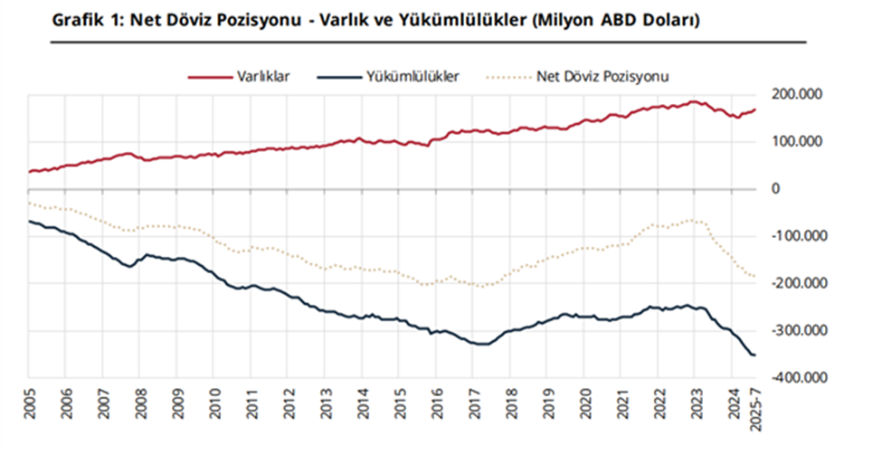 Finansal kesim dışındaki firmaların net döviz açığı temmuzda 3 milyar 779 miyon dolar azalarak 182 milyar 629 milyon dolara geriledi. Böylece reel sektörün döviz açığı 7 yılın zirvesinden dönmüş oldu. Türkiye Cumhuriyet Merkez Bankası (TCMB) verilerine göre, temmuzda önceki aya kıyasla finansal kesim dışındaki firmaların döviz varlıkları 3.796 milyon dolar artarken, yükümlülükleri ise 17 milyon dolar artış gösterdi. Söz konusu firmaların net döviz pozisyonu açığı temmuzda 3 milyar 779 miyon dolar azalarak 182 milyar 629 milyon dolara geriledi. Eylül 2018'den bu yana en yüksek düzeye ulaşan reel sektörün döviz açığı böylelikle 7 yılın zirvesinden gerilemiş oldu. Temmuz 2025 dönemi varlık dağılımı incelendiğinde; bir önceki aya göre ihracat alacakları, yurt içi bankalardaki mevduat, yurt dışına doğrudan sermaye yatırımları, türev varlıklar ve menkul kıymetler sırasıyla 1.519 milyon dolar, 984 milyon dolar, 767 milyon dolar, 381 milyon dolar ve 145 milyon dolar artmış ve bunlara bağlı olarak varlıklar 3.796 milyon dolar artmıştır. Yükümlülük dağılımında ise bir önceki aya göre ithalat borçları, türev yükümlülükler ve yurt içinden sağlanan nakdi krediler sırasıyla 766 milyon dolar, 244 milyon dolar ve 26 milyon dolar artarken yurt dışından sağlanan krediler 1.020 milyon dolar azalmış ve bunlara bağlı olarak yükümlülükler 17 milyon dolar artmıştır.